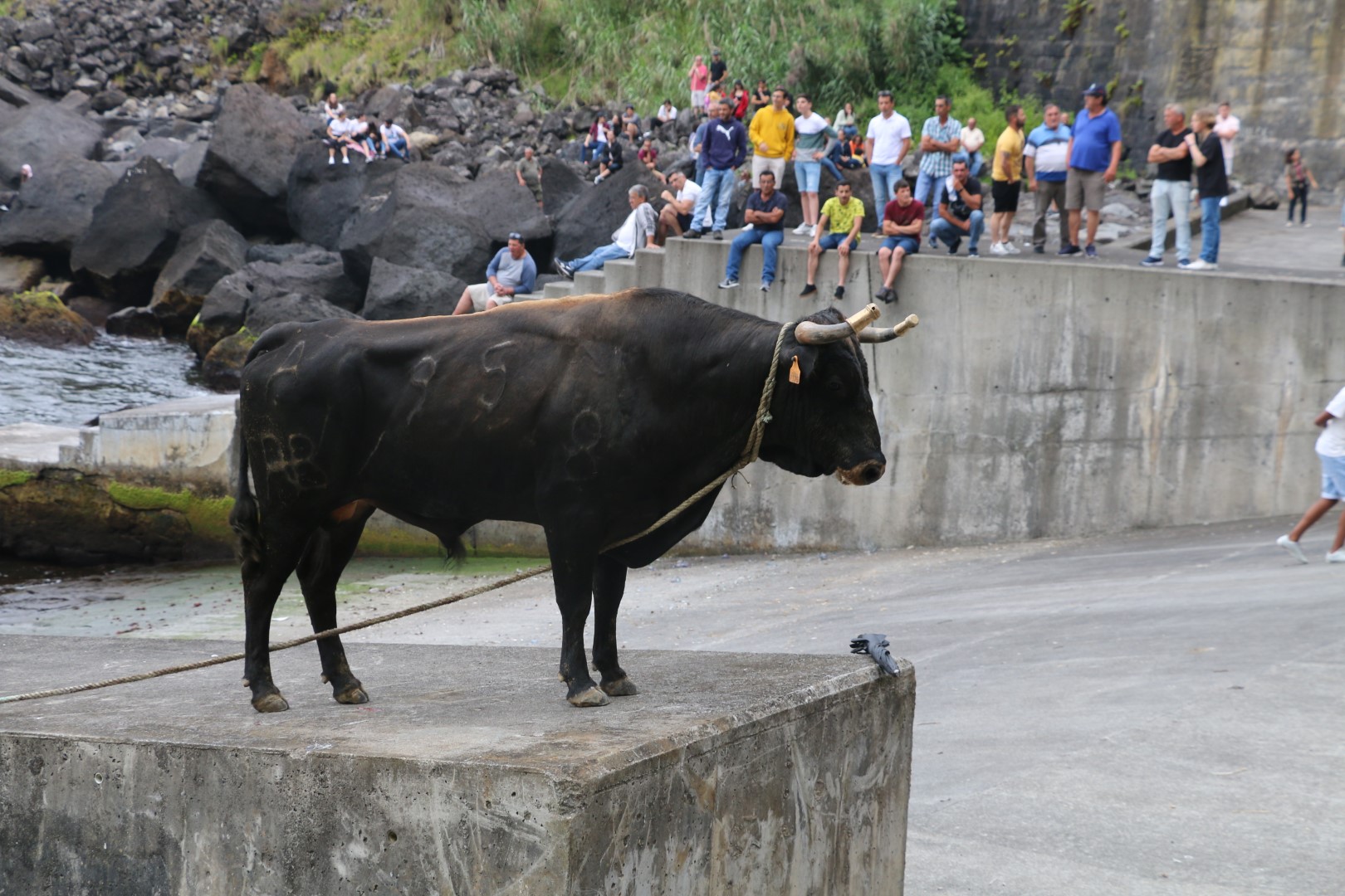 Bis wir denn endlich einen Mann entdecken, der sein Haus verbarrikadiert, oder baut er diese Vorrichtung wieder ab? Egal, unser Kommunikationsexperte wird gleich auf ihn gehetzt! Und, tatsächlich, es soll heute stattfinden! Yippieiyeah. Da hinten nach rechts in die Seitenstraße rein. Dort werden gleich die beiden nächsten angehauen. Ebenfalls super freundliche Leute; ein Mann mit seinem Neffen, beide sprechen sehr gut Englisch. Beide gehen mit uns kurz den Weg zurück, um uns zu zeigen, wo was stattfindet, wie das abläuft und wo man noch etwas zu trinken bekommt u.s.w. Da wir sowas noch nie erlebt haben, sind die Erklärungen dennoch nicht so ganz klar. Was aber klar ist, ist, dass sich das Ganze dort unten im Fischereihafen abspielen soll. Hier ist jetzt auch schon deutlich mehr Publikumsverkehr, obwohl es ja erst in etwa 3 Stunden anfangen soll. Aber die ersten Zuschauer haben sich schon ihre Plätze reserviert. Sowohl hier oben am Weg, als auch unten im Hafen. Wir können oben vom Weg, wo schon die ersten Fressbuden stehen, nach unten in den Fischereihafen sehen. Von hier oben hat man einen guten Überblick und die ersten Leute stehen auch schon am Straßenrand. Hmmm, aber dort unten direkt vorne am Hafen, da sind zwei Mauern, die hinterste ist schon voll, entweder mit Zuschauern oder mit, wie es scheint Platzhaltern – also nicht nur die Germanen und die Engländer reservieren ihren Poolplatz, auch die Portugiesen tun dies ;-)) Die Mauer ganz vorne ist aber noch größtenteils leer. Wie holen uns schnell ein Stück Stier vom Grill und marschieren fix runter. Wir bekommen auch den ersehnten Platz und können unser Glück kaum fassen. Der Mauerplatz kann doch nicht sicher sein, wieso sonst sitzt hier kaum jemand? Hier, direkt in der ersten Reihe? Wir schauen uns um und fragen die Zuschauer hinter uns, ob diese Sitze sicher seien. Jaja, kommt es zurück. Wahrscheinlich ist es Ziel, jedes Jahr ein paar doofe Touris den Stieren zu opfern. Und dieses Jahr sind wir dran! Wir haben uns kaum niedergelassen, da gesellt sich auch schon ein ein weiterer Gast zu uns und fängt ein Gespräch an. Unsere erste Frage lautet auch hier, ob diese Plätze sicher seien, haben wir doch noch immer keine Ahnung, wie das hier so alles ablaufen soll. Ja, ja, alles gut. Er spricht ein hervorragendes Englisch mit einem deutlichen portugiesischen Akzent. Er ist von hier. Aber sein Verhalten, seine Kleidung (obwohl ganz normale Kleidung), seine Bewegungen sind merkwürdig amerikanisch, selbst Kaugummi kaut er wie ich das nur von Amis kenne. Die ganze Person kann ich nicht in Einklang bringen: Ami oder Portugiese? Es stellt sich dann heraus, dass er in jungen Jahren nach Amerika ausgewandert ist und jetzt entweder für die Ferien oder für immer wieder zurück in die Heimat gekommen ist. Aber suuuper freundlich; so wie ich das immer wieder von und bei Portugiesen erlebe!! Keine Nation hat freundlichere Menschen als die Portugiesen!! (OK, alle Nationen dieser Erde habe ich noch nicht kennengelernt, aber die, die ich kennenlernen durfte, sind eindeutig die Portugiesen!) Neben Yoshi setzt sich eine Frau, die, wie ich später herausfinde, ebenfalls aus Amerika ist und jetzt hier in Urlaub ist. Sie ist in Massachusetts geboren, ihre Eltern waren dorthin ausgewandert. Und dabei dachte ich, dass alle auswandernden Portugiesen nur nach Luxemburg kämen. ;-) Tatsächlich scheinen die der Azoren eher in die Staaten ausgewandert zu sein.