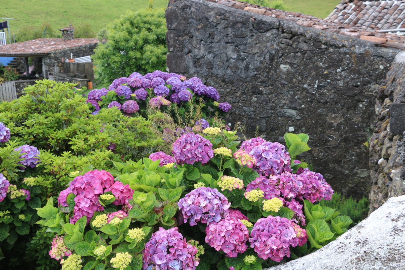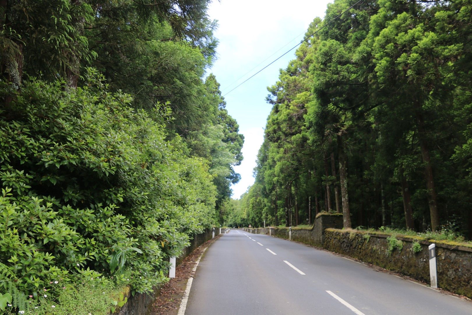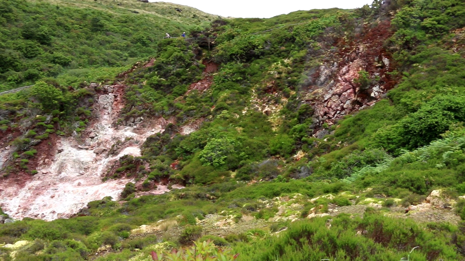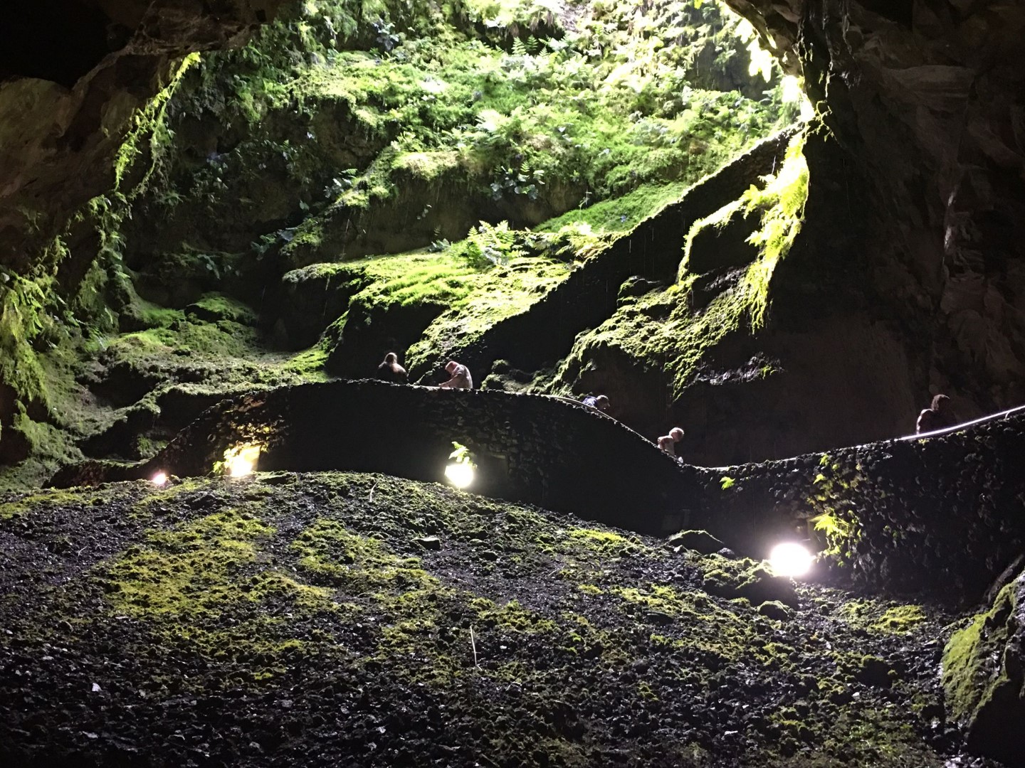 Dann kann es so richtig losgehen. Bergauf, bergauf, bergauf, hinter jeder Kurve der bekannte Ausblick: bergauf. Vorbei an schönen Hortensienbüschen, Weiden mit Stieren, die für die „Stierkämpfe“ hier gezüchtet werden. Und natürlich viel Natur. Die 11 km haben wir bald hinter uns gebracht, aber von der Grotte ist weit und breit noch nichts zu sehen! Es sind noch ein paar Kilometer. 2 km vor dem Ziel geht ein Abzweig mit dem Hinweis 0,7 km bis zu den Schwefelquellen. Obwohl alle platt sind, nehmen wir die auch noch mit. Der Weg um die Hauptquelle ist schön durch wilde ursprüngliche Natur angelegt, aber rauchen tut eine Nebenquelle gleich zu Beginn des Weges, mehr. Nach insgesamt fast 20 km, wenn man die Höhenmeter mit einbezieht, haben wir unser Ziel, ENDLICH, erreicht. Aber es hat sich wirklich gelohnt! Die Grotte ist ein echter Hingucker! Auch werden Stalaktiten in unserem Tourguide angepriesen. Diese jedoch lohnen nicht die Tinte für den Druck, habe ich in Bunkern des 2. Weltkrieges schon längere gesehen. Aber deswegen geht man auch nicht dorthin. Der Blick nach oben beim Abstieg ist genauso spektakulär wie die Innenausbuchtungen. Kann ich nur empfehlen.