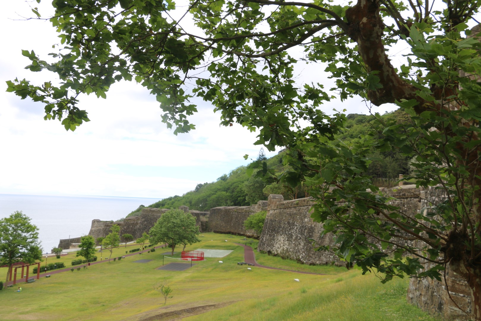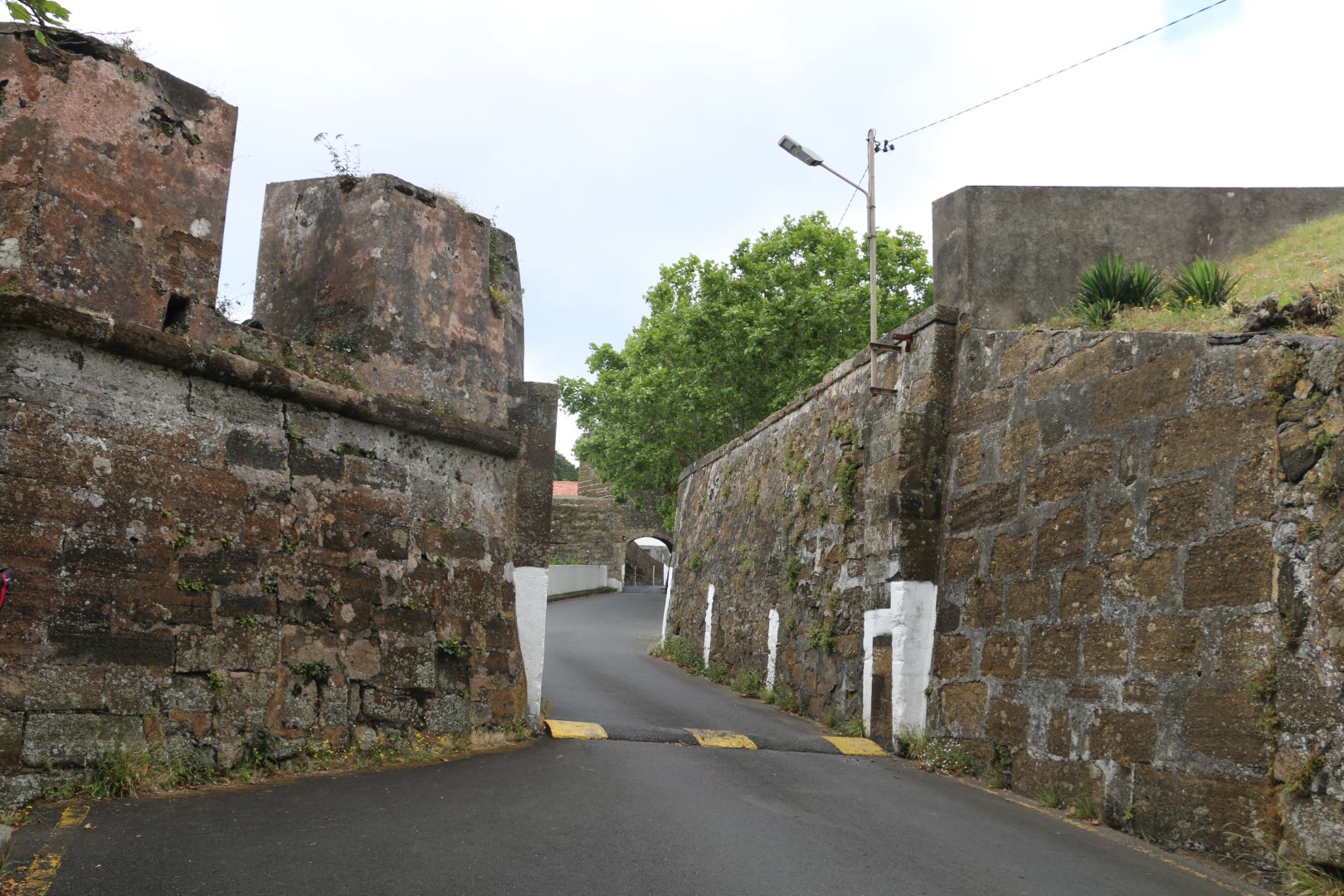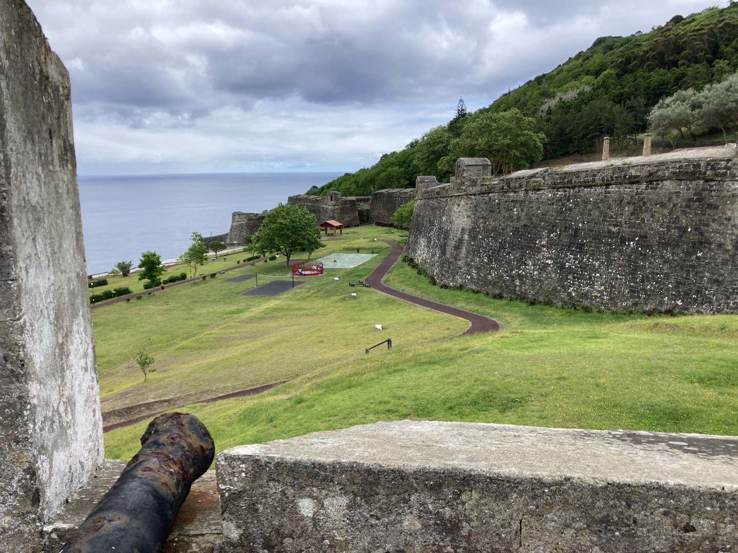 Dann zieht es meine beiden nach Norden. Irgendwann sage ich dazu: Nun sind wir so weit, da können wir auf die vorgelagerte Halbinsel. Ach – da wollen beide hin, nur haben sie etwas die Richtung verpeilt. Monte Brasil heißt sie. Und das wird dann in Steigung und Höhenmeter umgesetzt. Am Einstieg – und da haben wir schon die ersten Höhenmeter in den Knochen – ist eine Kaserne. Der Wachhabende grüßt und militärisch. Michèle grüßt mit Links zurück. Entsetzensaufschrei von Yoshi und mir. Also wird der Fotoapparat in die Linke genommen und mit der Rechten gegrüßt. Nun freut sich der Wachhabende mächtig über uns.
