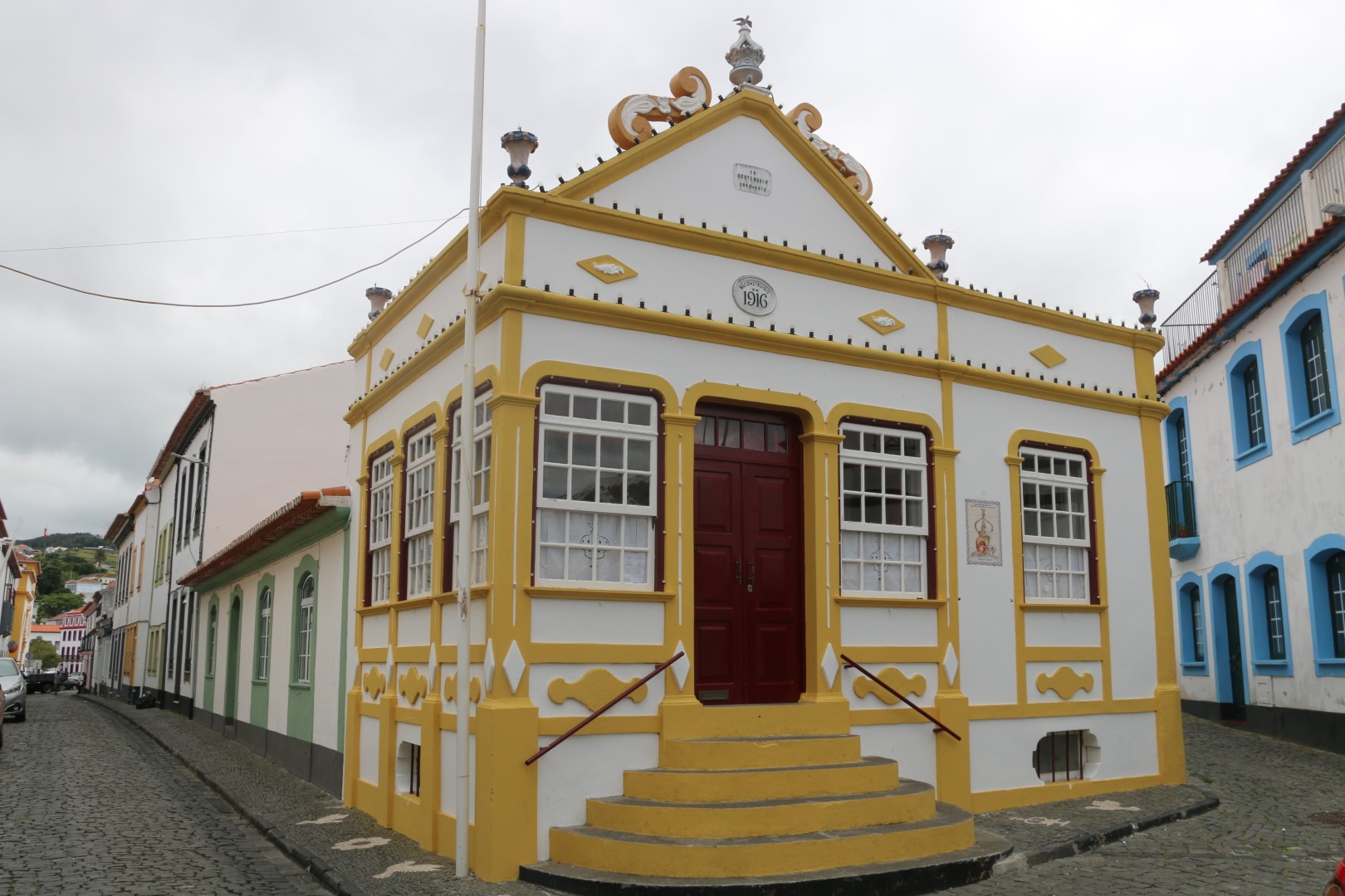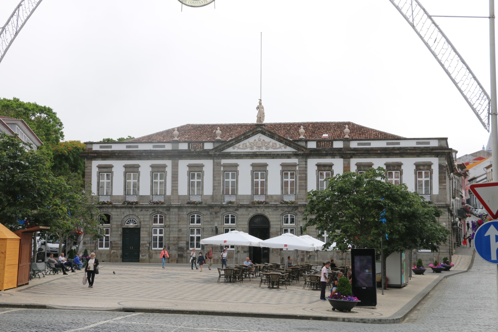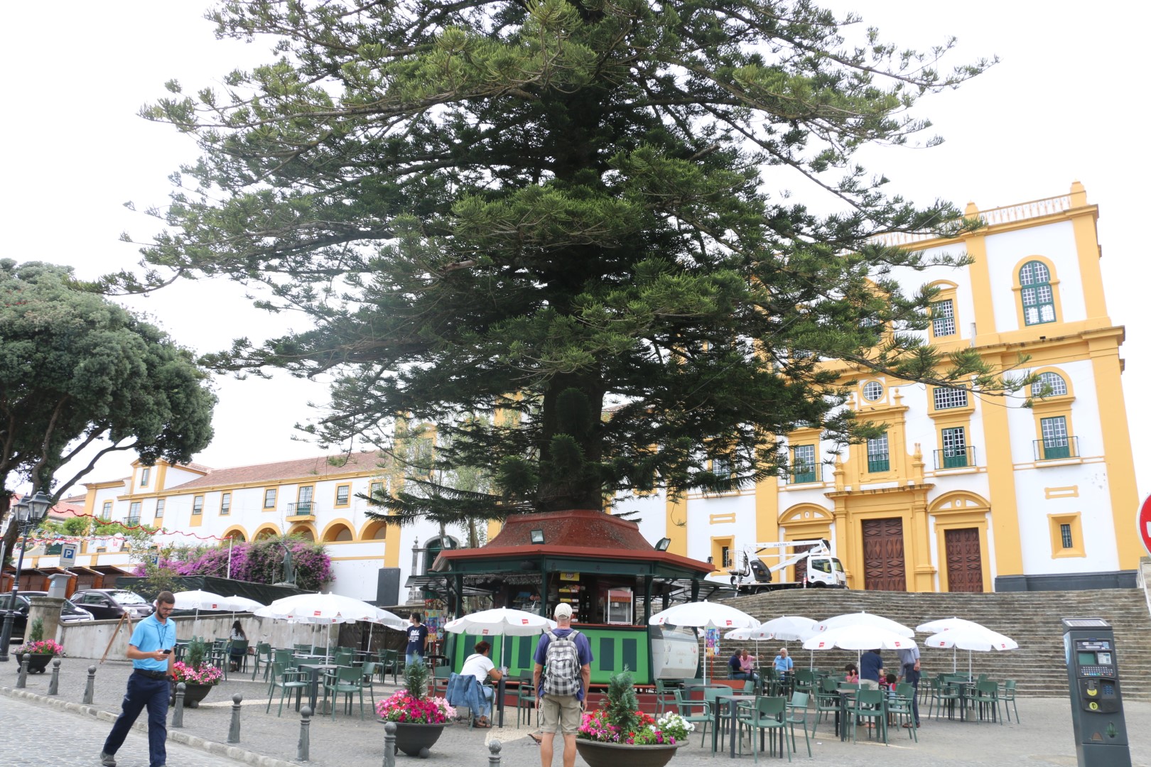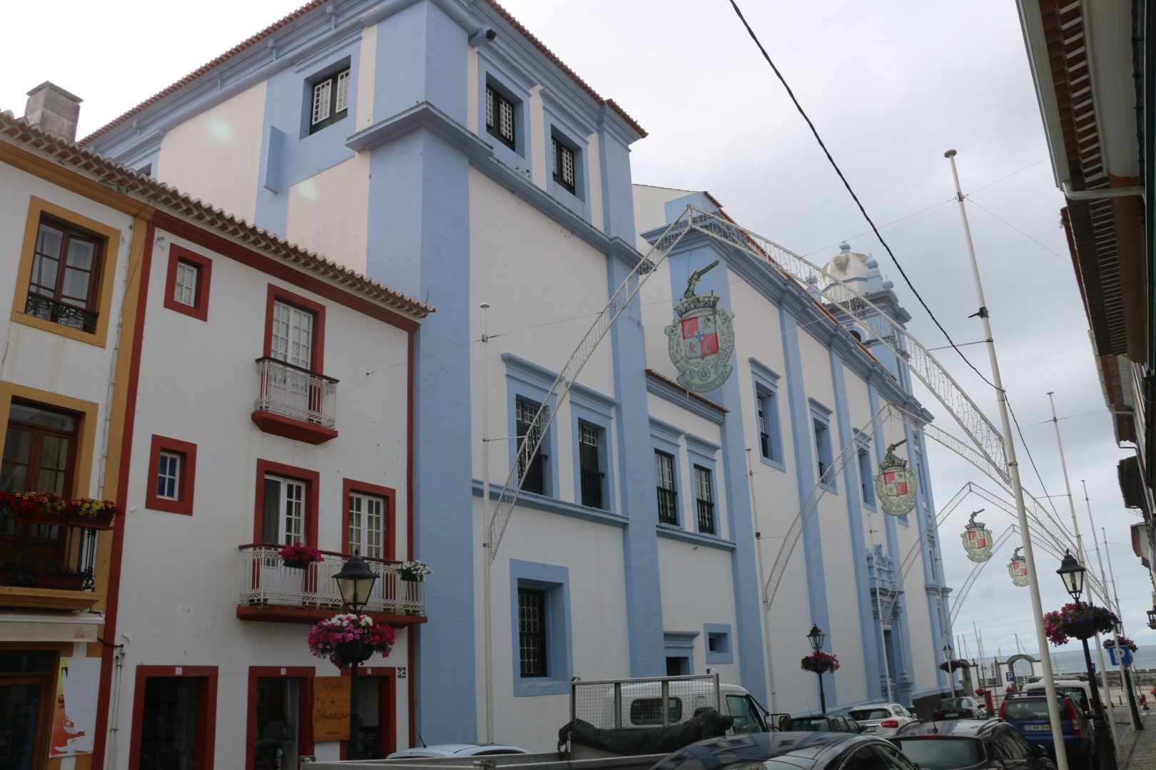 Nach einer kleinen Stärkung am nun offenen Hafen-Cafe geht es zur Besichtigung einiger weiterer Punkte wieder mal HOCH. Als hätten wir heute noch nicht genug Höhenmeter gemacht. Und dann gibt es – runter – und wieder hoch – den Palast der General-Kapitäne. Ein großes Haus, das zweimal auch Königspalast war. Denn zweimal war Angra Hauptstadt von Portugal. Einmal zweieinhalb Jahre, beim nächsten Mal dann nur wenige Monate. Aber dem Palast ist es anzusehen. Wirklich schick! Und: Wir sind wieder Rentner mit 1 € Eintritt. Es gibt auch eine halbe Führung für uns. Die Aufpasserin möchte uns wohl rechtzeitig raus haben und führt uns deshalb zu allen interessanten Ecke. Ach – kommen Sie schnell, dann zeig ich Ihnen noch die Kapelle…. Kaum sind wir raus, klappen die Eingangstüren zu.