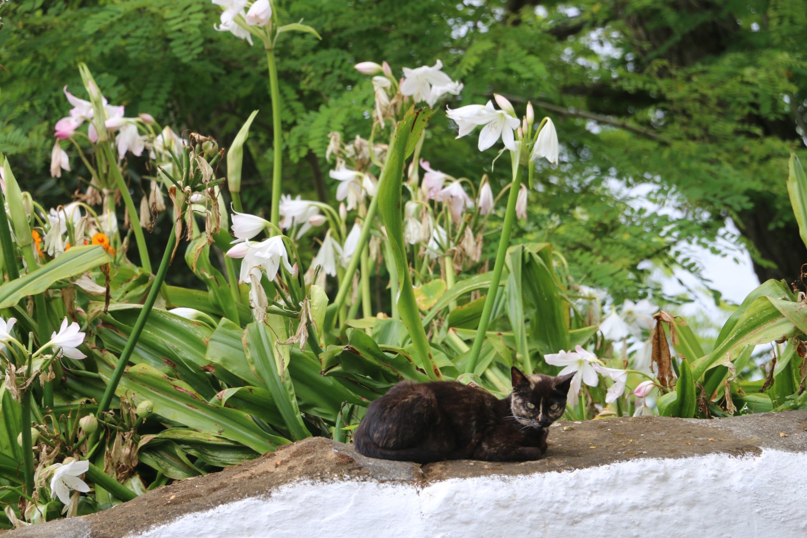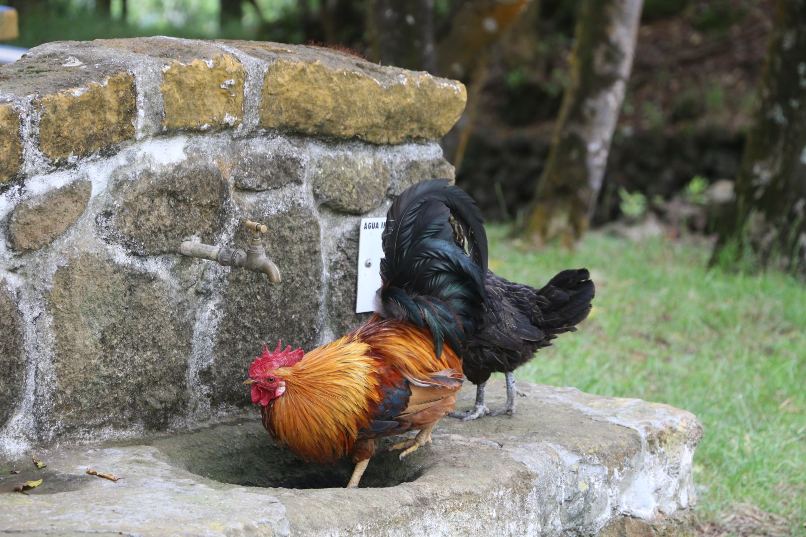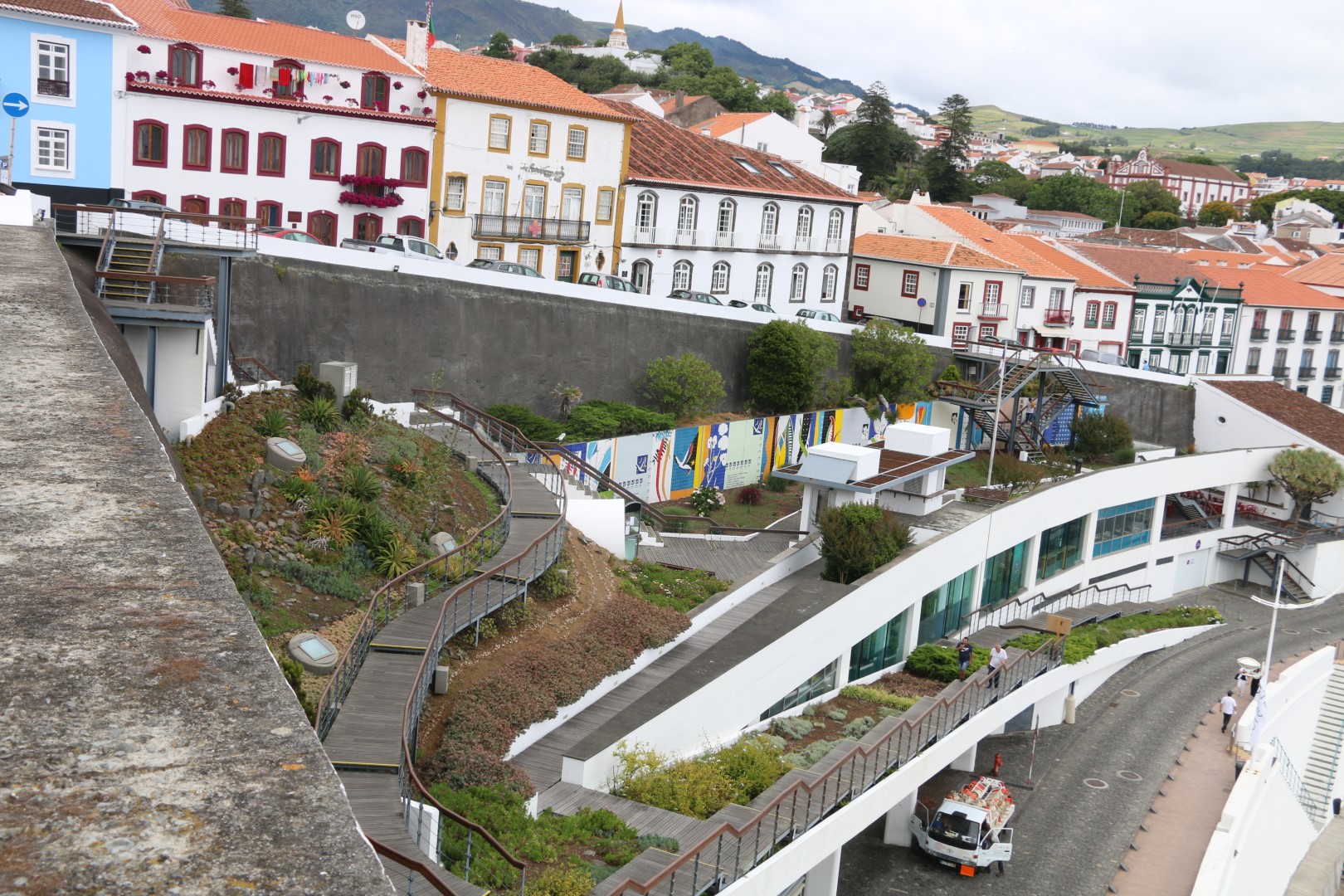 Eine sehr nette Holztreppe bringt uns dann endgültig wieder runter. Also – die Azoren (Azories?) machen das wirklich wunderschön. Sie hatten schon oben am Fuße des Monte Brasil einen tollen Picknick-Platz mit festen Grills, Bänken und Tischen, die gut genutzt wurden. Da lebten auch „wilde“ Hühner und Enten. Dazu gibt es da eine Kolonie Katzen. Ein Schild verrät: Sie werden hier entwurmt, geimpft und sterilisiert. Man darf auch gerne eine adoptieren. Aber füttern solle man sie nicht!