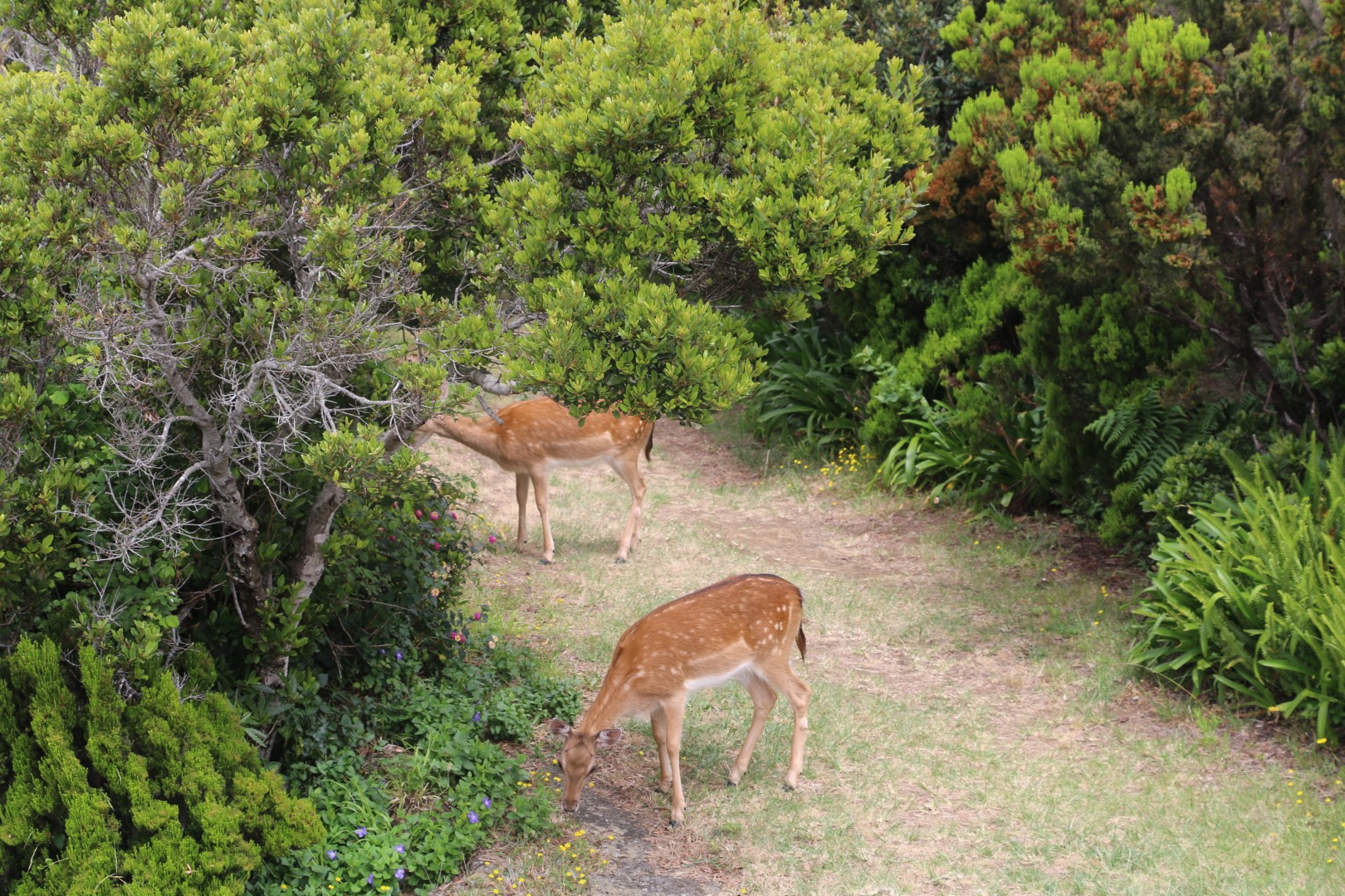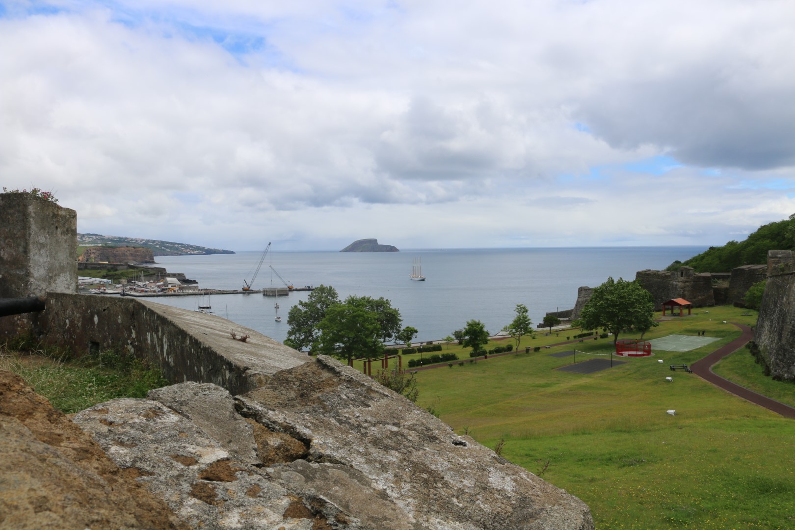 Weiter geht es bergan. Und dann wird es steil. Die Sonne hält sich zurück, trotzdem ist es uns warm. Aber die Aussichten sind es wert. Zunächst wir das Einlaufen und das Ankermanöver der „Santa Maria Magdalena“ – einem portugiesischen Viermaster-Ausbildungsschiff beobachtet. Dann gibt es einen prima Blick nach Sao Jorges und Pico. Und zu guter Letzt dann einen Blick in den Caldeira, der den Monte Brasil gebildet hat. An der Signalstation kommen uns zwei – Rehe (!) entgegen. Vorsichtig stehen wir an der Seite, sie gehen die letzten Meter etwas vorsichtig, kaum sind sie querab geht es mit einigem Galopp bis auf 10 Meter hinter uns. Dann ist der Abstand wohl wieder groß genug, um sich um das Grünzeug am Wegesrand zu kümmern.