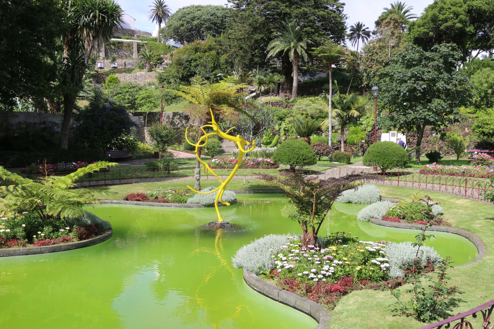 Zu guter Letzt gibt es noch den städtischen botanischen Garten. Nicht besonders groß, aber mit exotischen Pflanzen aus China. Das behaupten jedenfalls die Schilder. Und denen will ich mal glauben! An einem Wasserfall machen wir kleine Pause, denn entgegen der Vorhersage scheint nun die Sonne. Und dann wird es auch auf den Azoren im Juli gut warm. Den 18:00 Uhr Bus bekommen wir problemlos und sind dann um 19:00 Uhr wieder an Bord! Und platt. Etwas essen, telefonieren, Tageschau gucken und einen ersten Blick durch die 142 Fotos. Da fällt dann die Auswahl schwer, was auf die Homepage kommen soll!