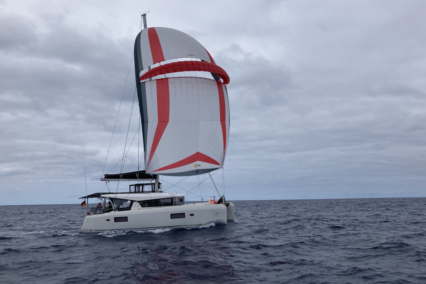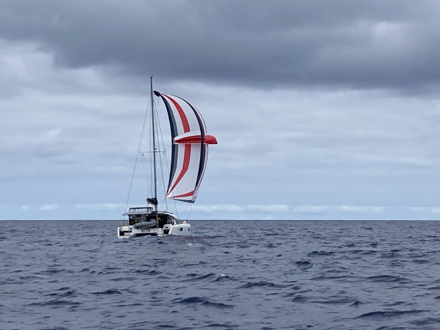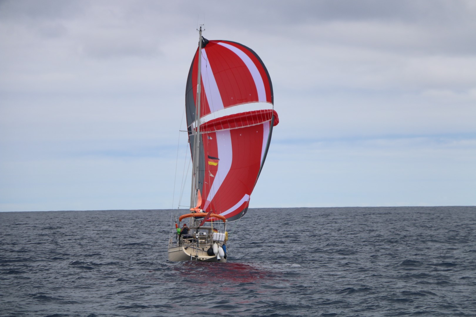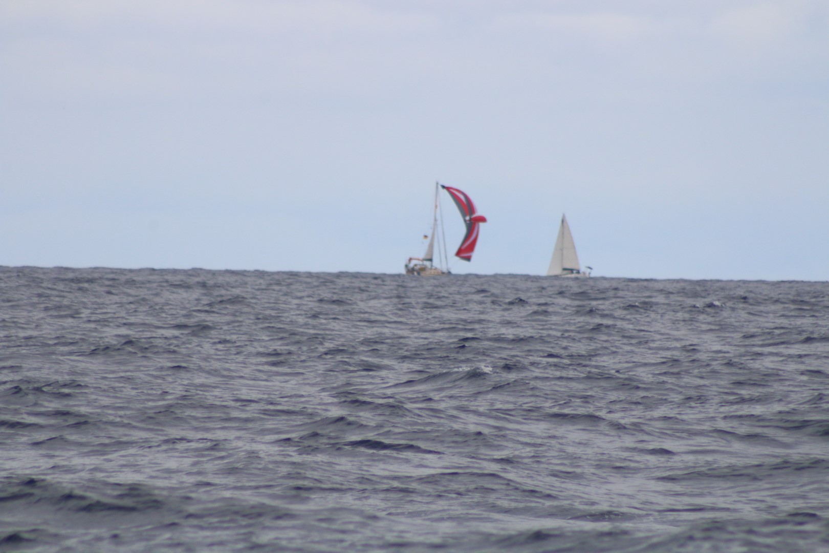 Bald zeigt sich die DaYo voraus. Yoshi hat auch seinen ParaSailor rausgezogen. Das erste Mal allein! Wir sind mächtig stolz auf ihn. Denn es könnte sein, dass er sich da von uns hat motivieren lassen. Nachteil: Wir holen nur sehr langsam auf. So dauert es 4 Stunden, bis wir in „haben“. Es setzt eine Foto-Orgie ein. Jeder will ja mal ein schönes Bild von seinem Schiffchen unter Segel haben!