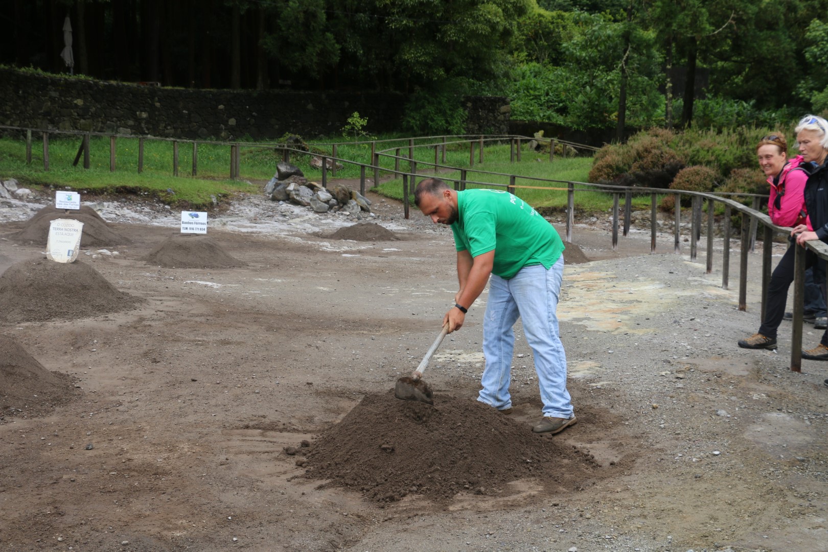 Zunächst geht es bergauf! Oh weh, denke ich – dann wird der Abstieg zum See ja noch tiefer! Und weiter bergauf. Bis wir dann vor uns den See sehen: Ja – der liegt deutlich ÜBER der Stadt! Und an seinen Hängen tritt auch wieder Dampf aus der Erde und hängt über den Hängen des Kraterrandes! Ein Viertel um den See herum und wir werden um 3 € Eintritt gebeten. Gut – nachdem Michèle sich so über die fehlende Geschäftstüchtigkeit der Kaffee-Plantagen-Betreiber beschwert hat: Hier ist man geschäftstüchtig! Wir sollen uns beeilen: Die Töpfe werden gerade ausgegraben! ???? JA – die lokal ansässigen Restaurants haben hier Löcher, in die sie Eintöpfe einstellen, die dann 24 Stunden garen und am nächsten Tag „geerntet“ werden. Gut – es handelt sich um mittlere Beton-Ringe im Boden, die durch einen Holzdeckel verschlossen und dann mit Erde bedeckt werden. Aber es ist schon interessant, Erde zur Seite, Deckel auf, Topf mit 2 Mann rausheben, neuen Topf rein, Deckel drauf, Erde rüber. Topf in eine Art Golfkarren und ab geht es zum Restaurant, wo der Inhalt zu horrendem Geld – also für azorische Verhältnisse – verkauft werden.