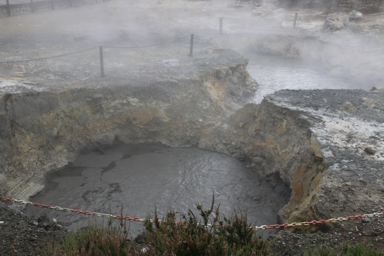 Um die Ecke das Cafe – hat zu. Der 7-Uhr-Bus ist eindeutig zu früh, der Ort ist auf den 12-Uhr-Bus eingerichtet. Aber hinter dem Cafe stehen die ersten Wolken in der Luft: Die Erde dampft! Und ab da steht der Fotoapparat nicht still. Überall quillt warmes Wasser aus dem Gestein oder es sprudelt gleich oder dampft! Und zischt und blubbert! Schon beeindruckend. Der Schwefel-Gestank hält sich in Grenzen, nicht schön, aber weit weg von eklig und unerträglich!