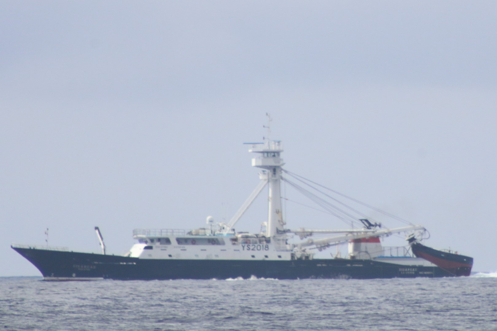 Am Vormittag überholt uns ein „Segelschiff“. Die SISARGAS. Anhand der MMSI und des Rufzeichens können wir sagen: El Salvador! Und es ist eindeutig KEIN Segelschiff, wie im AIS angegeben. Eher sieht es nach einem modernen Walfänger aus. Der Ausguck, das Gestell auf dem Vorschiff, die Rampe hinten, die jetzt mit einem Phram belegt ist….