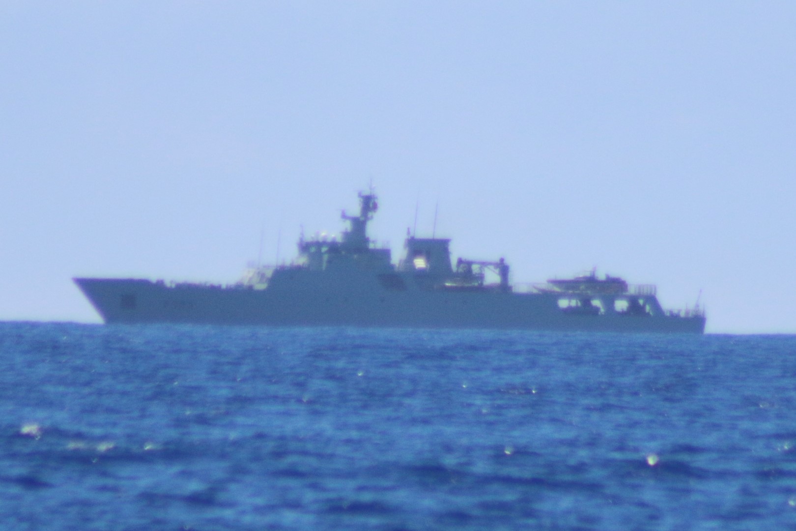 Und gegen Mittag steht ein Krieger an Steuerbord. „P 343“ deute ich in die Vergrößerung. Auf dem, was ich als Hubschrauber-Landedeck betrachte, steht ein großes Beiboot. Ein eigener Kran und keine erkennbare Bewaffnung deuten für mich eher auf einen Versorger hin. Hier sind mal alle mitlesenden Marine-Experten aufgefordert, mehr Informationen beizusteuern, gerne auch Spekulationen!