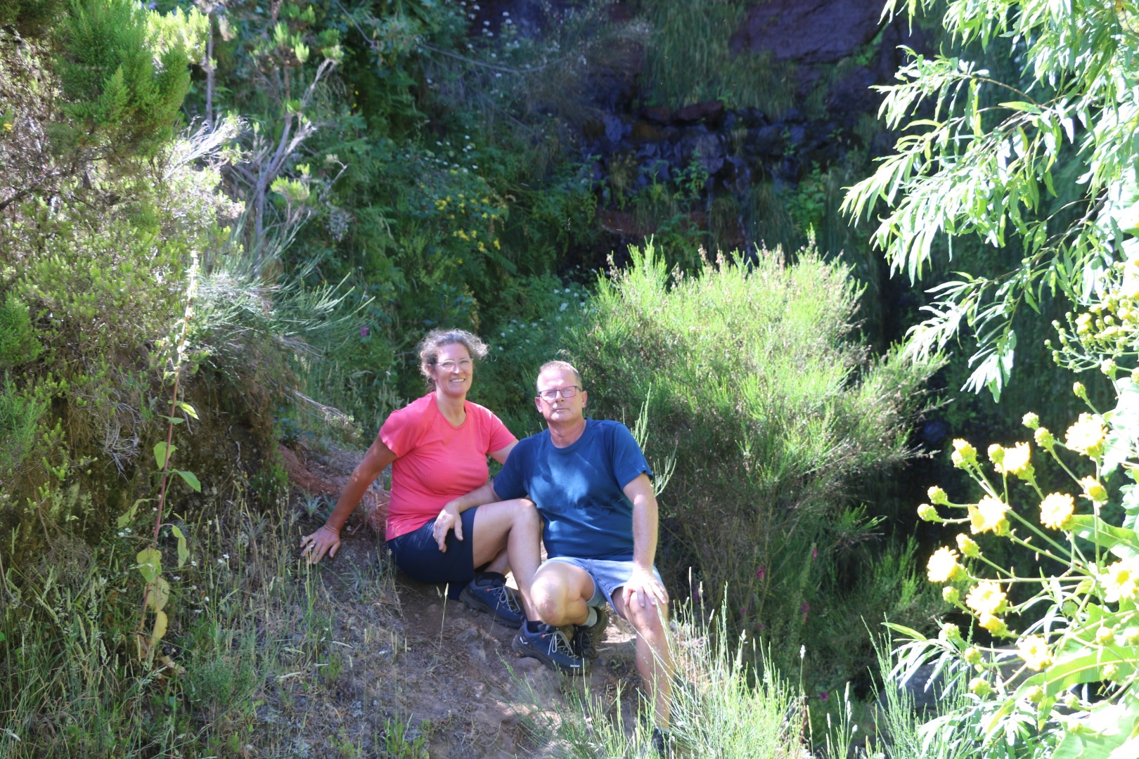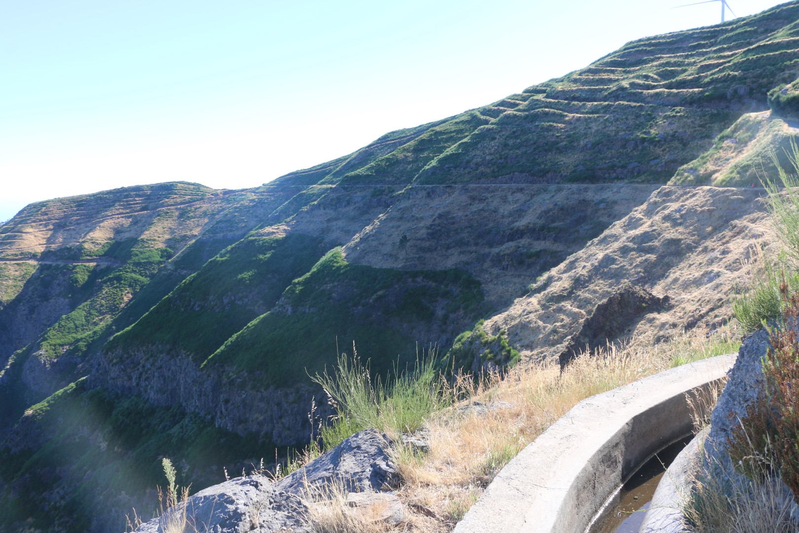 Die Levada hat einen Nachteil: Keine Bäume. Ansonsten ist – für mich relativ große Überraschung – sie voll im echten Betrieb. Die ganze Strecke ist der eigentliche Kanal mit Zement glatt verputzt. Das Wasser fließt, wenn auch recht wenig Volumen. Da es inzwischen deutlich Nachmittag ist, kommen wir mit der Hitze gut zurecht. Wir sind so auf ca. 1400 Meter und – wie gestern – über den Wolken. Die Sonne sticht und ich bin froh, den Schlapphut mit Nackenschutz auf zu haben. Tolle Aussichten und viele Kleinigkeiten begleiten uns auf dem Weg. Und am Umkehrpunkt dann wirklich ein aktiver Wasserfall. Da wird eine längere Rast und natürlich Foto-Stopp eingelegt. Geht es zurück wirklich schneller? Gefühlt zumindest. Gegen 19:00 Uhr sind wir wieder am Wagen. Und entschließen uns, heute gibt es Abendbrot im Restaurant. In Canical, dem letzten Städtchen vor Quinta Do Lorde steuern wir ein „portugiesisches“ Restaurant an. Leider eher ein Fischrestaurant ist nicht viel Auswahl für Michèle dabei. Und das was sie dann findet – ist heute aus! Wir anderen sind mit Fisch gut bedient. An Bord wird es dann wieder später, wir hatten ja tagsüber keine Gelegenheit zu schwätzen...