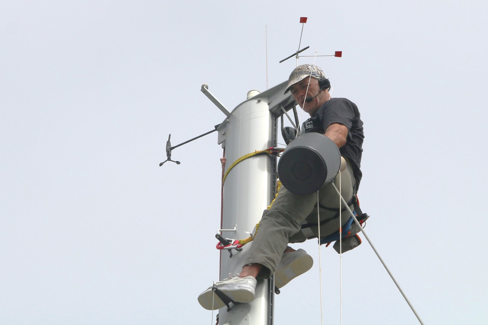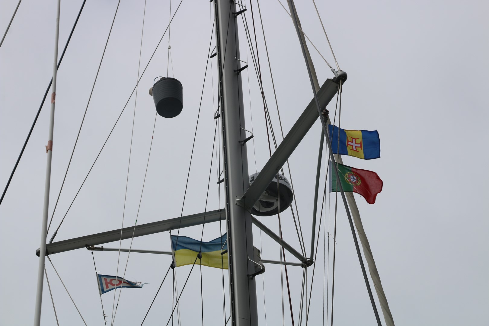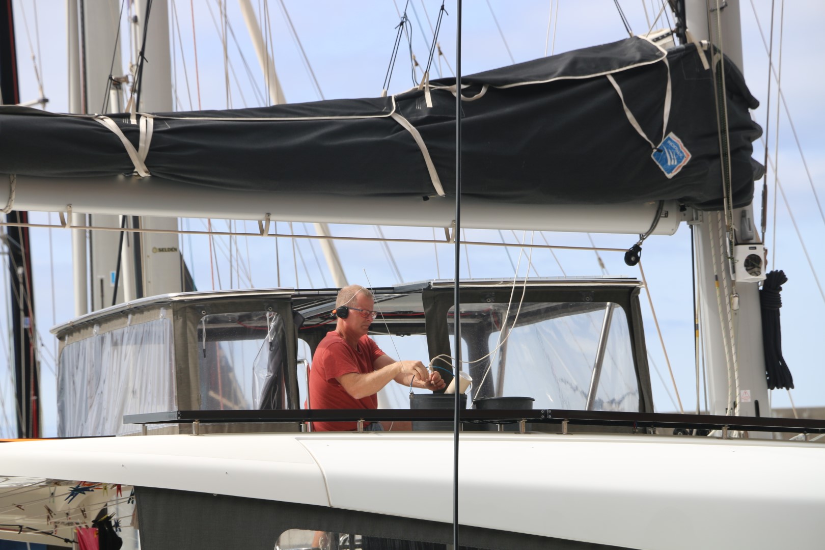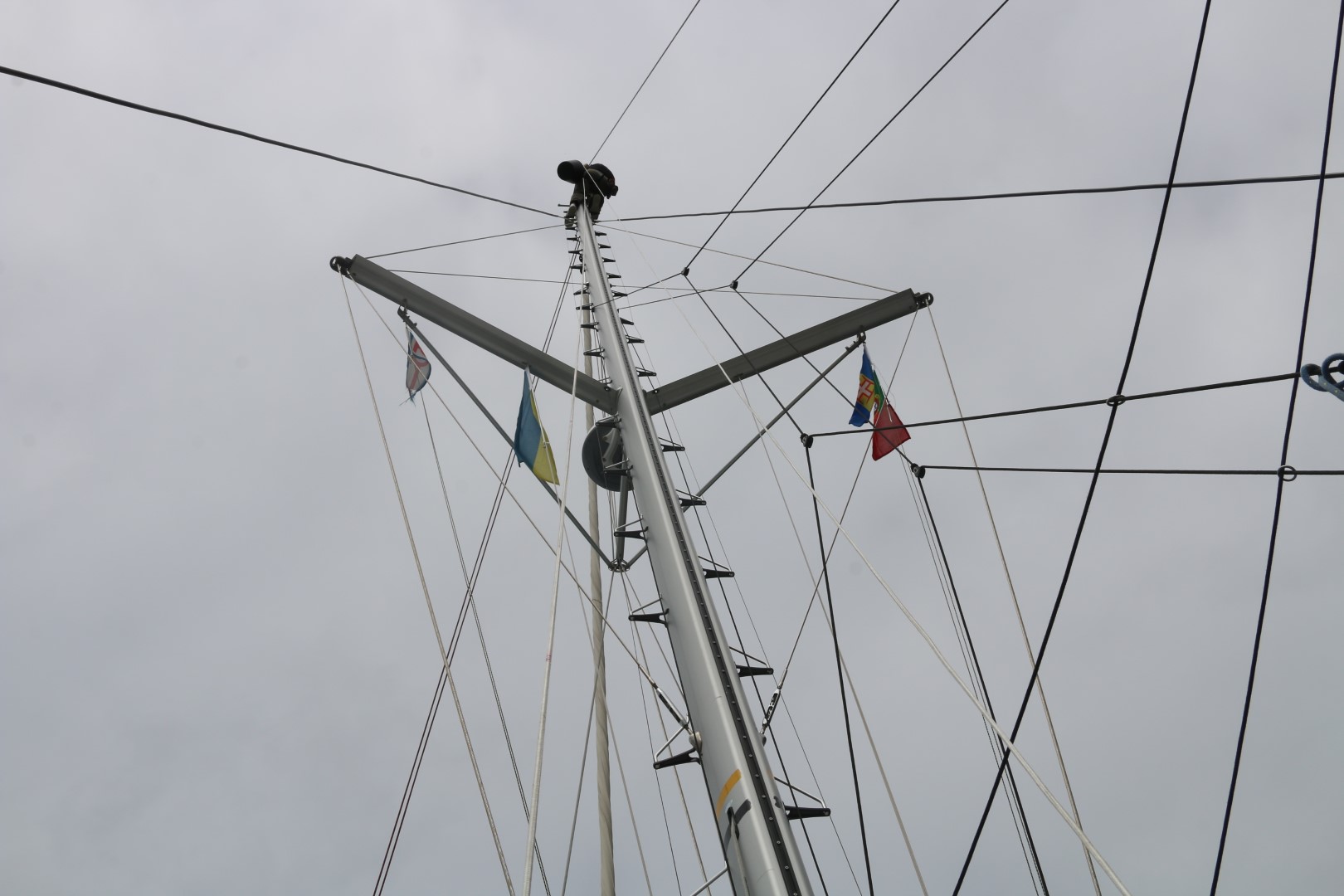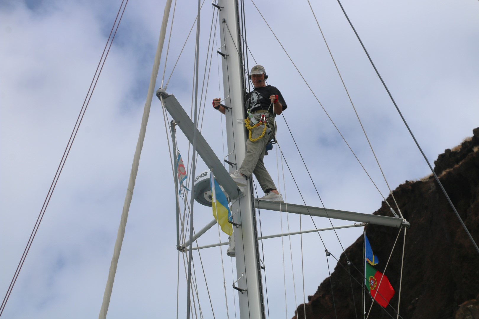 Heute ist der letzte Tag, nein die letzten Stunden im Hafen. Also muss die Mastarbeit heute gemacht werden. Peter sichert und macht die „Bodenarbeiten“. Zunächst die UKW-Antenne gewechselt. Die von den Bermudas hat ist eine speziell auch für AIS gebaute. Und wir hatten in letzter Zeit das Gefühl, dass unser AIS (mit der Notantenne) nicht so wunderbar funktioniert. Nun haben wir auch den Adaper, um sie anzuschließen. Dann die Windfahne, die die UKW-Antenne vor den Berumdas zerschlagen hat. Bekomme ich nicht aus dem Gewinde. Also das ganze Gestänge gelöst und runter geschickt. Peter hat selbst in der Werkstatt so seine Schwierigkeiten. Dem Einsatz von so vielen sei Dank haben wir jetzt ein funktionierendes Intercom-System. Um den Nacken herum die Ohrenhörer und ein Microfon an der linken Backe. So kann ich alle Fragen von Peter beantworten, der am Ende ein neues Gewinde schneidet. Währenddessen montiere ich den Umlenkblock im letzten freien Schacht. Das letzte Mal [Link auf Beitrag] ist mir die Scheibe ja im Mast nach unten gefallen. Schaden macht klug. Diese Mal ist sie gesichert mit einem ausreichend langen Band. Mit einigem Gefummel bekomme ich sie plaziert. Kaum ist der Bolzen gesichert, hat Peter die Windfahne fertig. Die ist dann schnell montiert. Aber alles zusammen habe ich dann über eine Stunde im Mast verbracht…