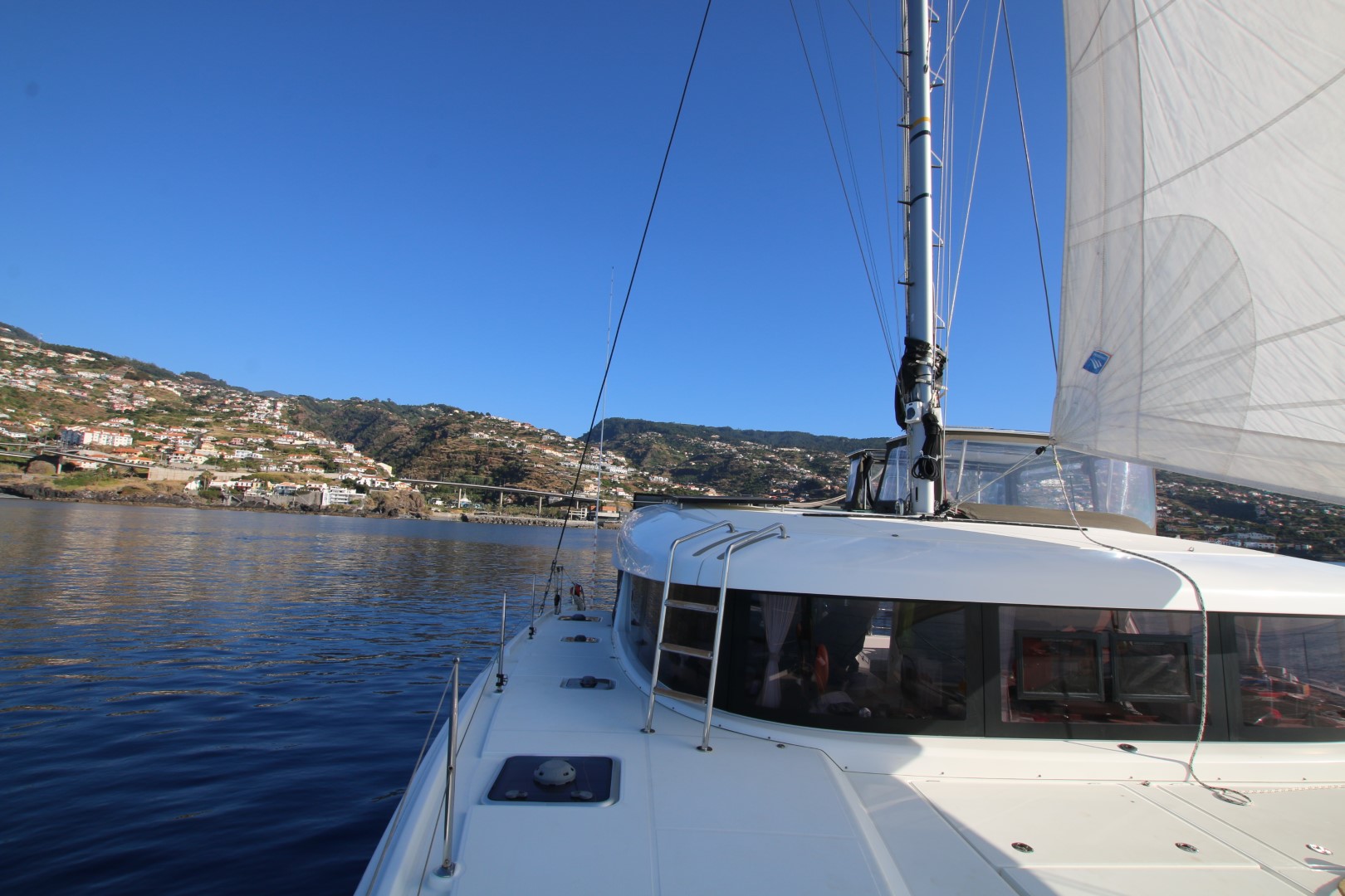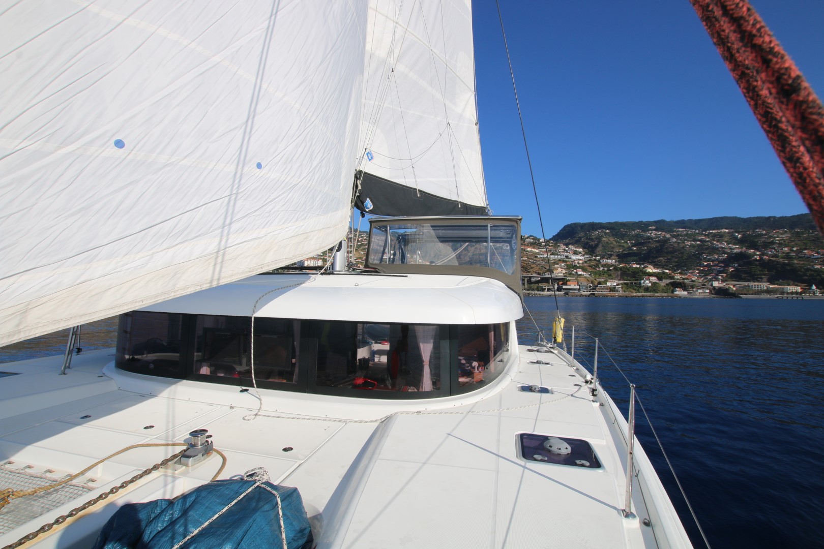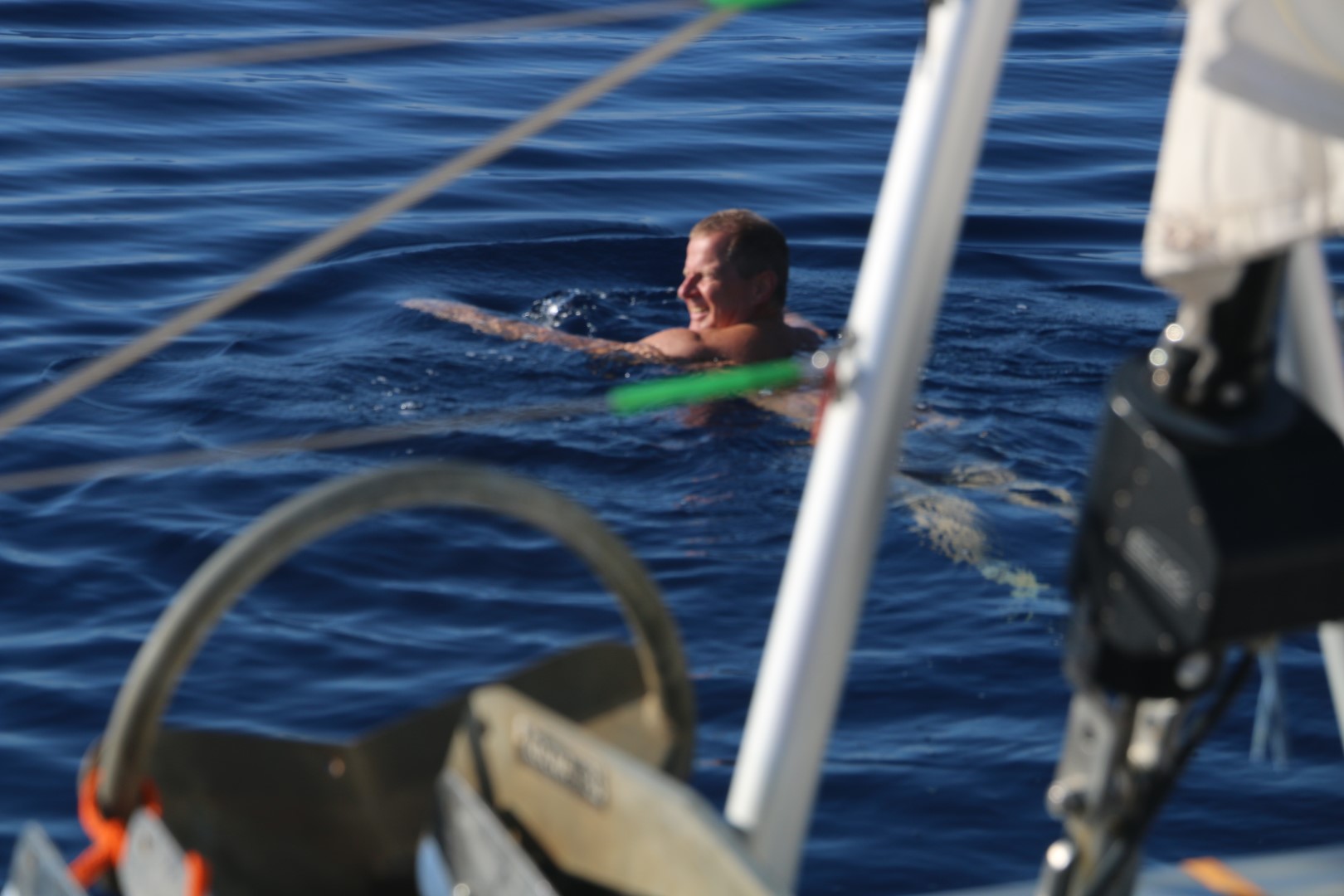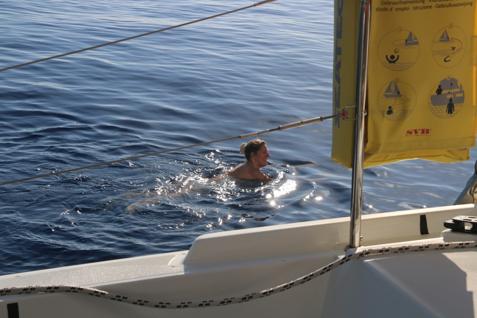 Vom Ergebnis her ist der Segeltag ein Reinfall: Zwar konnte ich ganz in Ruhe starten. Groß hoch, Fock raus, dann Anker lichten und es geht mit ca. 1 kn Fahrt raus. Nun gut – eher 0,2 bis 0,8 kn. Peter taucht auf und Melanie folgt bald. Und dann tauchen beide – ein ins kühle Nass. Schwimmen vor RE her und versuchen ihr den Weg zu weisen. RE aber hat so ihren eigenen Willen und fährt lieber nach Osten. Bald eine Stunde schwimmen die Beiden. Kaum sind sie aus dem Wasser fängt RE an zu beschleunigen. Achtern fängt es an zu gluckern. Chrischan ist zufrieden. Wir sehen sogar mal mehr als 4 Knoten auf der Anzeige. Doch bald ist das Glück zuende, RE segelt in die rtichtige Richtung, auf dem Nav-Bildschirm sieht man aber die Kurslinie in die andere Richtung wachsen: Ein Strom von ca. 1 kn treibt uns zurück…