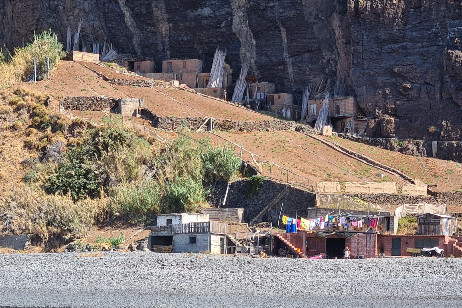 Go West: Vom Segeln ist nicht viel zu berichten, gegen Ende des Tages weist Michèle auf eine Bucht. Da sind sie wieder, die Spaßkatamarane. Und die werden nun bald Ankerauf gehen, denn um 18:00 Uhr wollen die die Leute der Nachmittagstour in der Marina wieder ausladen. Und die wissen, wo nette Buchten sind. Also will sie da ankern! Passt: Aber das Ankern in Baixio da Faja dos Asnos gestaltet sich dann schwierig. Im östlichen Teil ist es sehr steinig. Beim Schnorcheln entdecken wir, dass der westliche Teil schon auf der 8-Meter-Linie schönen Sandboden hat. Also – verlegen! Die Bucht ist mit Seilbahn mit dem „Oberland“ verbunden, ein Gleitschirmflieger landet am Strand. Das find ich natürlich gut! Hier möcht ich noch mal hin!
