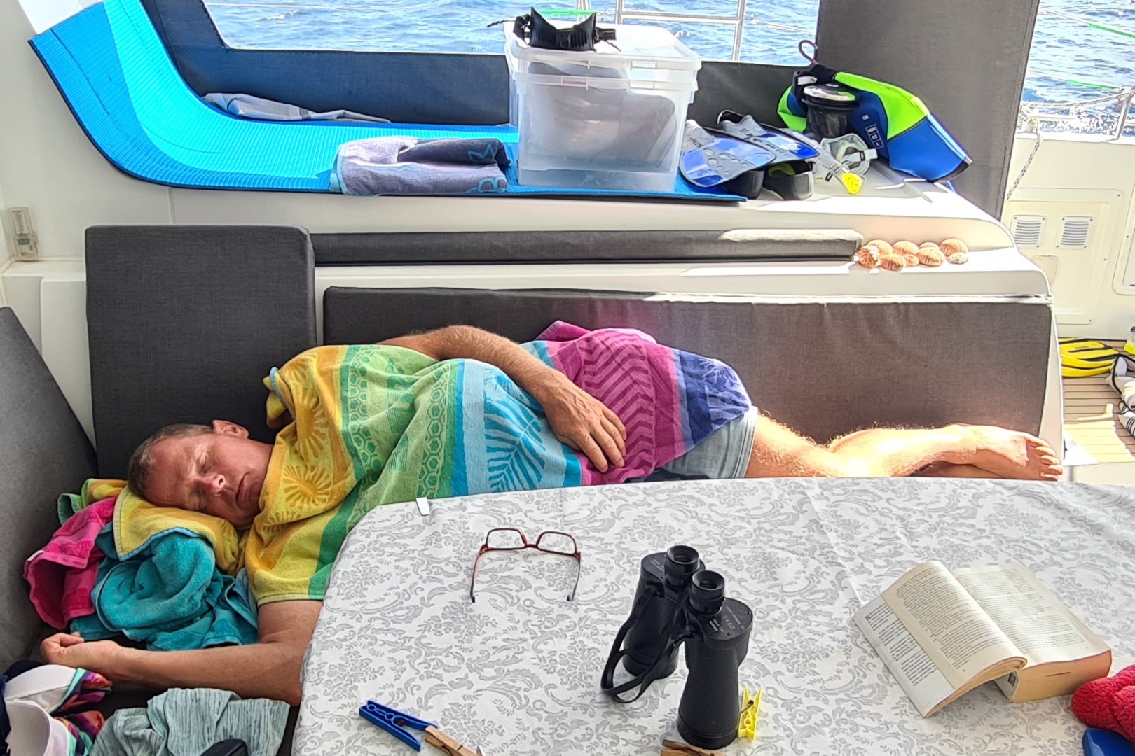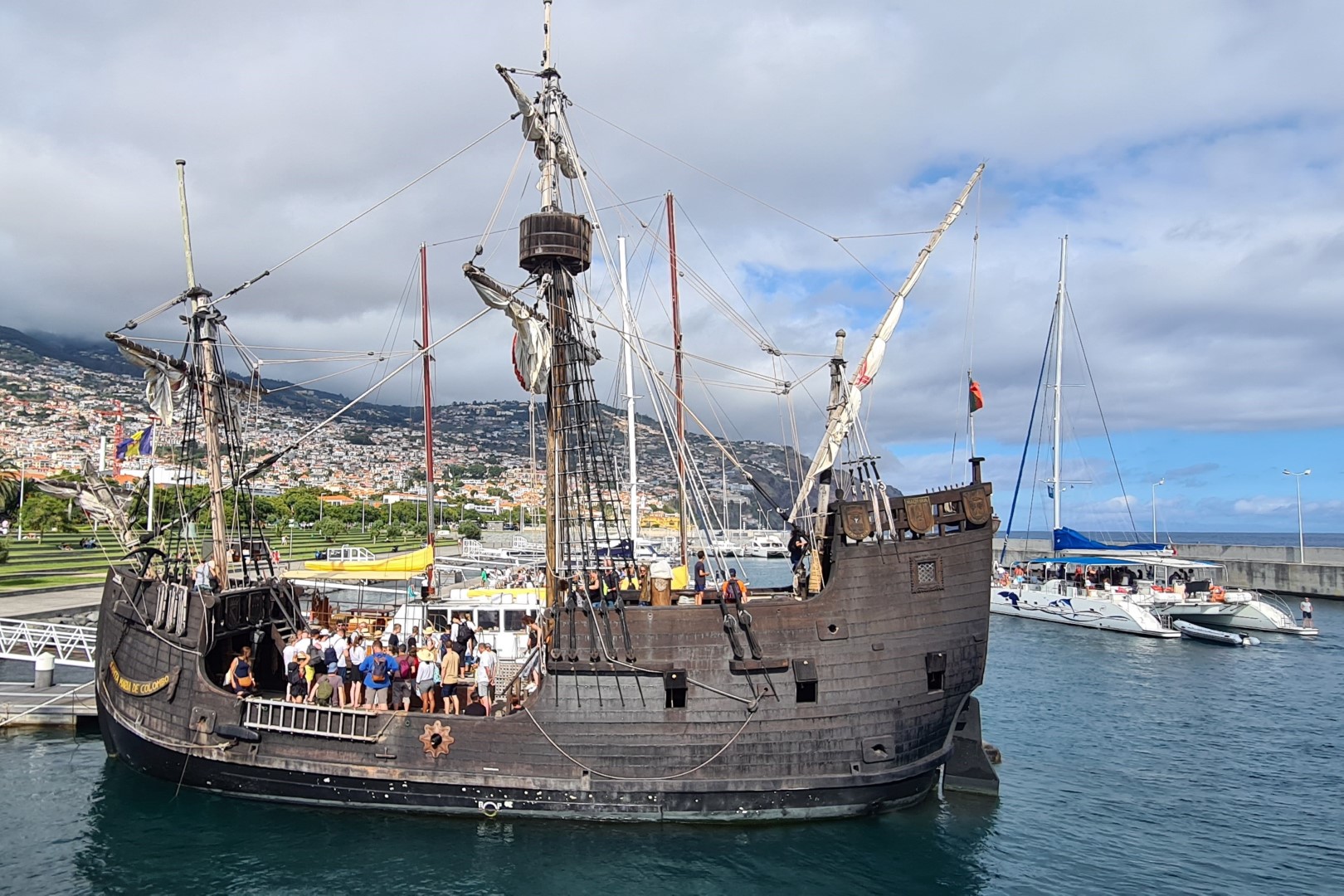 Morgens will ich schnell noch Müll wegbringen. Peter ist natürlich schon auf und kommt mit. In der Marina ist das Entsorgen einfach. Und dann noch „schnell“ an den Strand, mit der Drohne ein paar Messflüge „Plastik“ machen. Nun – auf dem Rückweg biegen wir noch in die Markthalle ab, Melanie braucht noch Petersilie. Ok – nun ist der Sprung zum Pino doce kurz. Also holen wir noch ein paar Schnuckelchen: Kekse und anderen Süßkram. Endlich zurück an Bord werden wir hochnotpeinlich befragt, wo wir so lange waren. Na ja – auf dem Weg zur Marina sind wir an langen Schlangen wartender Leute vorbei. Und haben durchgezählt. Nur einig sind wir uns nicht geworden. Wie viele gehen auf einen Spaß-Katamaran? Auf dem Original-Nachbau (Zitat der Werbung!) der Santa Maria sitzen – da sind wir uns schnell einig – 50 Leute. Aber auf den mehr als 4 Spaß-Katamaranen? Also stellen wir uns über den Ponton von einem und zählen! Am Ende waren es über 90 (!) die da für eine dreistündige Fahrt mit Bademöglichkeit und der Möglichkeit eventuell vielleicht Delfine und Wale zu sehen jeweils 30,- € abgedrückt hatten. Eine Frau ist nicht mitgefahren. Aus der Diskussion entnehmen wir, dass ihre Mitsteiter noch (?) nicht da sind…. Also: Am Ende dürfen die wahrscheinlich 100 Leute an Bord nehmen. Damit hat die „schnell Müll wegbringen-Aktion“ natürlich gedauert….