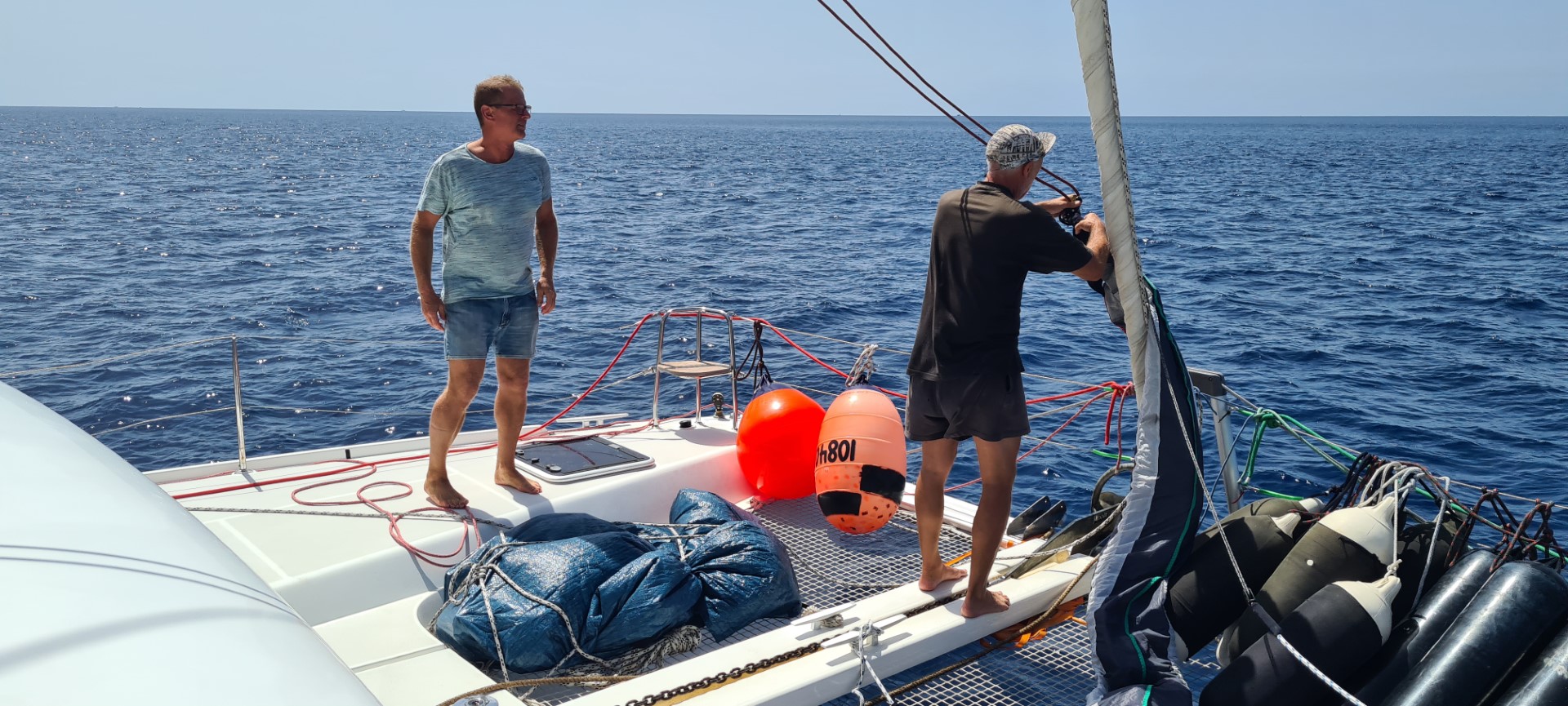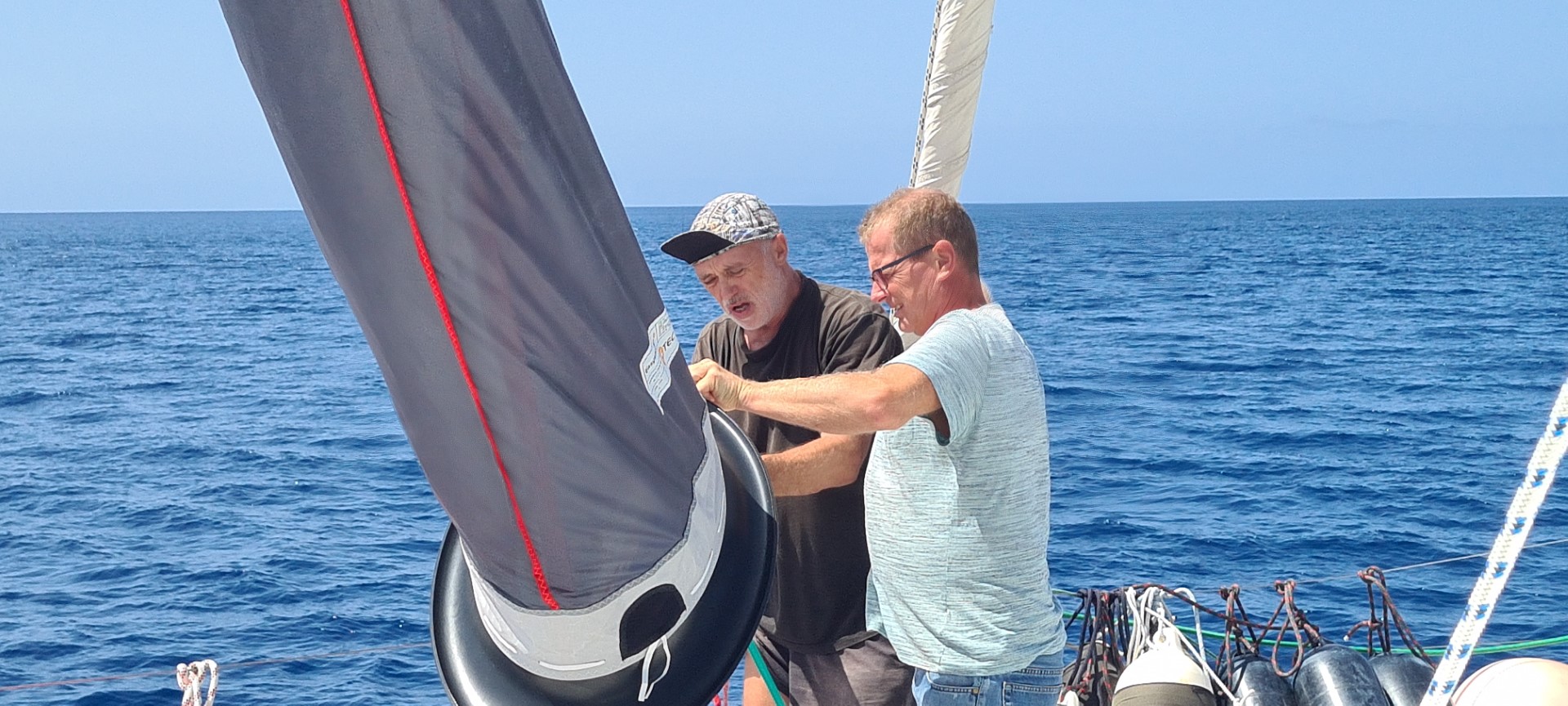 Nach einen ausgiebigen Frühstück heben wir den Anker und setzen den ParaSailor. Schöner Rückenwind treibt uns Richtung Flugplatz. Die Angel wird achtern ausgebracht. Ich mache Wasser, bereite „Ullas Linsensalat“ und das Kochstück für ein Linsenbrot vor. Dann darf ich Peter vom Sonnen hochjagen. Wir machen uns dann an die Deckenblende der Werkstatt. Peter inspiziert, was ich da habe und stellt fest, dass er die Türen besser einstellen kann. Ich segele zwischendurch immer mal wieder. Leider läßt der Wind immer weiter nach und dreht dann mit 3 kn rund um die Windrose. Da muss der Para geborgen werden. Wir versuchen es mit Groß und Fock und schummeln dann ein wenig mit dem Backbord-Motor. Als wir um die Ecke kommen steht der Wind endlich wieder gut, 6 – 7 kn lassen mich hoffen, dass es ohne Motor geht. Aber hier steht eine Welle, dass der Autopilot den Kurs nicht halten kann und so steuere ich per Hand. Melanie ist mit der Schaukelei nicht zufrieden. Aber als der Wind dann noch mehr schwächelt und wir die Segel bergen, wird es nicht besser. Auch am Ankerplatz haben wir ordentlich Schwell. Aber den hatten wir uns ja ausgesucht, damit die beiden morgen zu Fuß zum Flughafen gehen können.