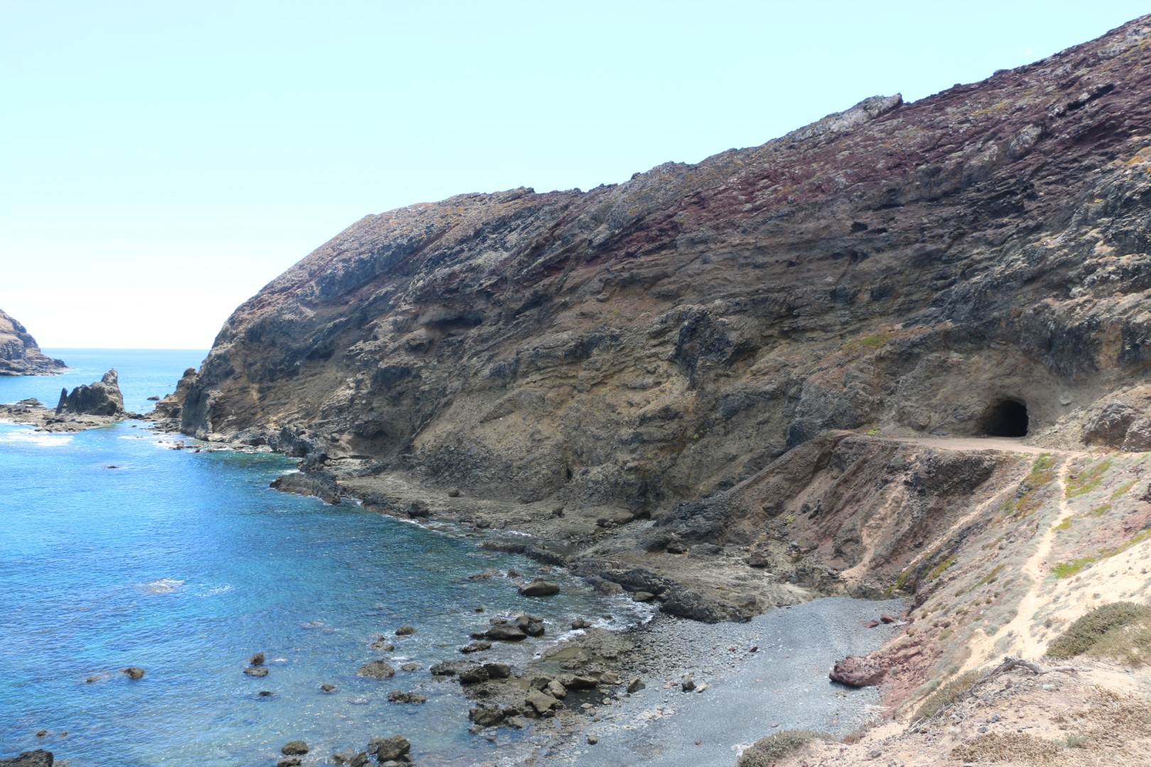 Der erste Teil ist bekannt und immer noch schön. Wenngleich heute weniger Wind weht und es damit wirklich ganz schön warm ist. Im Tunnel dann ein kleiner Erfrischungsstopp. Und weiter auf der Nordost-Seite. Hier liegt eine Menge Sand auf dem breiten Fahrweg. Das macht das Vorankommen schon schwieriger. Aber die Strecke ist üebrschaubar und nicht wie von Yoshi angekündigt, deutlich länger als bis zum Tunnel. Langsam kommen dann doch mehrere Häuser in Sicht. Eine Bruchbude mit Sonnenschirm am Wasser. Ist das das Cafe? Links, an einer Teerstraße ein hübsches Gebäude. Ich gehe voraus zur Erkundung: Auch hier dann Sonnenschirme, leise Musik und – viele Tische, gut besetzt. Michèle heran gewunken. Ein nettes Cafe. Auf einem Obstteller finde ich neben Apfel-Spalten und Erdbeer-Scheiben dann Avocado! Gut – ist ja gesund. Aber für mich Premiere als pures „Obst“ und zum Nachtisch.