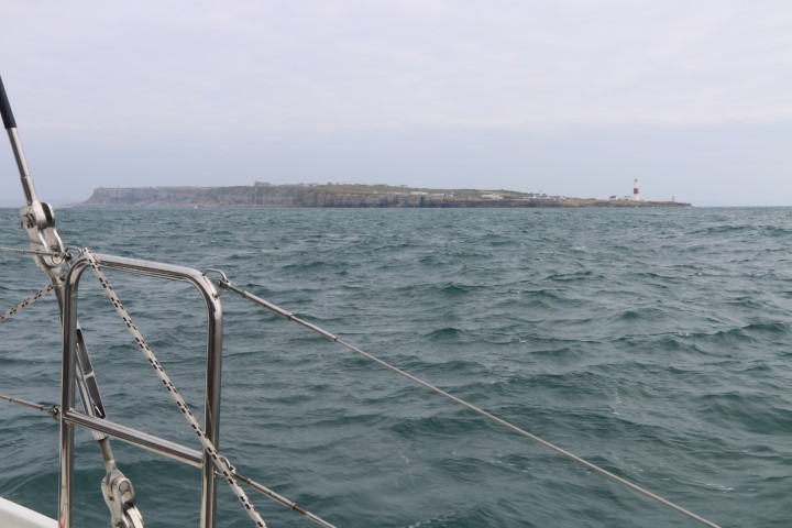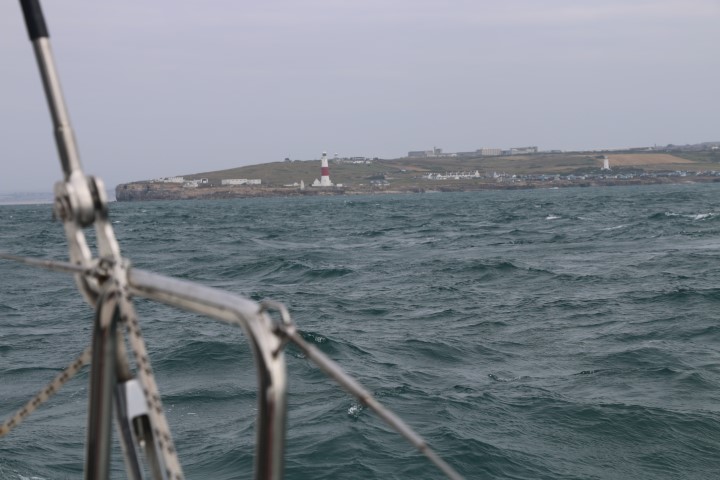 25 Meilen rechts voraus ist „Portland Bill“ und sieht wie eine Steilküste aus, hinter der man sich vor dem Wind verstecken kann. Und das in einer Richtung, die wir noch gut mit „Nur-Fock“ segeln können.