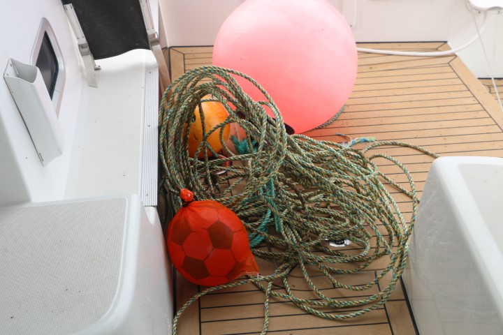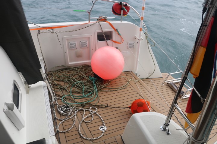 Bootshaken! Michèle hat ihn schon in der Hand. Eingetaucht und ich kann den einen Tampen erwischen. Eine Minute später haben wir die beiden Bojen an Bord. Nur leider ist der dickere Tampen, der wohl am Netz hängt so stramm, dass ich ihn nicht einen Millimeter hoch bekomme. Die dabei aufklatschende Welle nässt meine untere Hälfte.