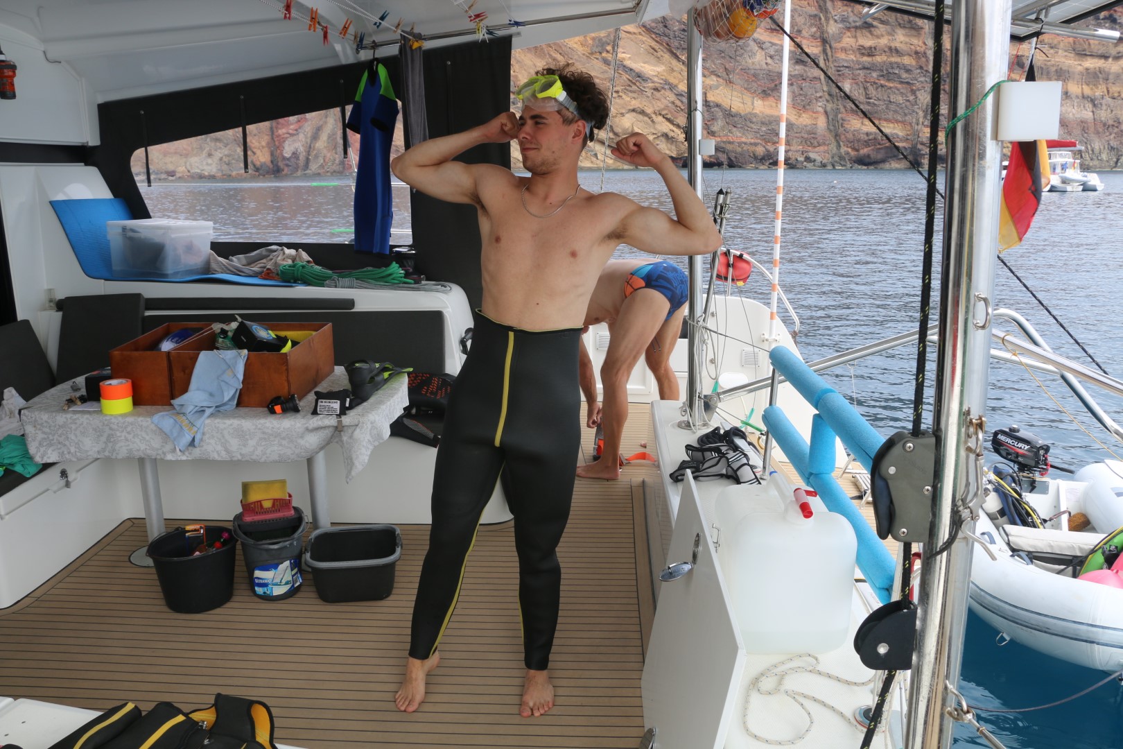 Der erste Tauchgang wird für Paul richtige Arbeit! Erst mal das ganze Tauchgerödel aus den verschiedensten Ecken raussuchen. Dazu muss auch sein Bett deinstalliert werden, wenn unter ihm liegen einige Tauchgeräte. Einiges aus dem Taucherstore, einiges aus der Werkstatt. Dazu dann noch meine Sachen, auch überall auf dem Boot verstreut.