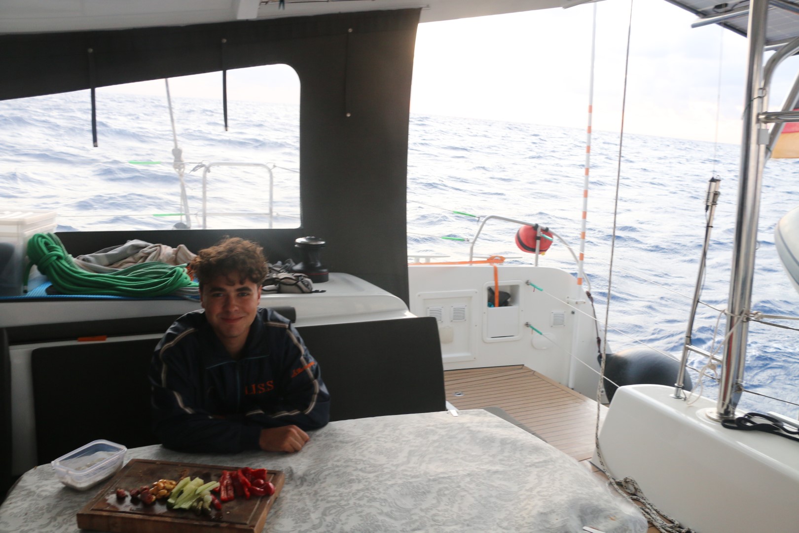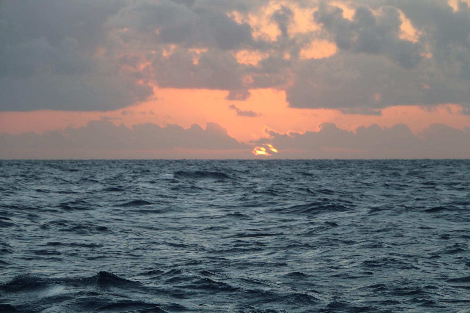 Die Nacht fängt spät für Paul an. Er hat 18:00 bis 22:00 Uhr Wache. Und sie hört früh auf. Um 05:00 Uhr geht es dann schon wieder weiter… Da ist der junge Herr unausgeschlafen. Der Sonnenaufgang ist noch unspektakulärer als gestern. Nun – zumindest der Sonnenuntergang gestern Abend hat was geboten! Das fiel zwar just auf die Abendessenszeit, aber für ein kurzes Fotoshooting konnte das unterbrochen werden!Seit 9 Uhr beginne ich zu reffen. Zunächst Reff 1, da der Wind in den Bereich von 23 Knoten kommt. Und da ist es dann angesagt. Und ab 11 Uhr dann, weil wir zu schnell sind. Um 15 Uhr dann Reff 3 und Fock Reff 1! Immer noch manchen wir fast 5 Knoten. Und damit würden wir morgens um 4 Uhr – also in der Dunkelheit ankommen.