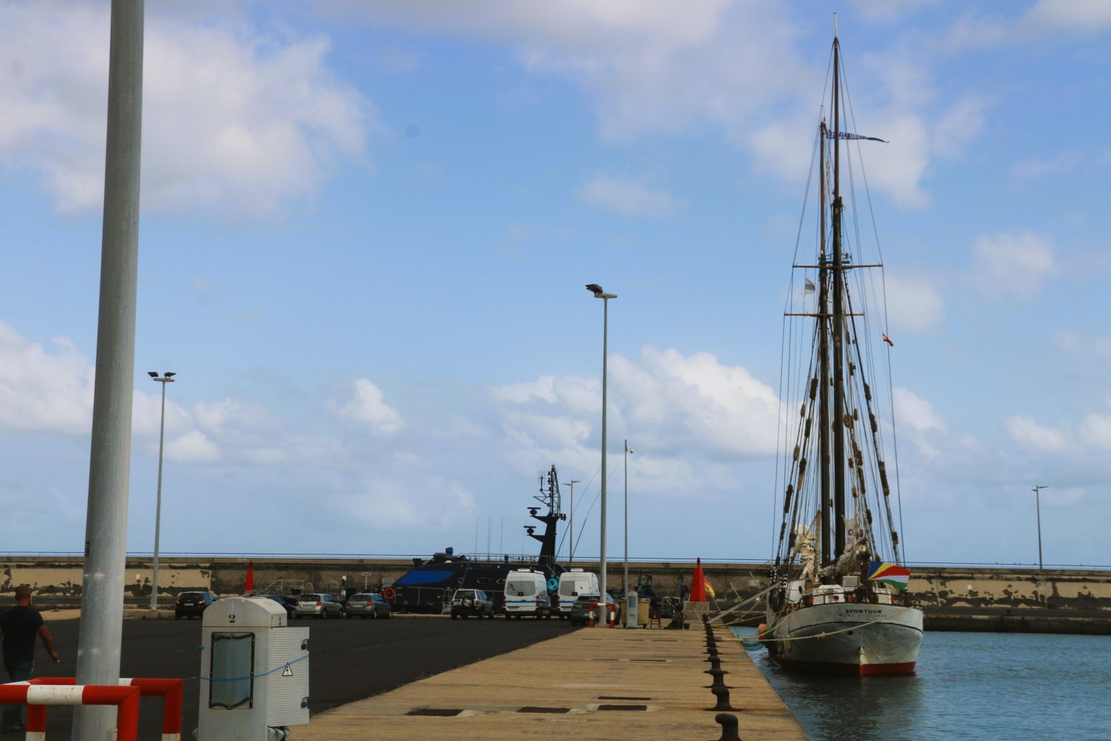 Am Nachmittag dann einen Hafenspaziergang. Eigentlich wollten wir die Außenmole bis zum Ende, aber Michèle entdeckt ein Verbotsschild. Na – dann nicht. Auf der anderen Seite kommen wir zuletzt bei der Avontuur vorbei. Die Fahne hat es uns angetan, also fragen wir. Seychellen. Nach kurzem Hin und Her mit dem weiße Shirts waschendem Mann geht es in Deutsch weiter. Er ist der Kapitän des Schiffchens. 100 Bruttoregistertonnen. Frachtsegler, der heute noch Fracht um den Atlantik verschifft! Für Unternehmen, die ihre Fracht nachhaltig transportieren lassen wollen. Kaffee von Süd- und Mittelamerika nach Hamburg. Da sei der Laderaum regelmäßig belegt. Schwierig nur Ladung für die andere Richtung zu bekommen. Zurzeit hat er einen Ur-Tesla (Auto) im Laderaum. Und immer ein paar Fässer Rum, teils sogar an Deck. Die werden dann von jeder Wache einmal mit Seewasser benässt. Der reift viel schneller und die seewasserbenässten entwickeln einen ganz eigenen Geschmack!