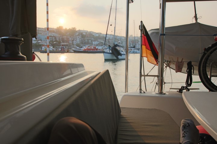 Zentral im Bild: Die Re! Mit einer Zeitverzögerung von ca. 10 Sekunden erscheinen wir im Bild. Das hatten wir dann in WhatsApp einigen Freunden geschrieben und waren umgehend dreimal aufgefordert zu winken. Michèle ganz nach achtern, ich schnell aufs Dach und rumgehampelt. Beim ersten Mal haben die Leute an Land sicher noch gedacht, wir hätten Bekannte entdeckt. Aber beim dritten Male???
