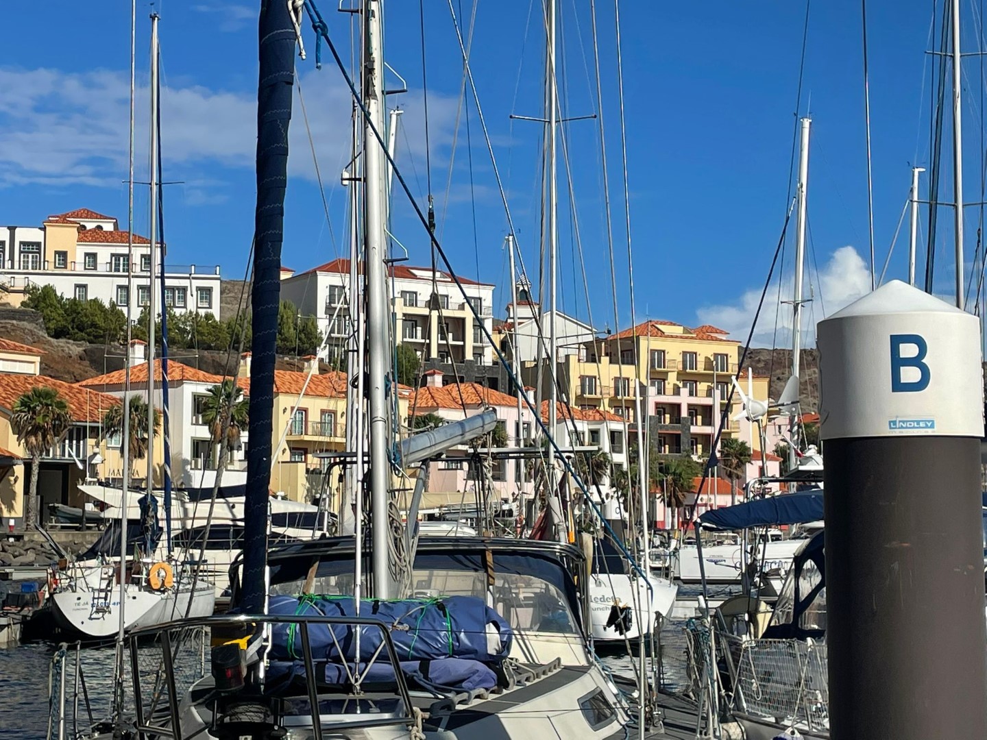 Dann kommt das Hochfahren der Navigationselektronik und das Starten der Motoren. Inzwischen ist auch Michèle „klar zum“, sprich, sie hat mindestens einen Kaffee intus. Anker auf und rüberfahren ist schnell erledigt, über Funk bekomme ich schon den Platz angewiesen und im Hafen stehen ZWEI (!) Marinieros, um uns zu helfen! Sie kennen uns, das Manöver ist langsam, denn bei dem recht starken Wind drehe ich frühzeitig und lasse mich lieber vom Wind in Position drücken. Dann rein in unsere Box und fest. Klappt prima, Carlos – der 1. Mariniero begrüßt uns mit Handschlag und heißt uns willkommen zurück.