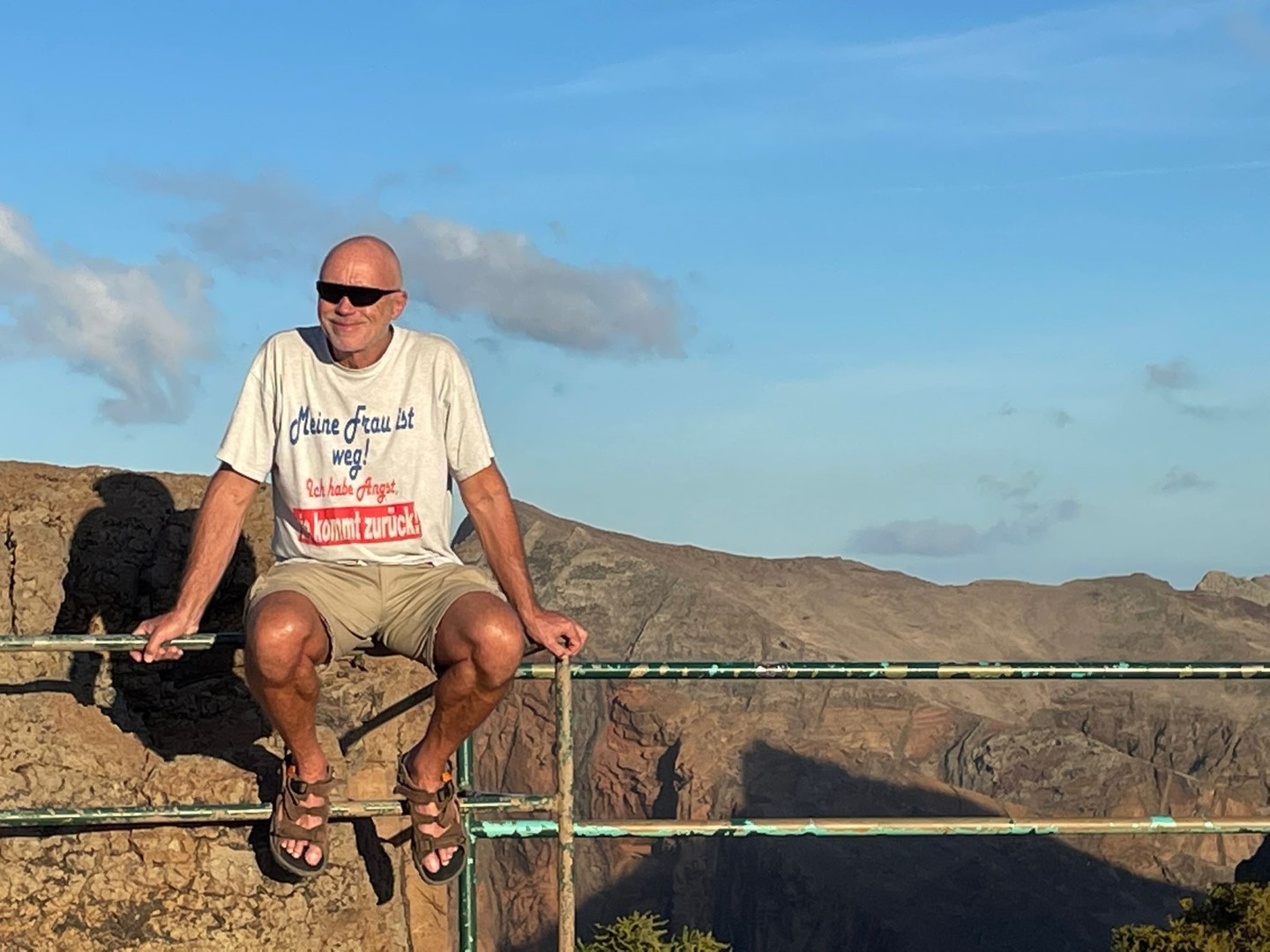 Abends müssen wir unbedingt den Mietwagen ausnutzen: Michèle hat den nämlich erst ab morgen früh gebucht, aber wir haben ihn schon heute gegen 17:00 Uhr bekommen. Einen halben Tag kostenfrei, das muss ausgenutzt werden. Zunächst auf einen "Miraduro" über QdL - mit phantastischem Abendlicht und dann: Essen gehen! Ulrike hat ein Restaurant ausgesucht, das sich als absoluter Volltreffer erweist: Paladares da Terra in Canical. Mit dem Wagen blitzschnell zu erreichen, wohl kaum Touristen, nur Madeirianer. Super Küche, BLAUE (!!) Sangria. Wir bestellen nacheinander dann 3 mal einen halben Liter. Und bezahlbar war es auch! Wohlgesättigt – um nicht zu sagen, proppevoll lassen wir uns den Vorspeisen-Thunfischsalat, der erst mit der Hauptmahlzeit kam und auch noch Süßkartoffeln einpacken, wir schaffen es nicht anders!