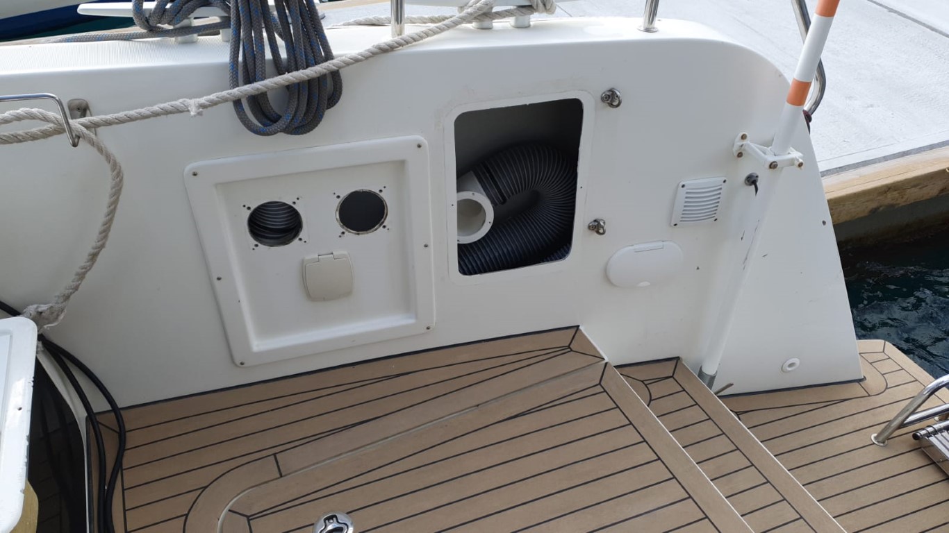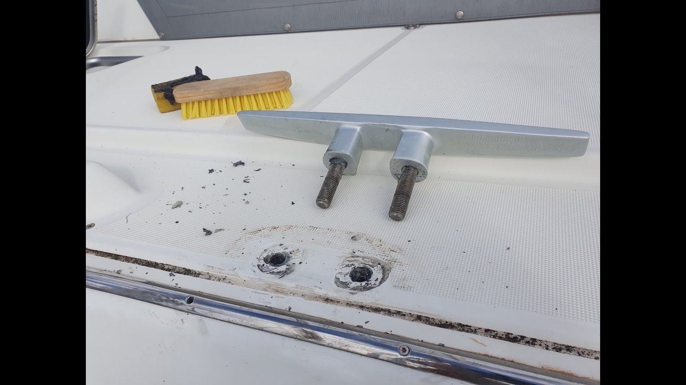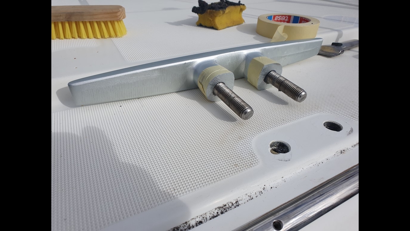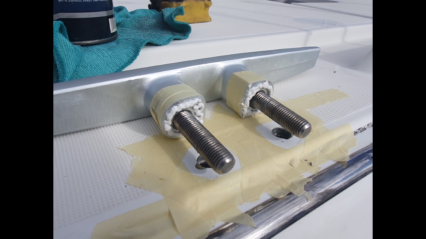 So - nun muss ich noch drei Klampen festsetzen, bzw. sichern. Lagoon hat (leider) nur eine einfache Mutter, keine Konterung. Und da arbeiten die sich anscheinend im Laufe der Jahre lose. Die Mittelklampe wackelte fürchterlich, aber auch achtern war die Klampe nicht mehr wirklich fest. Das heißt leider bei den achteren Klampen: Die versiegelten Deckel aufschneiden, ausbauen und hinterher wieder mit Sikaflex festkleben. Da wird aus einer 5-Minuten-Arbeit ein Programm, das sich über mehrere Tage hinzieht.