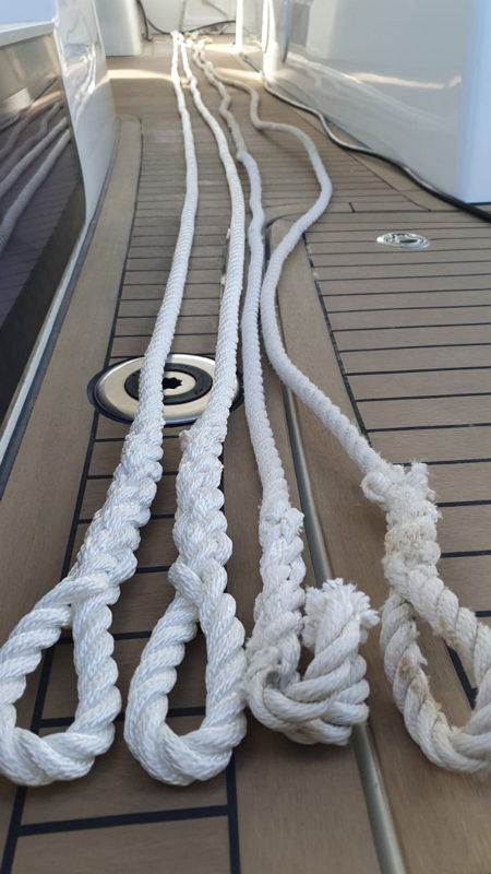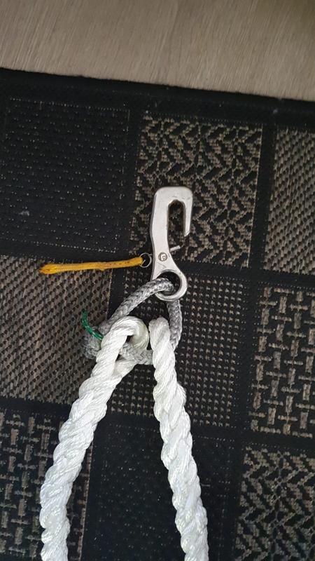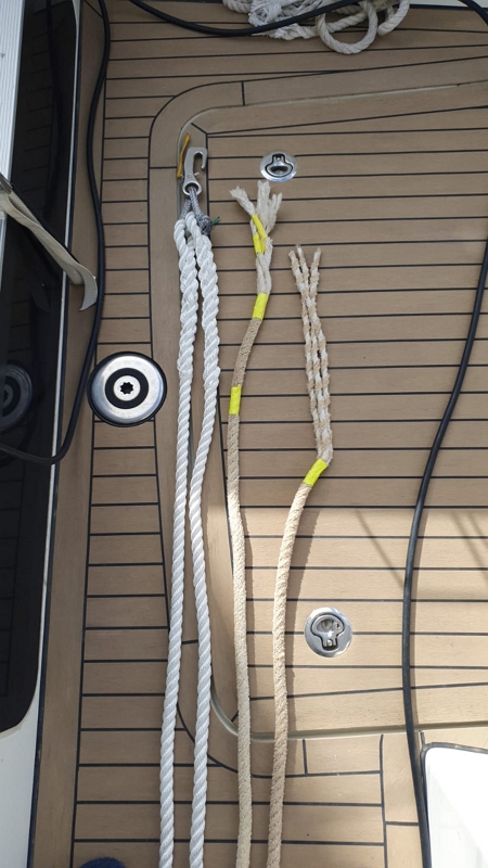 So konnte ich dann heute zwei Stücke zuschneiden und Augen einspleißen. Dazu noch einen Dynema-Softschäkel gespleißt und dann das Ganze montiert. Hurra! RE ist wieder anker-fähig!