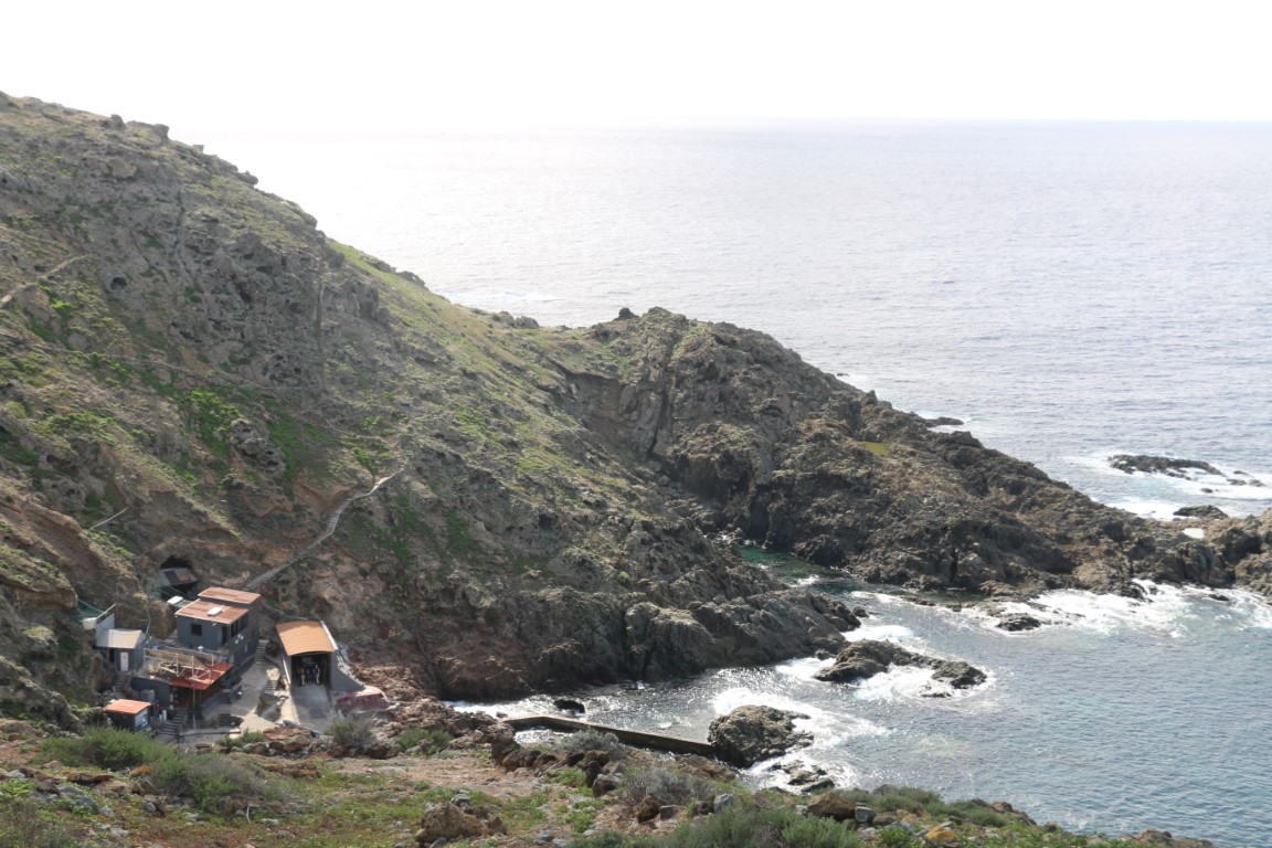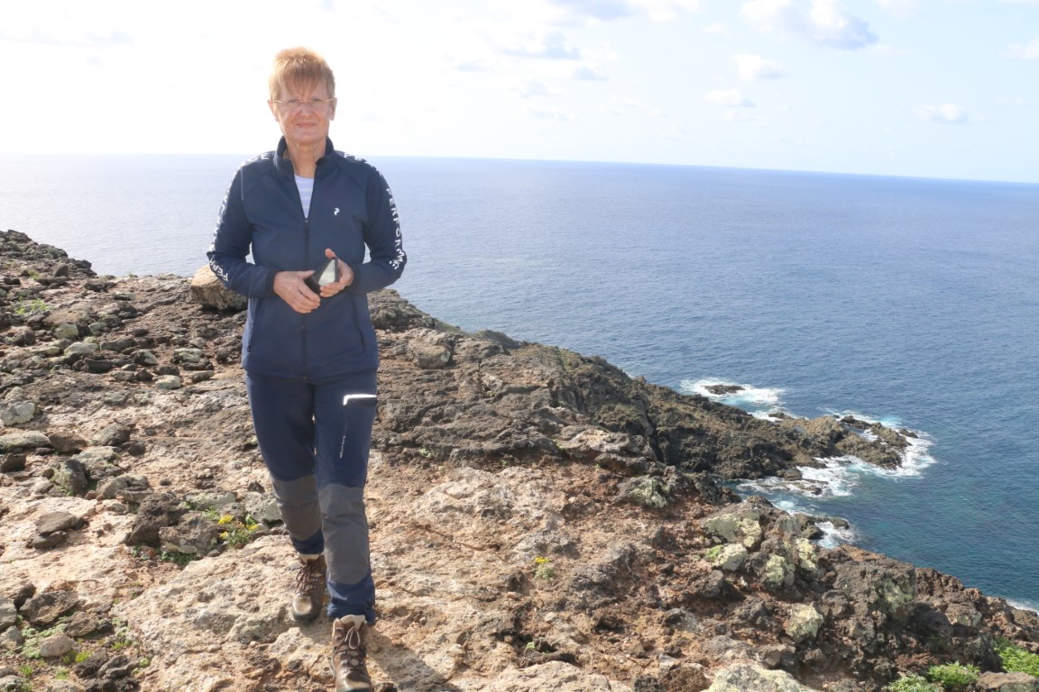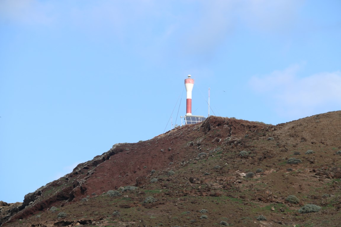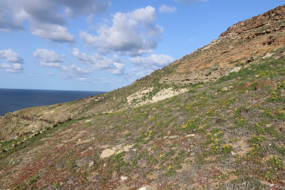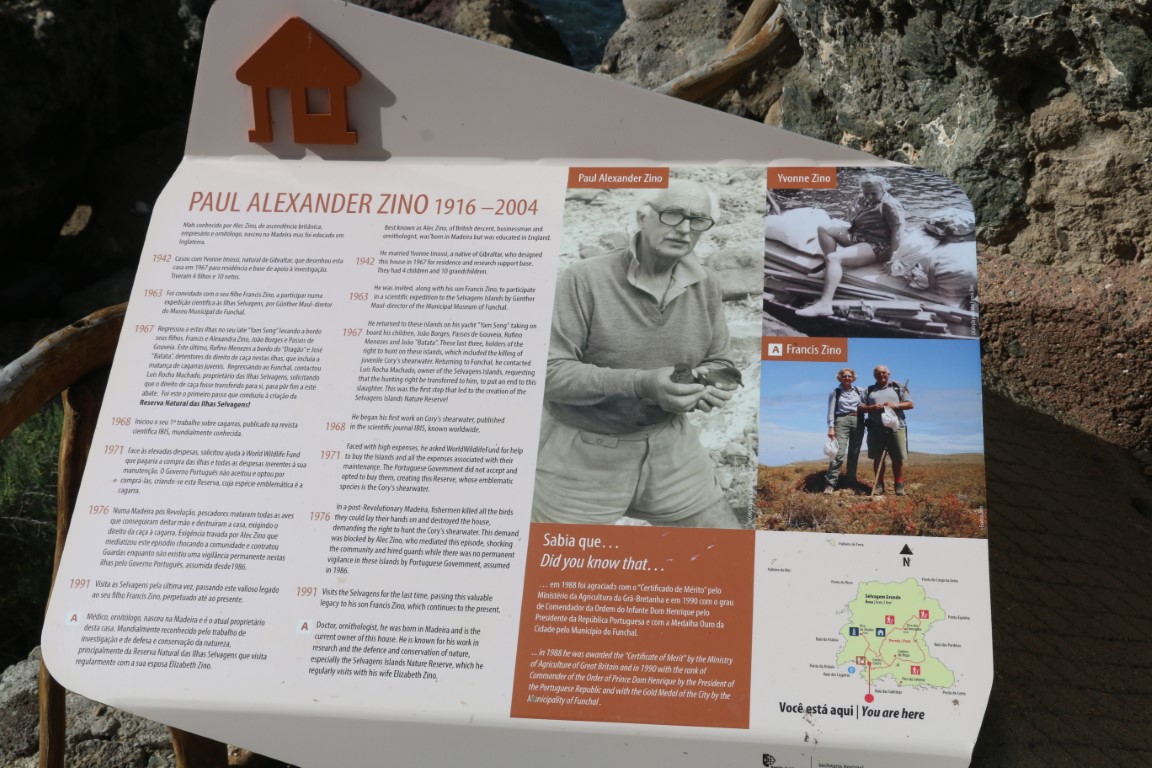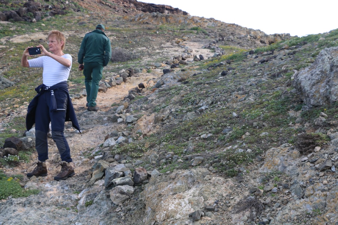 Mit dem Guide machen wir eine schöne Tour. Für mich als Wiederholungstäter (2021, 2022) fällt auf: Selvagem ist grün. Wir sind am Ende der Regenzeit und überall sprießt es! Und: Alle Nester sind leer. Kein Küken schaut uns an! Ich lerne wieder viel Neues. Spannend, dass auf jeder Tour andere Sachen zur Sprache kommen! Sie haben ja in einer Wahnsinnsaktion alle Kaninchen und alle Mäuse ausgerottet. Dass das nicht so einfach war. Heute lerne ich, dass sie Gift ausgelegt hatten. Problem: Mäuse markieren Stellen und Futter, wenn sie merken, dass es nicht gut war für sie. Dann meiden Artgenossen das. Es muss also ein Gift sein, dass erst nach einer längeren Zeit wirkt, sodass die Viecher den Zusammenhang nicht erkennen. Man hat einen Vitamin K-Blocker genommen. Nächstes Problem: Die kleinen, endemischen Vögel, die es nur hier gibt, nehmen diese Köder auch gerne. Versuch: Die Vögel einfangen und auf die Nachbarinsel bringen. Nur – die Biester können fliegen und schwups, sind sie wieder da. Nächster Versuch: Die Vögel in eine große Voliere. Aber da verenden sie in den Netzen. Dann die Lösung: Auf Pfählen werden Tränken aufgestellt. Da kommen Mäuse und Kaninchen nicht dran, die Vögel aber wohl. Und nun gibt man viel Vitamin-K in das Wasser – Antidot für die Vögel!