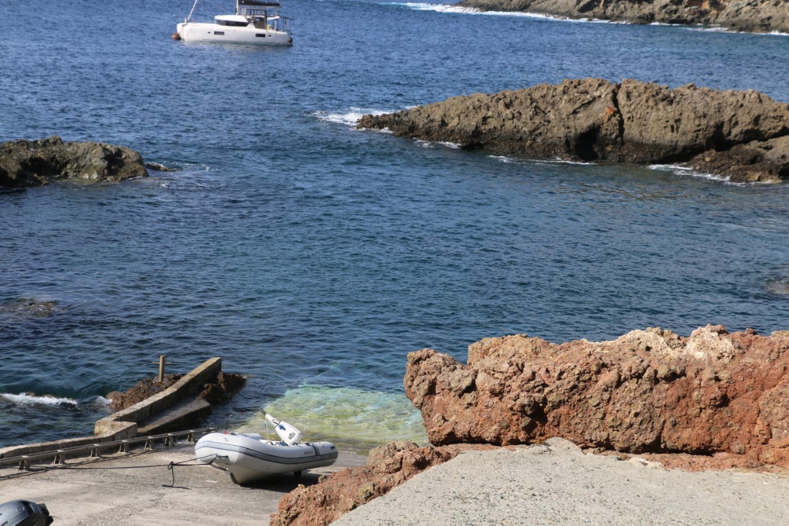 Um 10 Uhr sind wir an Land „geladen“. Nach reichem Frühstück kommt ein Anruf der Polizei: Wir sollen ja unsere gesamten Papiere mitbringen! Waren schon eingepackt. Das Anlanden klappt prima. Der Polizist und der Maschinist nehmen uns in Empfang und helfen, das Schlauchboot ein paar Meter hoch zu schleppen. Unsere Papiere werden eifrig in Empfang genommen und fotografiert – geht schneller als abschreiben.