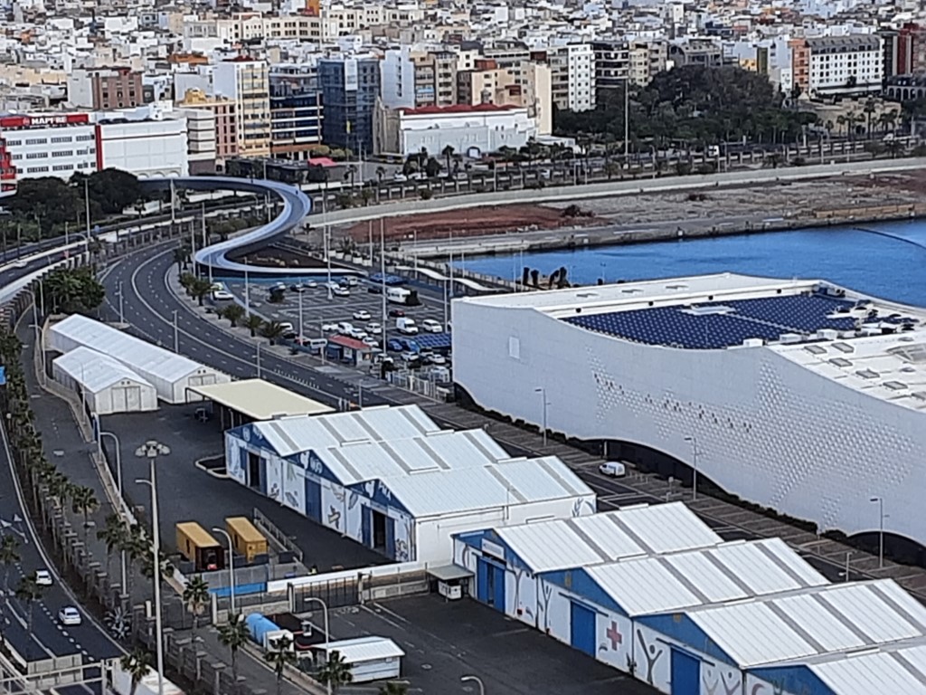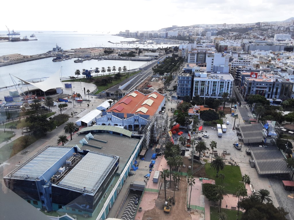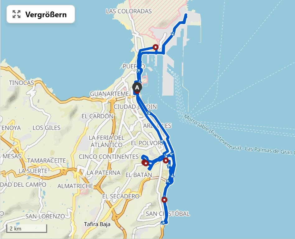 Bis die Fahrräder dann einsatzklar sind, wird es 11 Uhr. Aber dann geht es los. Die ersten Kilometer sind bekanntes Terrain. Und schon am Ende des Bekannten wählen wir die falsche „Abfahrt“. Was wir erst Kilometer später entdecken. Denn nun stehen wir mitten im Industriegebiet. Und in der Karte sieht es aus, als können man „schnell mal“ nach rechts. Nur wenn man ganz tief in die Karte zoomt, entdeckt man, dass es keine Verbindung gibt. Da fehlen vielleicht 10 Meter! Und vor Ort entdeckt man dann, dass nicht nur horizontal 10 Meter fehlen, sondern vertikal dann auch noch 20 Meter zu viel sind. Eine steile Kante durchzieht hier die Stadt. Wir stehen oben. Und wollten unten sein. Also zurück: Bald 3 Kilometer! Dann finden wir den richtigen Abzweig und folgen dem eigentlichen Weg ein paar 100 Meter. Doch auch hier unten: Eher uninteressant. Wir würde mindestens 1 Kilometer durch den Containerhafen fahren. Links steile Kante, rechts Container. Brauchen wir nicht. Also beginnt der 2. Teil der Tour! Zwischenziel: Hotel Baramas. Gibt es aber nicht! Google Maps erinnert sich aber: Heißt jetzt AC-Hotel. Da soll es im 22. Stock ein Cafe mit toller Aussicht geben. Hin, Fahrräder anschließen, Kopf hoch und am Empfang vorbei zum Fahrstuhl. Und richtig: Auch unter neuem Namen gibt es das Cafe noch. Nicht gerade wirklich einladend. Aber die Aussicht… So machen wir ein paar Bilder und verschwinden wieder.