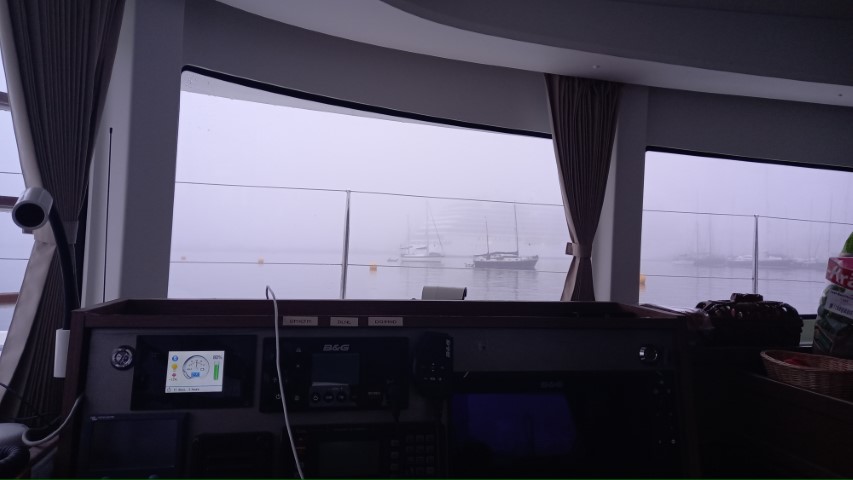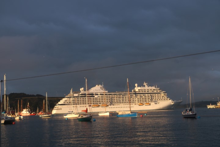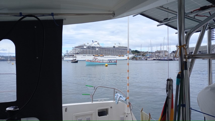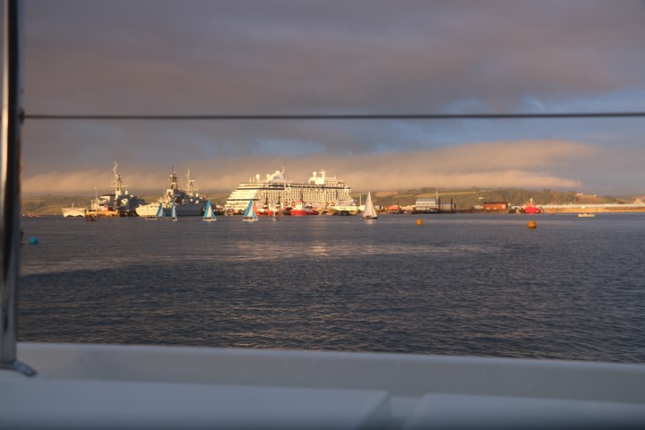 Michèle ist ganz begeistert, hinter dem Kreuzfahrer sieht man die gegenüberliegende Küste. Zwar immer noch unter einer dicken Wolke, aber schön angeleuchtet!
