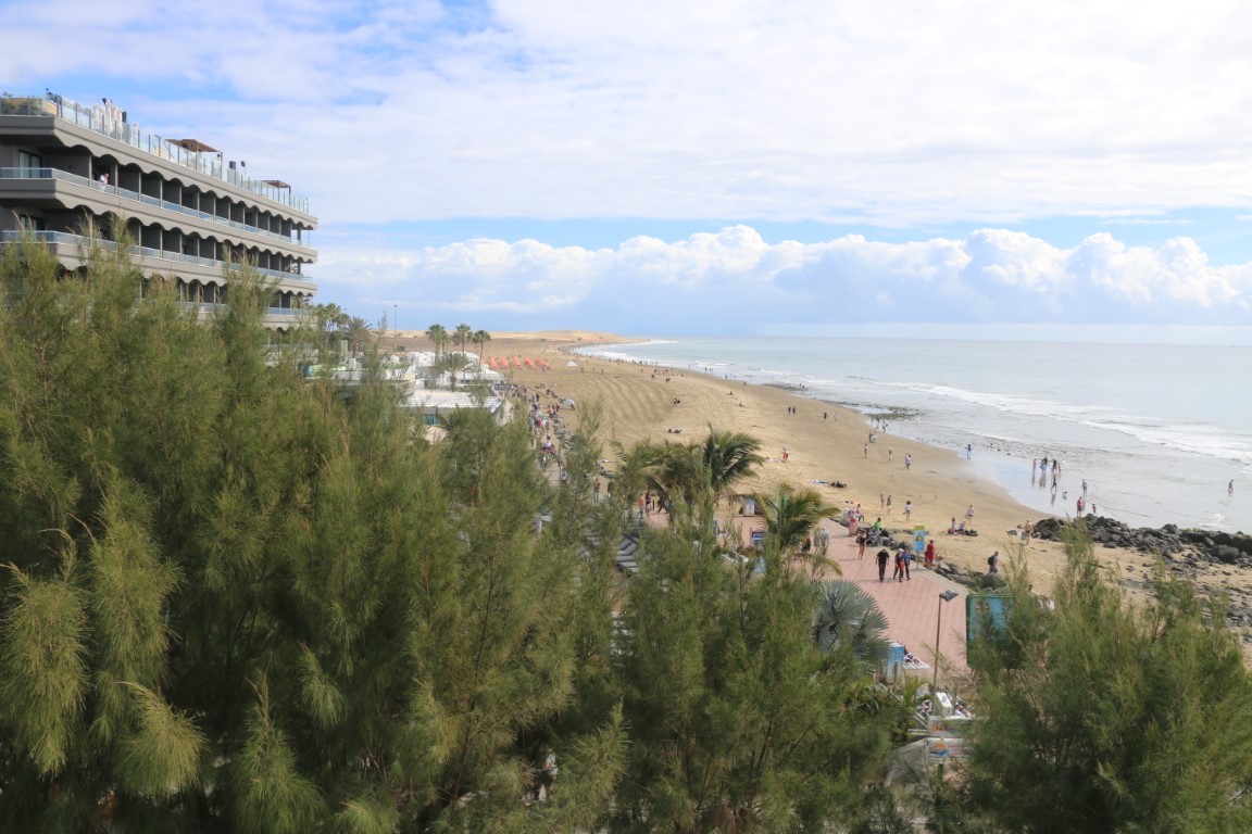 Am Ende, schon fast wieder in Maspalomas, geht es noch an der Lagune vorbei, wo sich einige Vögel zeigen. Und an der Strandpromenade gibt es endlich ein Bier – nicht nur für Karin! Wir sitzen eine Weile lang in Campingstühlen vor der Bar und genießen es, von der Sonne beschienen zu werden, ein Bier zu trinken, die Wellen an den Strand klatschen zu sehen.