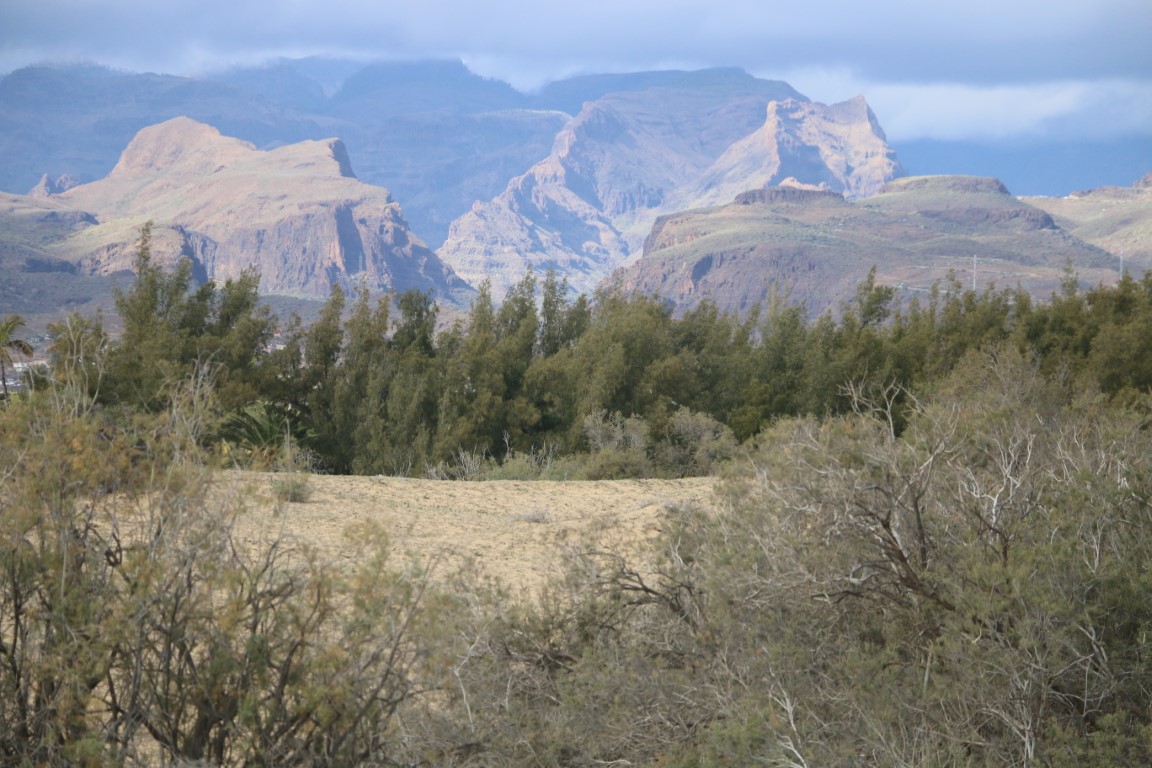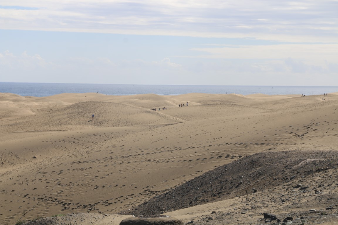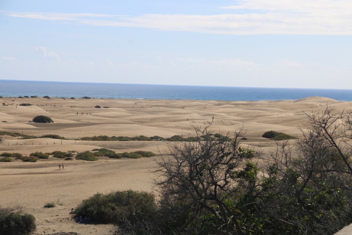An der Playa des Ingles ist dann der Wendepunkt unserer Tour. Hier ist richtig was los. In den Kneipen läuft Bundesliga auf Deutsch. Die Bayern werden verhöhnt. (Am Ende des Tages haben sie aber 3:0 gewonnen…) Und auf einem kleinen Platz gibt es Life-Tanzmusik. Karin will aber nicht tanzen, sondern weiter. Es zieht sie nun zu einem Bier, das es aber erst am Ende der Wanderung geben darf. Gut – ich habe andere Gelüste. An der Naturschutz-Info zur Düne wird es wohl auch was für mich geben!? Doch so viel wir suchen, weder nach den Beschreibungen im Reiseführer noch nach den Schildern finden wir das Zentrum. So verschwinde ich unter dem Wanderweg in einer kleinen ausgeschwemmten Höhle.