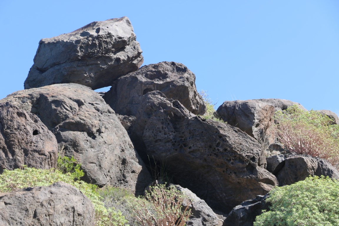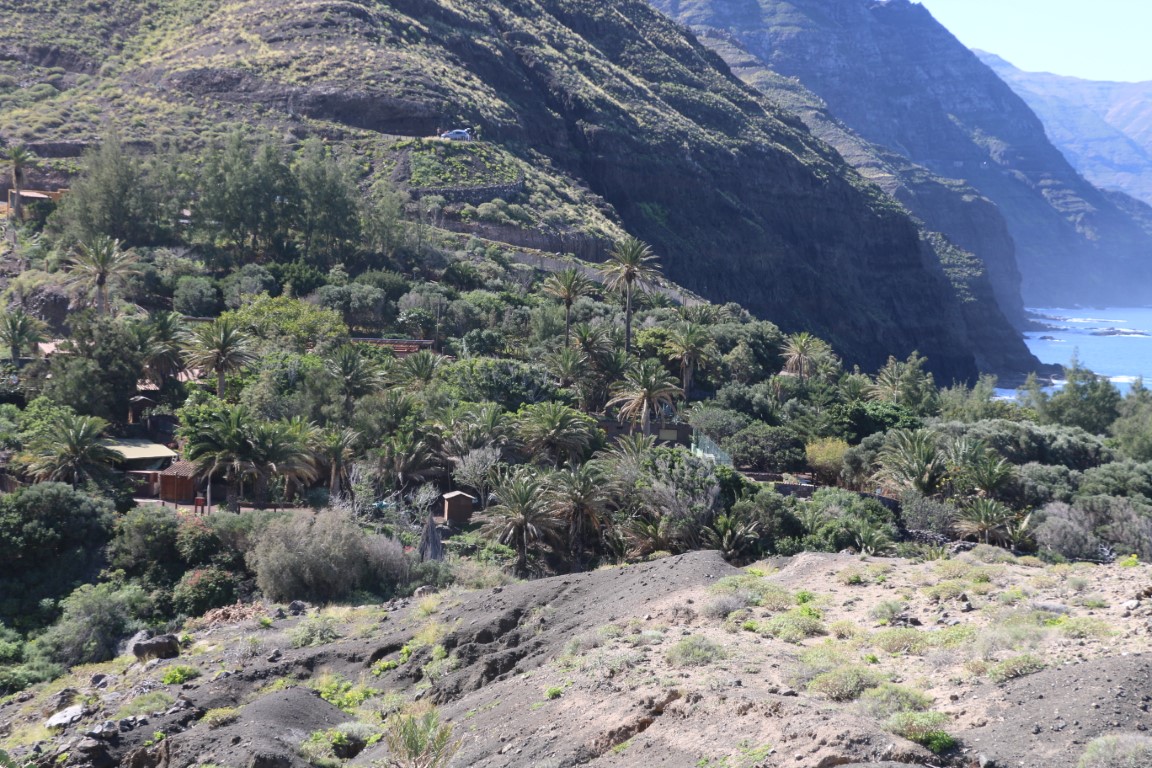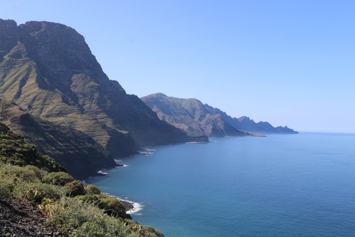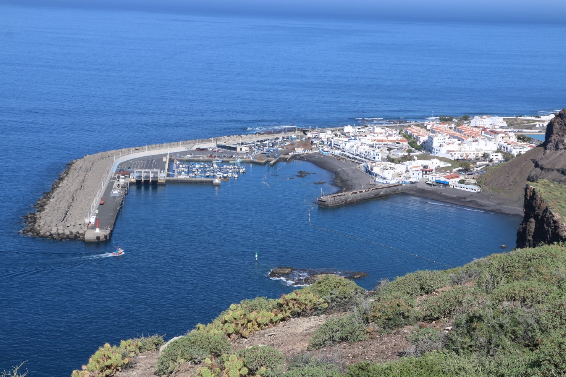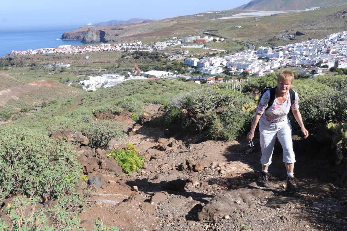 Nach Süd- kommt nun heute die Westküste dran. Und die Wanderung soll nicht ganz so lang sein, ein Badestopp muss für Karin aber sein! Agaete ist mit der autobahnähnlichen – teils dreispurigen – GC2 super schnell zu erreichen. Im Schatten findet das Auto ein Plätzchen und wir nehmen gleich den ersten Anstieg in Angriff. Ein prima Ausblick auf den Hafen Puerto de la Nieves belohnt uns oben. Und der Teide von Teneriffa ist auch zu sehen. Nach ein paar Metern auf der Landstraße geht es dann abwärts. Till-Eulenspiegel-mäßig möchten wir weinen, wissen wir doch, dass wir das nachher alles wieder raufstapfen müssen.