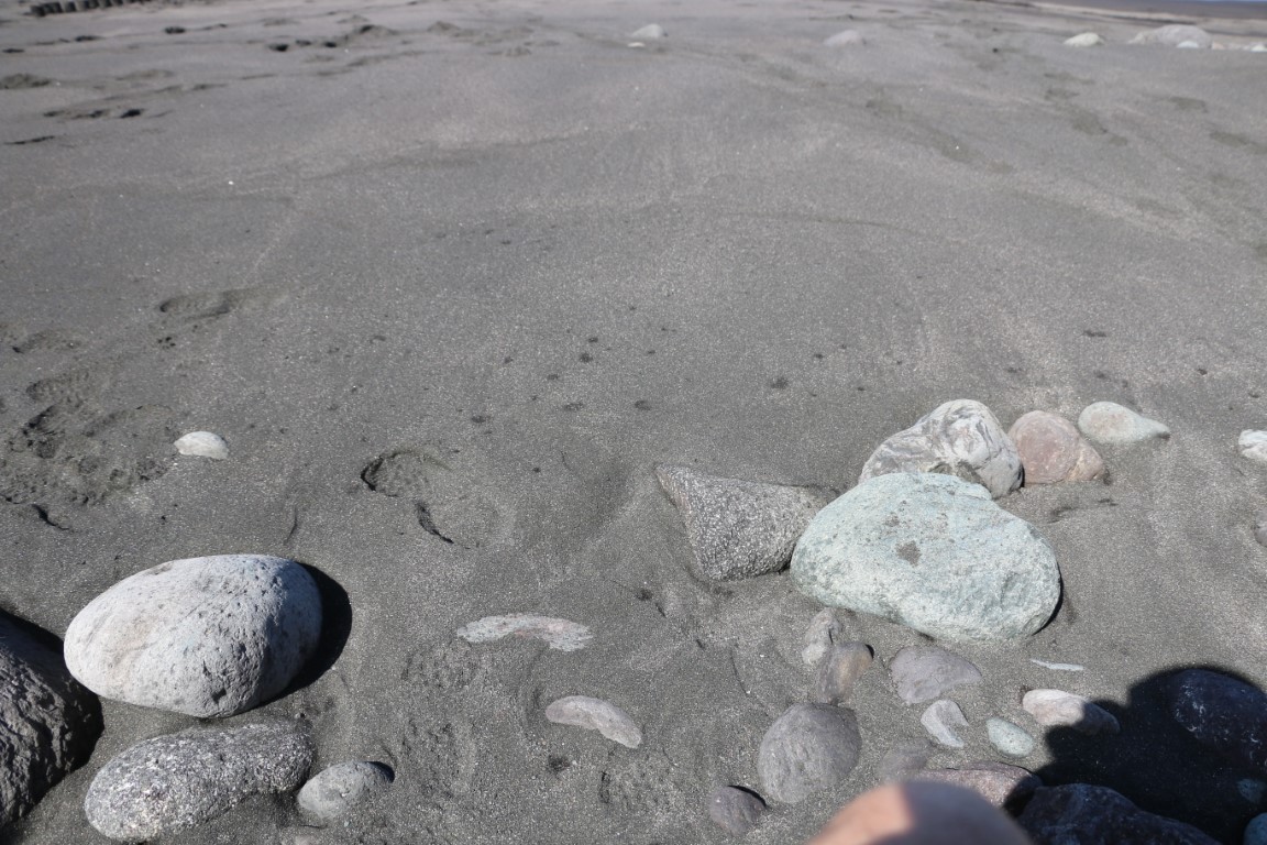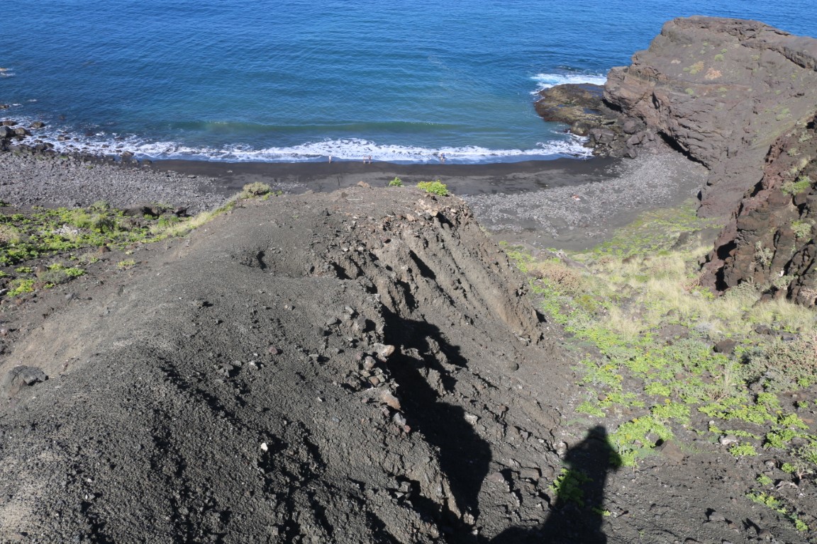 Unten erwartet und ein schwarzer Sandstrand mit recht hohen Wellen. Keiner badet, Karin auch nicht. So machen wir nur eine Vesper auf den Steinen sitzend und freuen uns an den tollen Wellen.