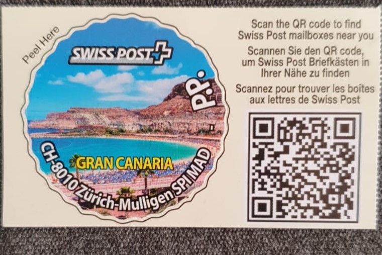 Karte geschrieben und dann: Briefmarke aufkleben. Doch was ist das? Eine runde Marke, ein QR-Code und die „Bedienungsanleitung“ mit dem QR-Code den nächsten Swiss-Post-Kasten zu finden! Äh…. Sind wir nicht hier in Spanien? Meinetwegen auch spezieller auf den Kanaren? Und so zeigt die Seite, die man mit dem QR-Code erreicht auch nur schöne Canaria-Fotos. Keine Briefkästen. Erst beim Schreiben dieser Zeilen entdecke ich, dass oben der Hinweis kommt, dass man sich eine App runterladen soll… Nur: Funktionieren tut der auch nicht! Der App-Store meldet lapidar: „Es ist ein Fehler aufgetreten.“