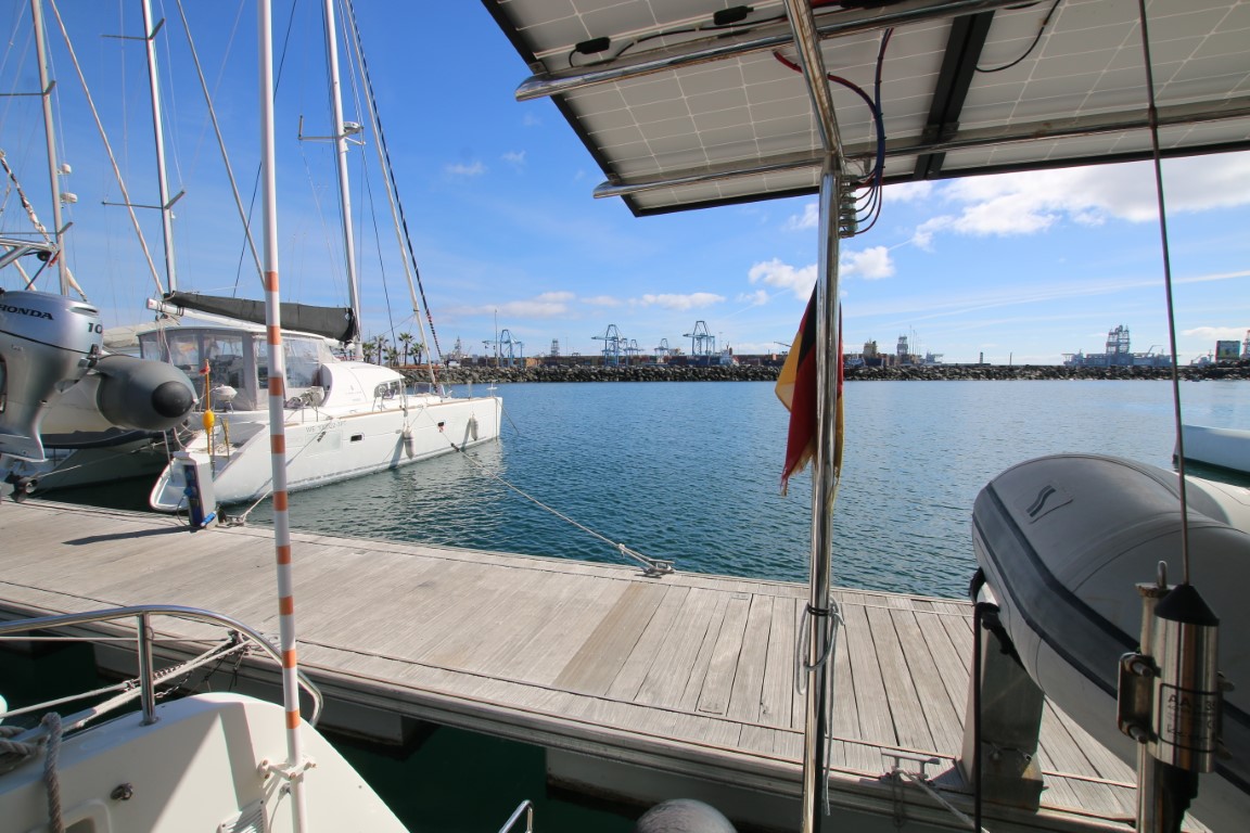 Ansonsten wird jeden Tag eine To-do-Liste aufgestellt und abends dann geschaut, was noch übrig ist. Hauptpunkt heute: Den Großbaum reparieren, der Halter für Reff 1 war ja auf der Fahrt von Madeira hierher gebrochen. Das kostet dann am Ende alles zusammen bald 5 Arbeitsstunden. Und heute das große Finale: Alles fest, alles an seiner Stelle, Groß ist wieder einsetzbar! Hurra!