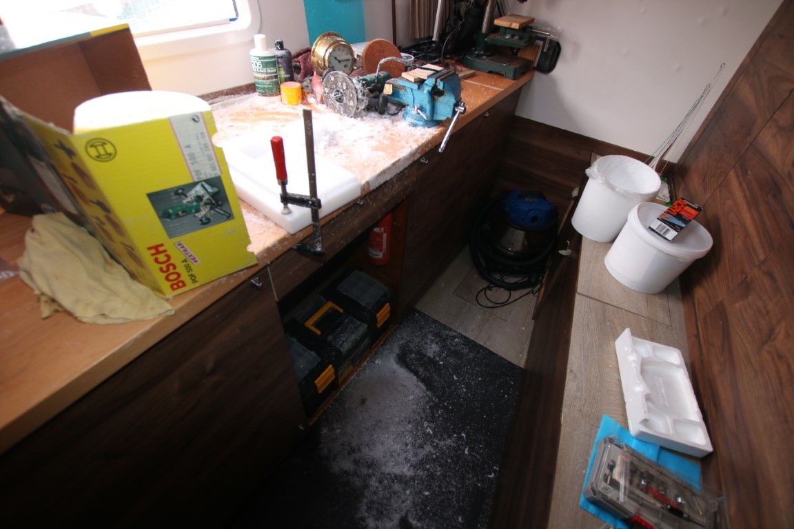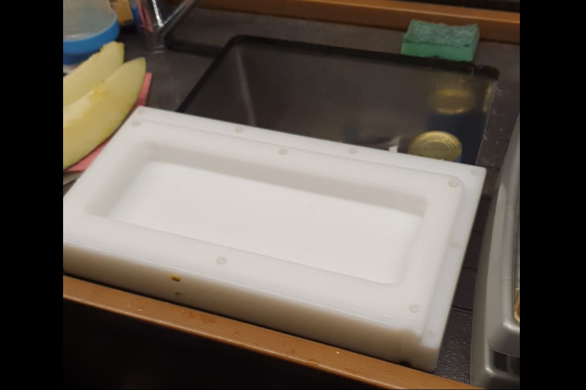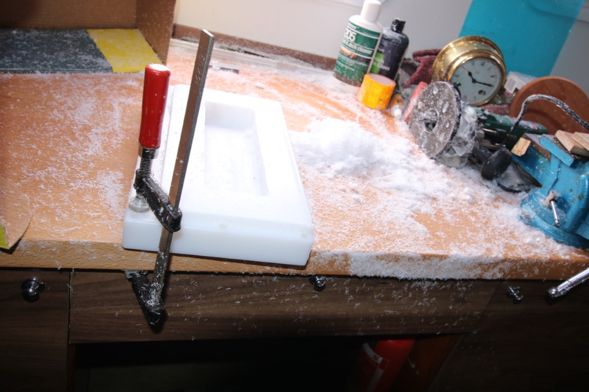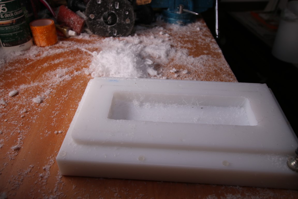 Und es schneit in meiner Werkstatt. Leise singe ich den Song von Reinhard Mey, leicht abgewandelt. Schnee ist es natürlich nicht. Kleine, weiße Plastikspäne fliegen durch die Gegend. Ich fräse aus dem tollen Schneidbrett von Peter von hinten eine Aussparung. Das Ding wiegt über 3 Kilo! Und hat sich damit in der Praxis als zu schwer erwiesen. So wird von unten erst mal Material weggenommen. Am Ende lasse ich noch überall 2 mm stehen, die eigentlich weg sollen. Aber da ich zurzeit alles freihand mache, lasse ich da noch Material, das ich erst wegnehme, wenn ich das mit einer Schablone – Dank an Peter, der mal wieder unbezahlbare Tipps gibt, wie ich das am besten mache – sauber und ordentlich machen kann.