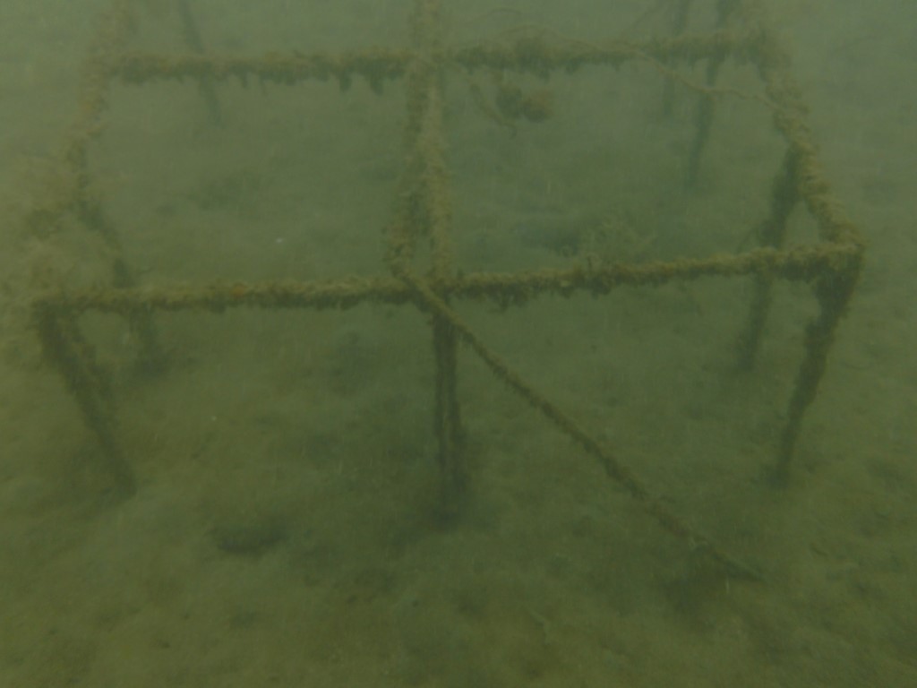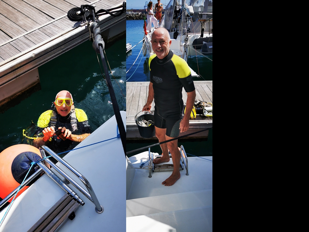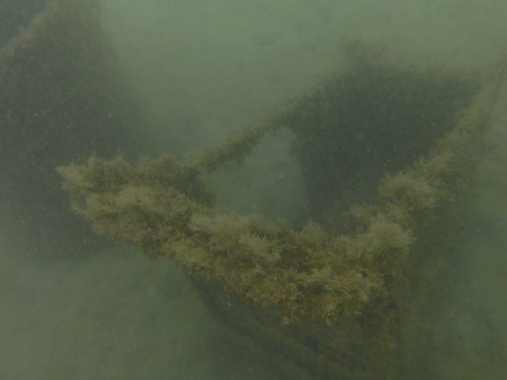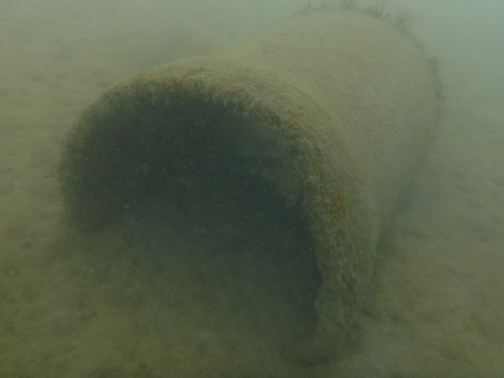 Arnd hat beim Anlegen einen Schraubenzieher außenbords gehen lassen. Eine gute Gelegenheit, sich beliebt zu machen. Bin ich mir doch sicher, dass ich den wieder rausholen kann. Da die Wassertiefe 10 m beträgt und die Stelle, wo er reingefallen ist, nicht so ganz sicher ist, nehme ich die Notflasche zum Tauchen. Und da liegt eine Menge unten. Zunächst finde ich eine Kloschüssel, dann eine Gittergestell, Röhren und Sonstiges. Ganz zum Schluss dann auch den Schraubenzieher. Ha! Wieder ein erfolgreicher Tauchereinsatz!