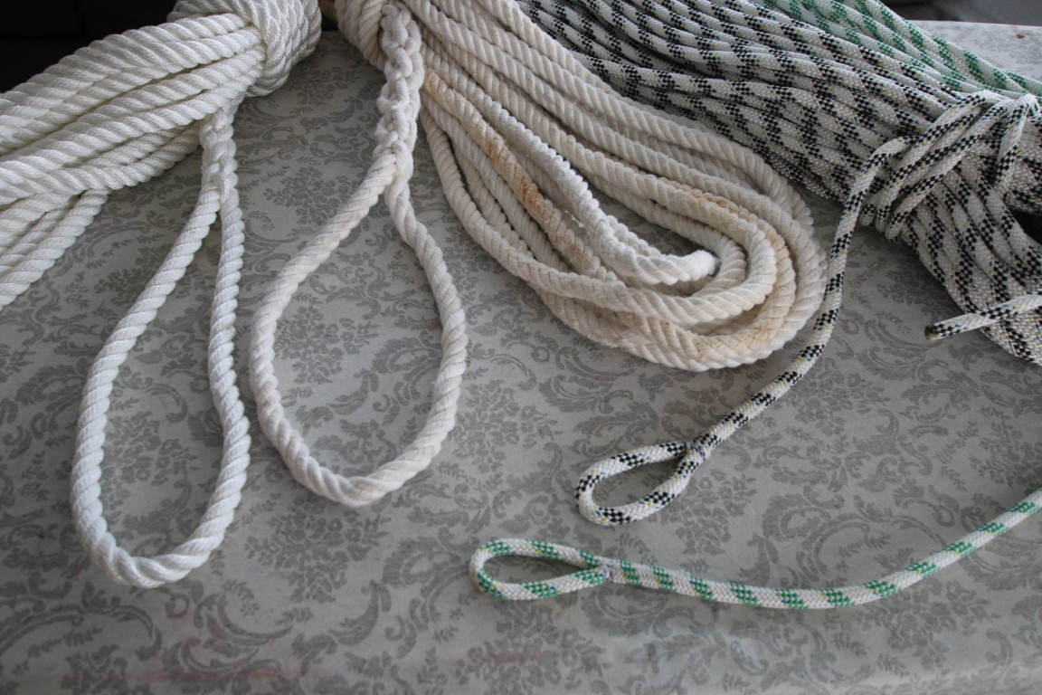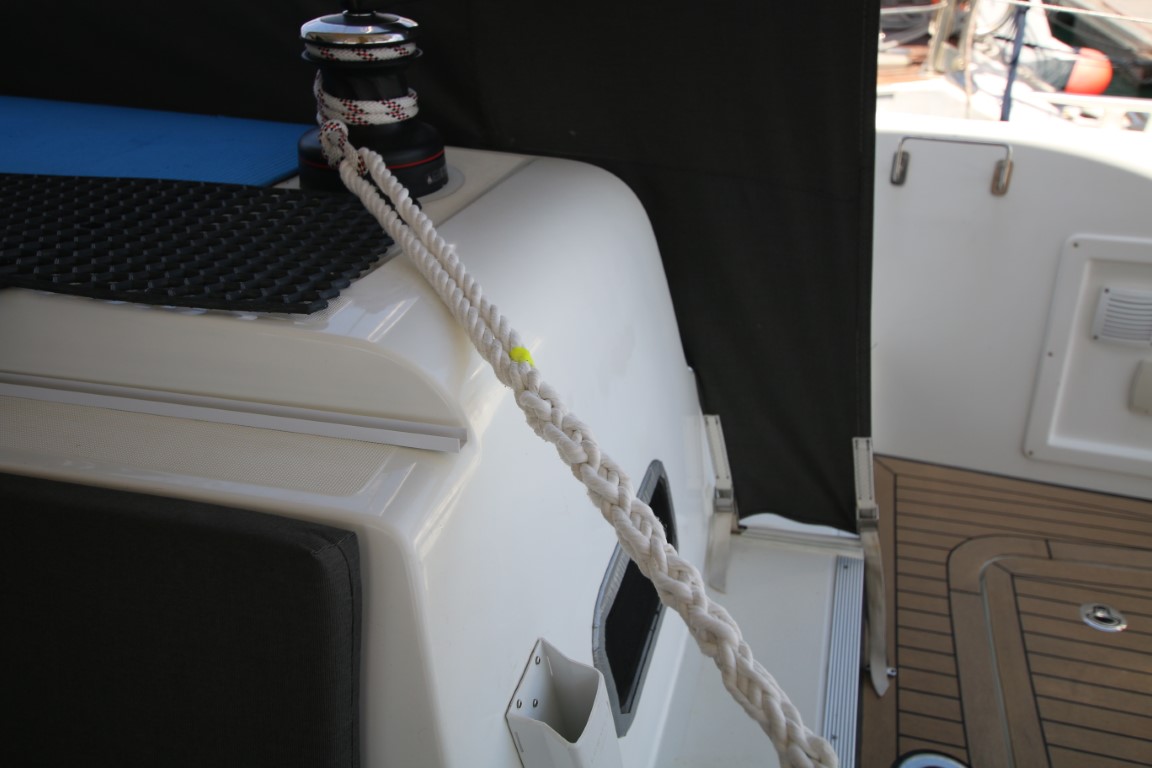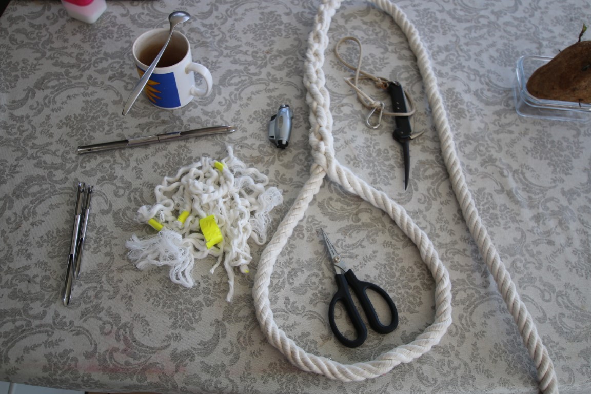 Kern-Mantel-Ösen sind nicht ganz einfach, wenn man es nur so selten macht. Aber ich habe inzwischen eine selbstgeschriebene Anleitung und bei der zweiten Leine schaue ich auch nur noch selten drauf. Am Ende bleibt die erste Belastung mittels Winsch und ein Haufen Abfall…
