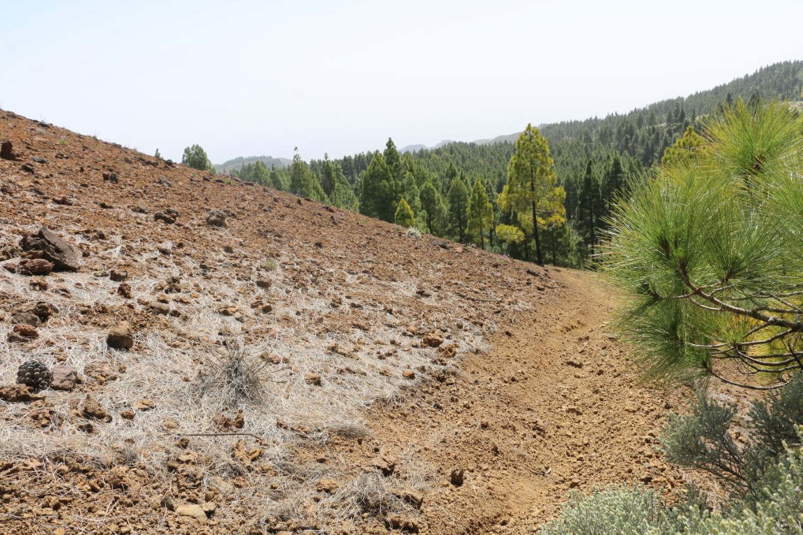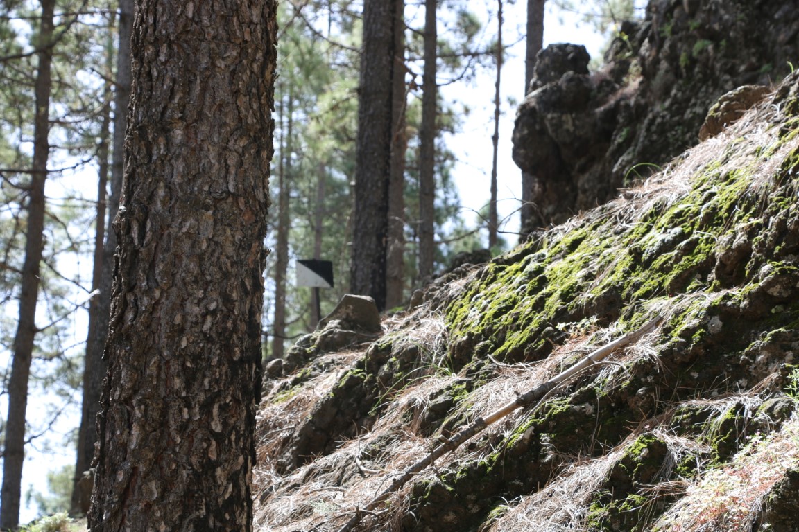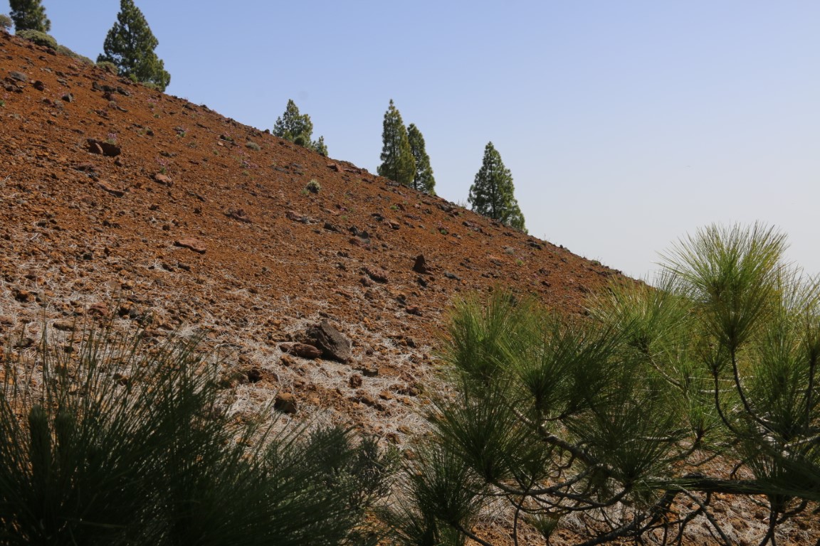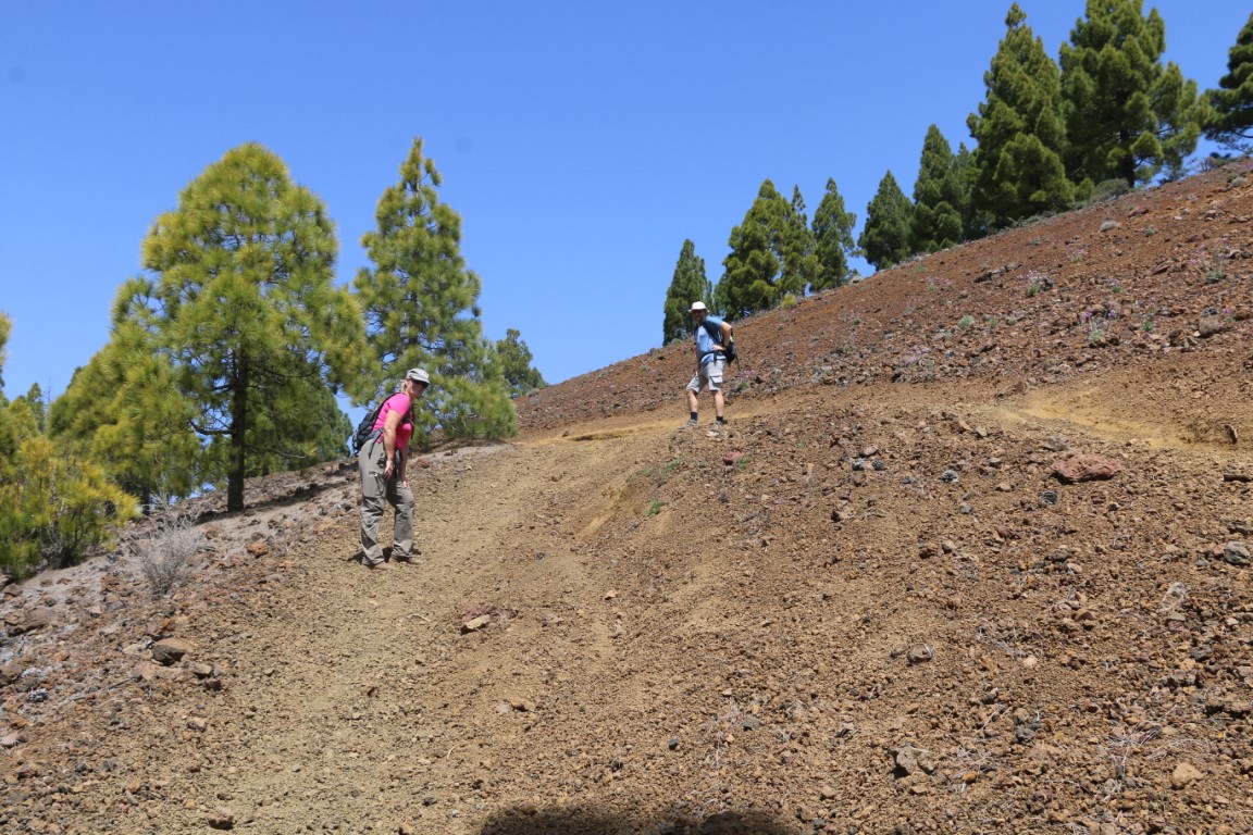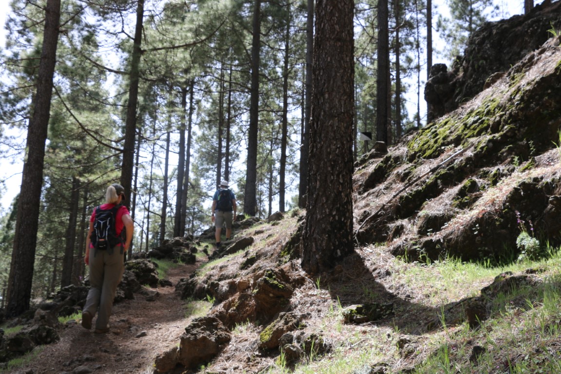 Leise, fast wie Schnee, knirscht es. Wie angepriesen wandern wir durch Lava-Felder. Arnd hat eine wunderbare Tour rausgesucht. Und die KIBO-Crew hat mich mitgenommen. In einen Vulkankrater hinunter, auf der anderen Seite wieder rauf. Dann einen langen Aufstieg teils durch Kiefer-Wälder bis wir dann am Roque Redondo auf über 1800 m ankommen. Eine kleine Rast mit ein wenig Verpflegung. Dann ging es wieder abwärts. Am Ende gab es dann auf dem Parkplatz an einem Stand eine Dose kalten Biers. Herrlich.