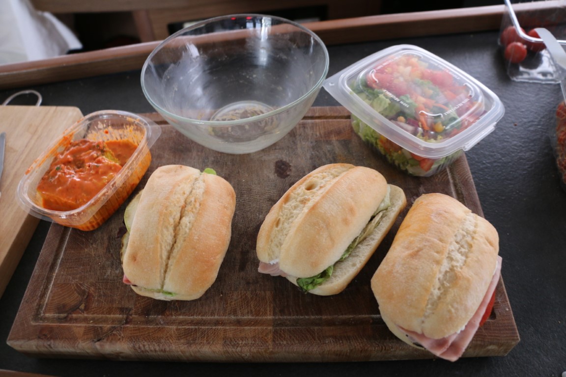 Too-Good-To-Go: Hatte ich ja schon berichtet (2022 10 06 Too good to go). Und da heute die Lust auf irgendwas ziemlich gering, gibt es eben „Überraschung“. 4 kleine, wunderbar belegte Brötchen, 1 kleine Portion Gulasch, 1 gemischter Salat und ein „ich-bin-mir-nicht-sicher-was-und-ob-kalt-oder-warm“, aber lecker! Auf dem Bild fehlt schon ein Brötchen und das Gulasch….