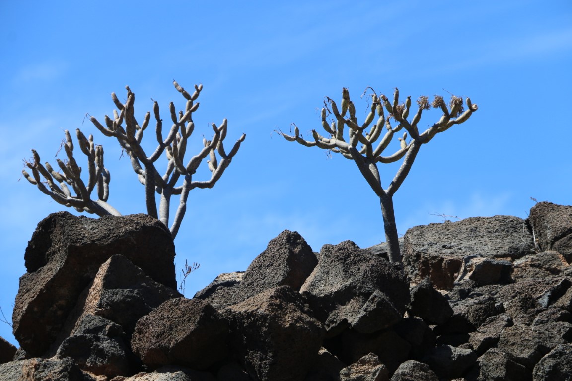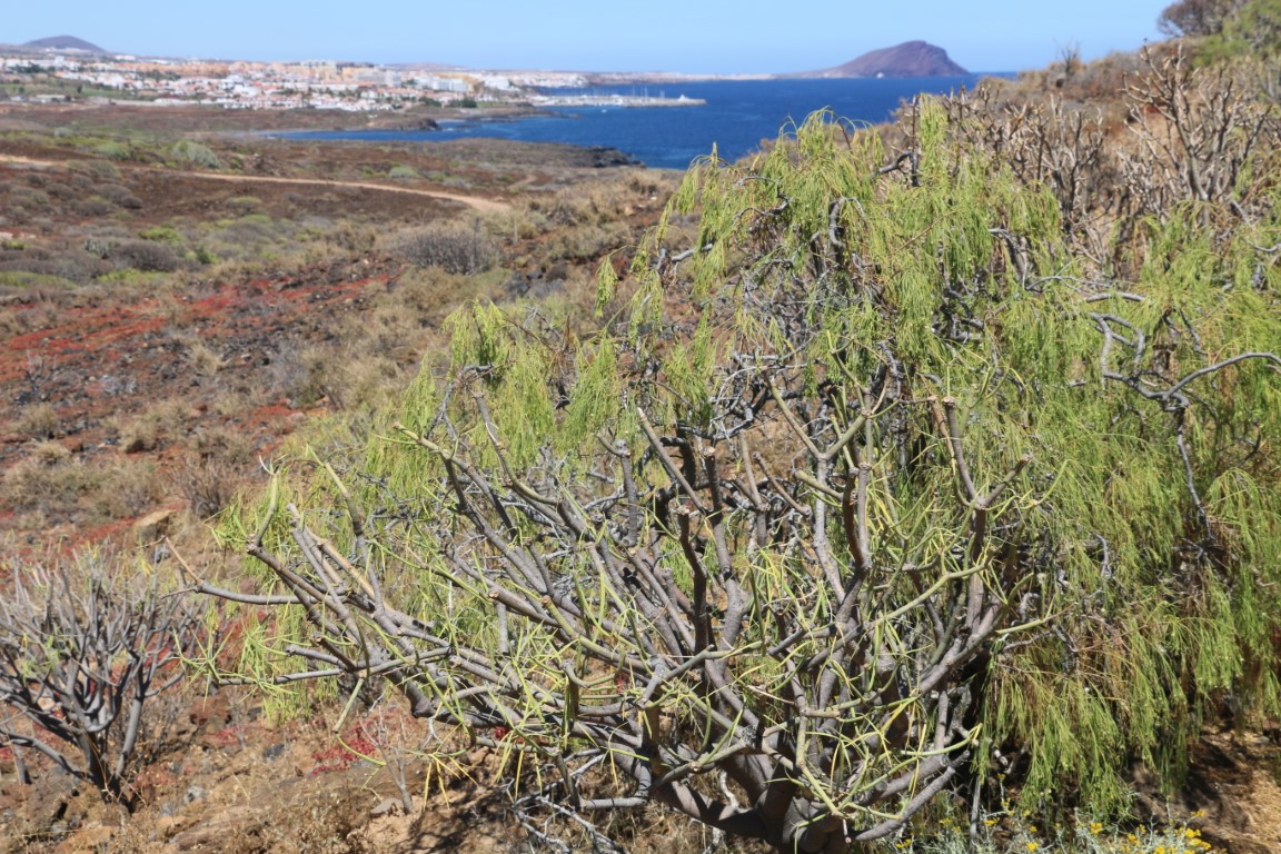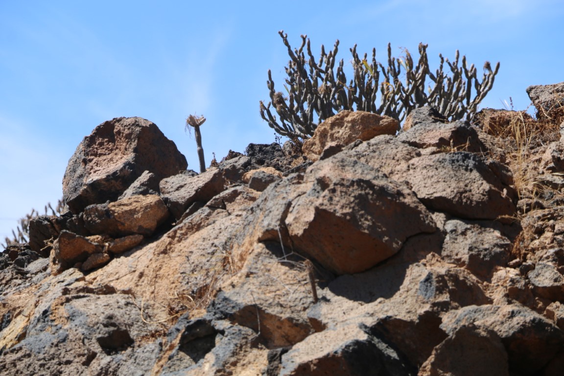 Den Nachmittag verbringen wir mit einer kleinen Wanderung. Nette Aussicht nach Norden nach San Miguel mit der Amarilla Marina. Da hatten wir im Oktober Ulrike und Thomas abgeholt. Das Monumento Natural ist nett, aber Monumento?? Wir erfreuen uns auf der „Bergspitze“ des kühlenden Windes und der ruhigen Natur: Kein anderer Wanderer unterwegs! Bis dann nach einem Fotostopp es plötzlich hinter uns patscht. Quasi aus dem Nichts taucht ein Jogger auf. Entsetzt springen wir zur Seite und machen ihm Platz. Den haben wir nicht kommen gesehen und auch nicht gehört. Und dann war er auch schon auf 2, 3 Meter ran!