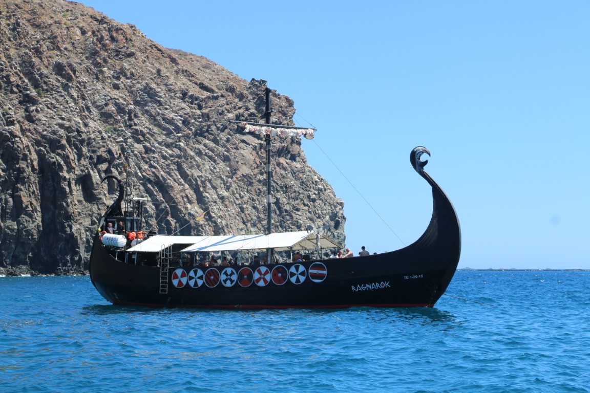 So richtig gut ist der Ankerplatz vor Las Galletas nicht: Es schaukelt. Die Atlantik-Dünung wird nicht wirklich abgehalten. So ziehen wir heute knapp 6 Meilen weiter. In der Hoffnung, dass bei Los Cristianos der Platz ruhiger ist. Der schwache Wind kommt genau gegenan. Und für die kurze Strecke, da lohnt sich die Arbeit des Segelhochziehens nicht. Also unter Motor. Knapp eineinhalb Stunden später sind wir da. Ein Spaßboot – mal kein Katamaran, sondern ein „Wikingerboot“ liegt ziemlich genau an der Stelle, die wir gerne hätten. So ankern wir vor ihm. Aber der Anker trägt nicht gut. Entscheidung: Wenn das Spaßboot abhaut, verlegen wir.