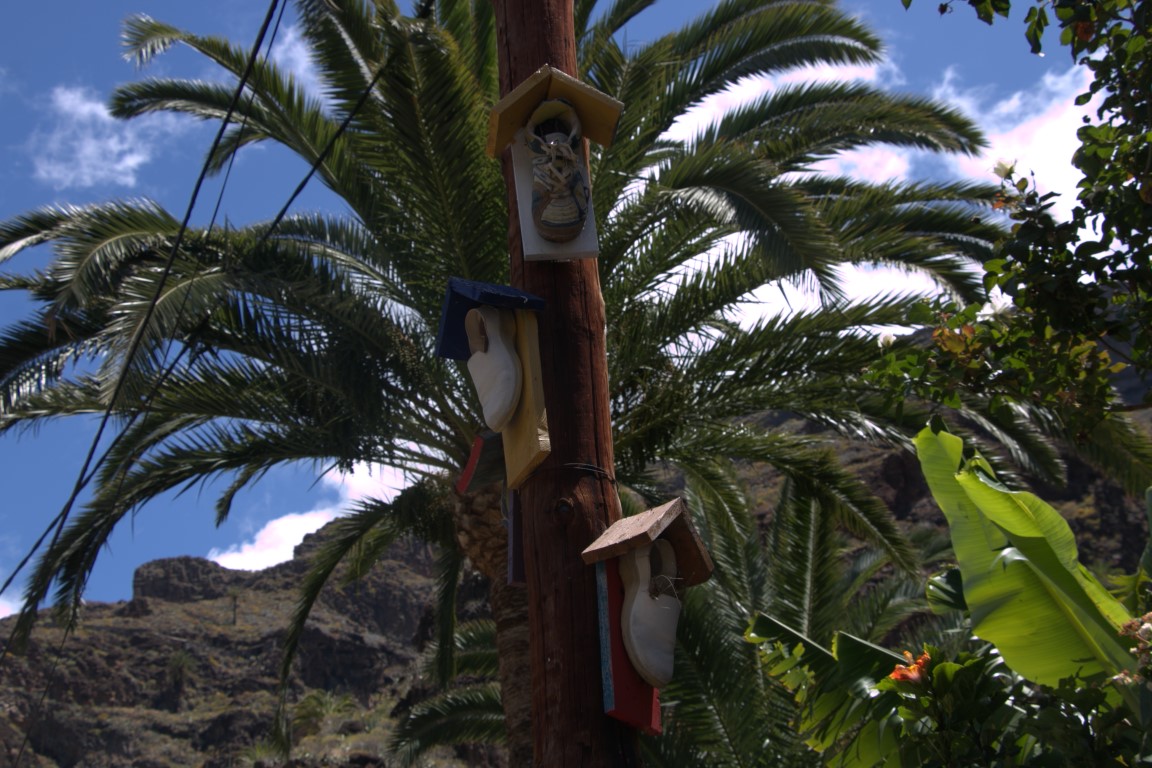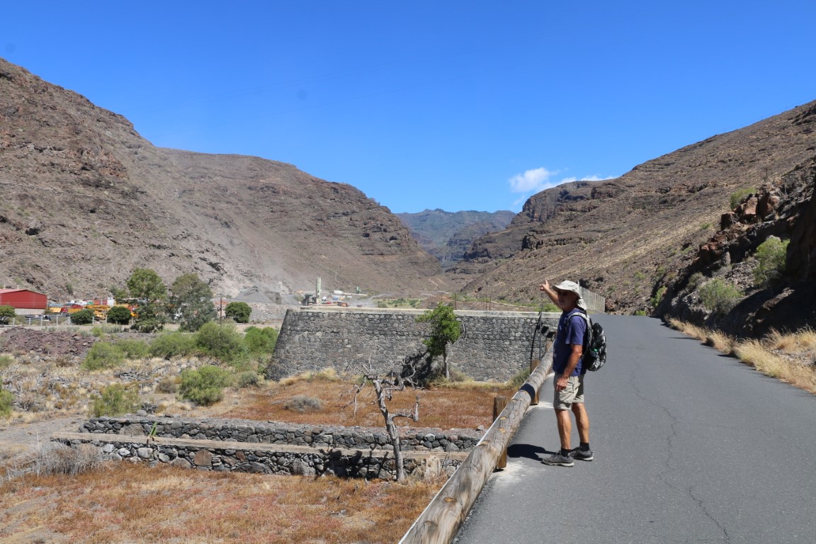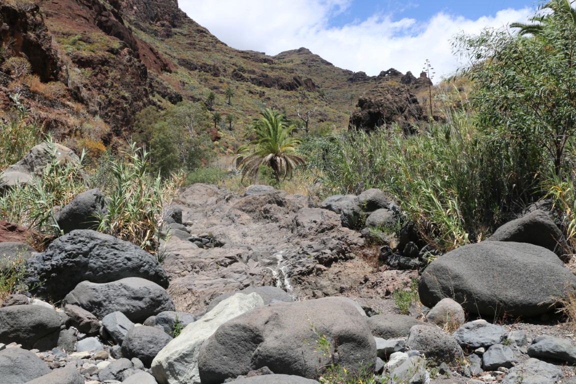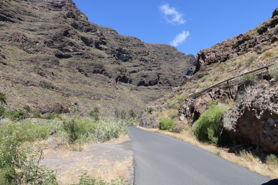 Anna von der SANCARA hatte die App Komoot bei mir eingeführt. Und die wird oft, um nicht zu sagen ständig für Wanderungen benutzt. Und für Playa Santiago hat Komoot eine Schluchtenwanderung vorgeschlagen. Da ich die Hitze des Tages befürchte, schlage ich frühen Start vor. Es wird dann doch nach 10:00 Uhr, bis wir loskommen. Übersetzen in den Hafen – Müll nicht vergessen! Und dann los: Den ersten Teil kennen wir schon. Dann geht es in die Schlucht. Auf einem Teerweg. Das ist super. Man braucht nicht aufzupassen, was die Füße machen, sondern kann das Panorama genießen. Nun – wie befürchtet: Es wird warm. Auf Teer in praller Sonne… So nutzen wir jeden Schatten aus. Und machen manchen Stopp. Natürlich nur, um das Panorama zu genießen und Fotos zu machen…