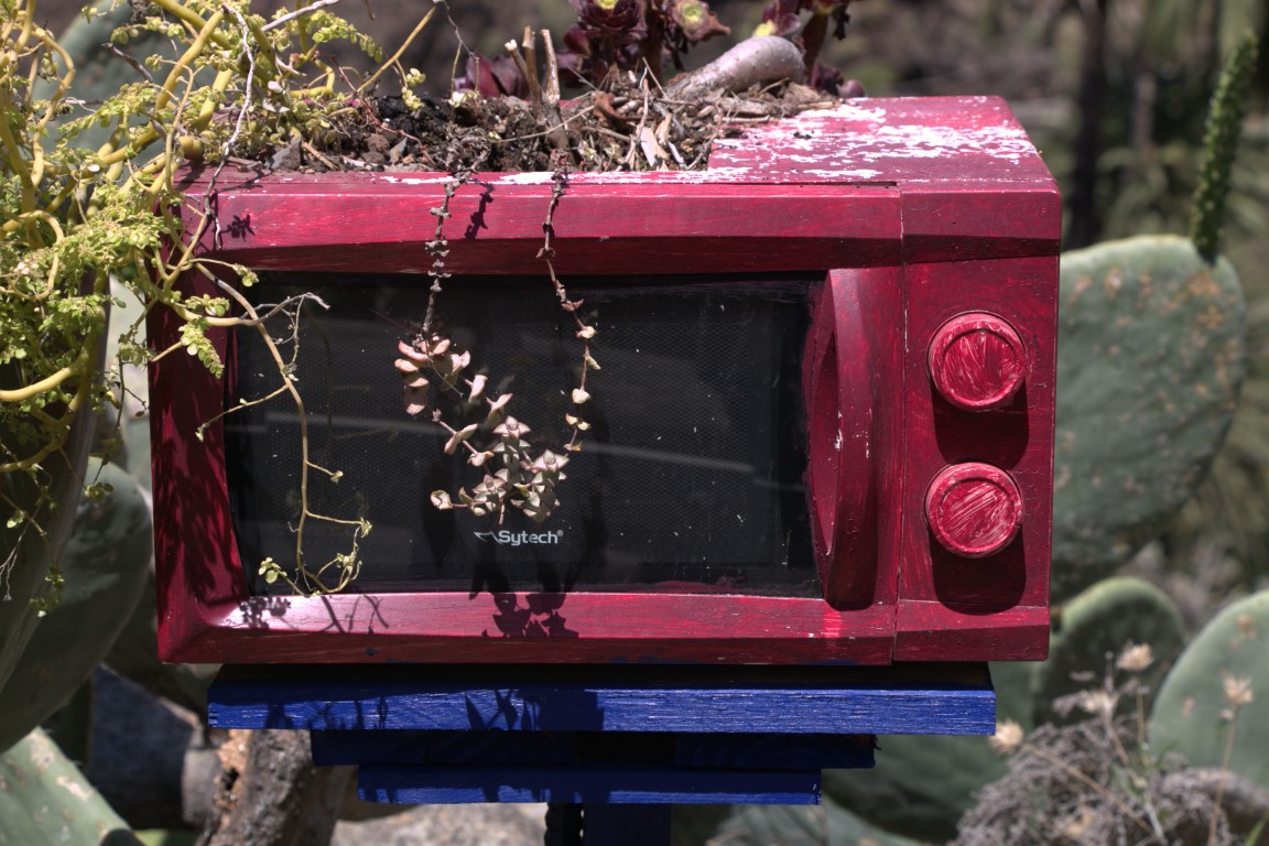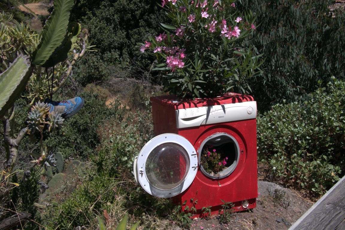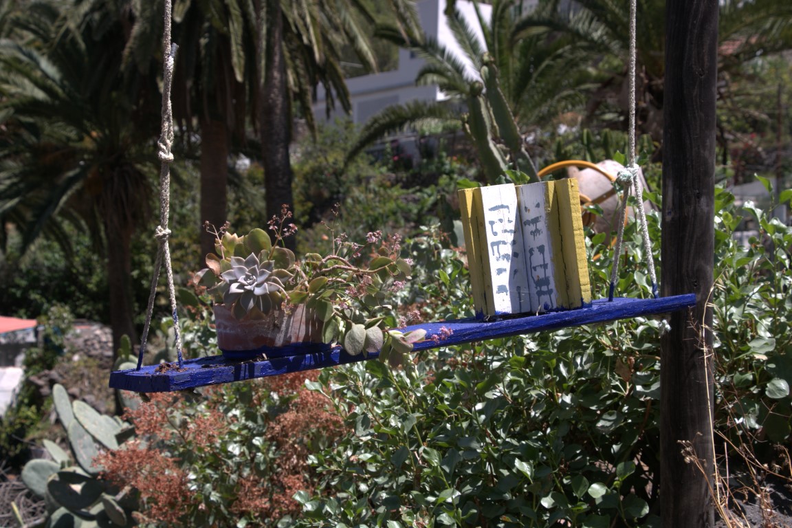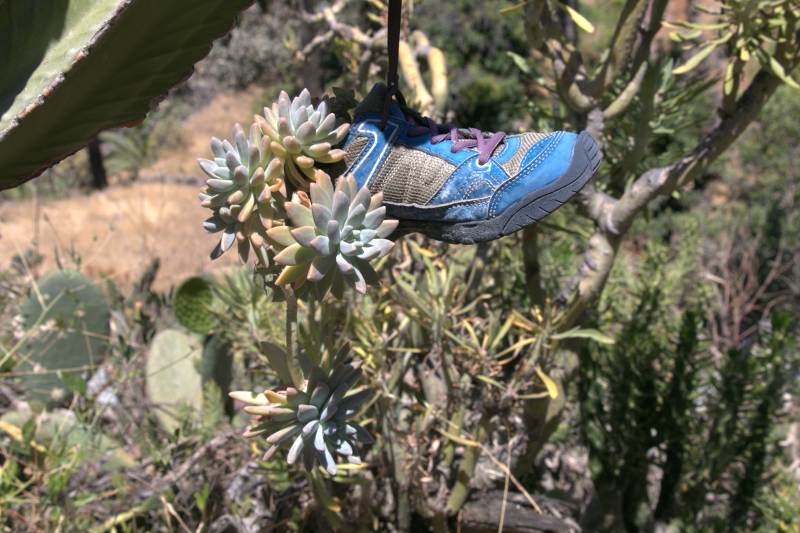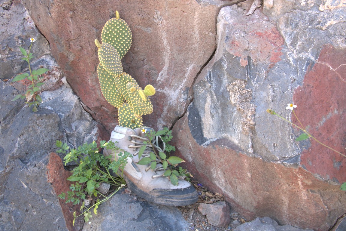 Kurz vor Ende der Teerstraße dann eine „Kunstausstellung“. Nett gemacht. Ist das nun auch schon upcycling? Wenn man Müll nett anmalt, dekoriert oder anders verwertet? Am meisten interessiert mich die Frage, ob die Vögel die „Schuh-Nester“ auch benutzen??? Zumindest eine Reihe von Fotos ist uns das wert.