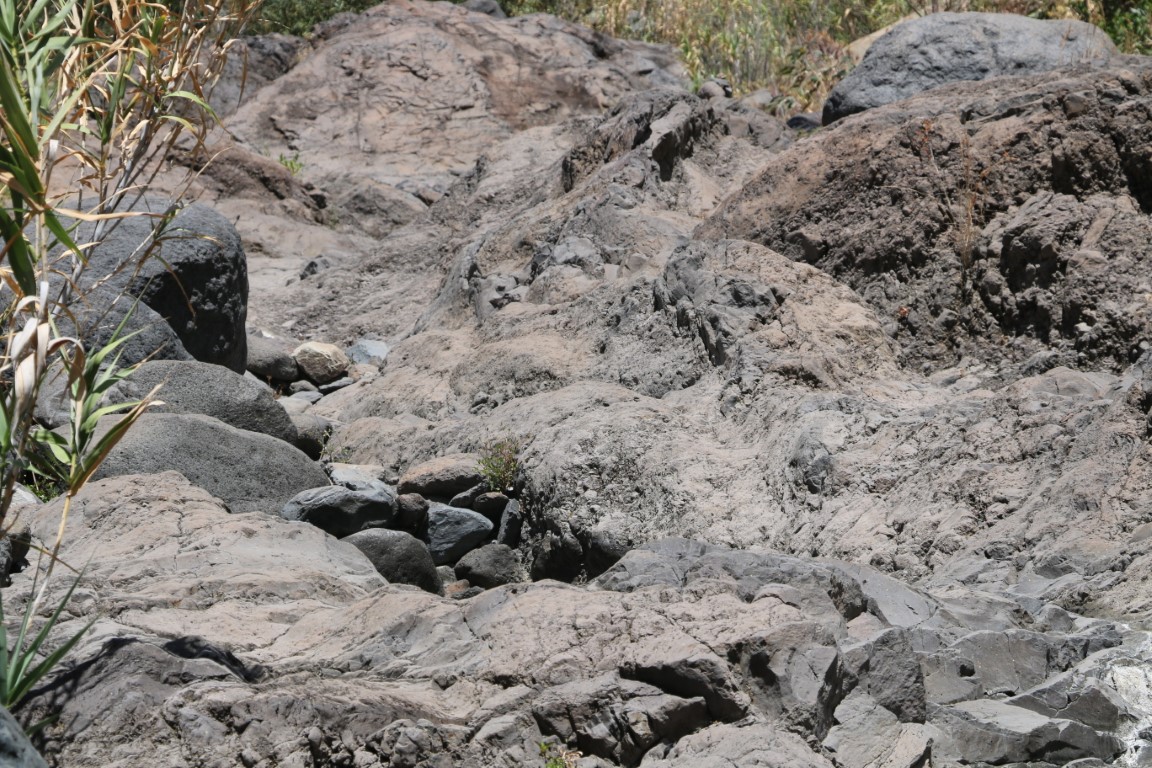 Gleich danach beginnt der „Berg-Wanderweg“. Die ersten Meter denke ich noch: Whow! Ein schmaler, aber gut gepflasterter Weg! Aber dann wird es wilder. Und in einem Flussbett geht es dann nur noch über die Steine. Rechts und links Steilwände, da gibt es nicht viel zu diskutieren, wo den der Weg nun sei. Wärme, Zeit, Entfernung und Höhenmeter führen zu dem Entschluss: Umkehren.