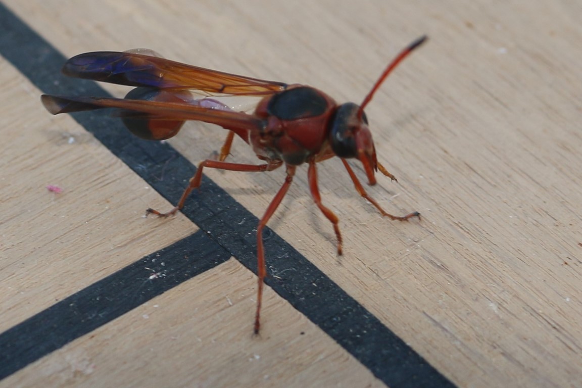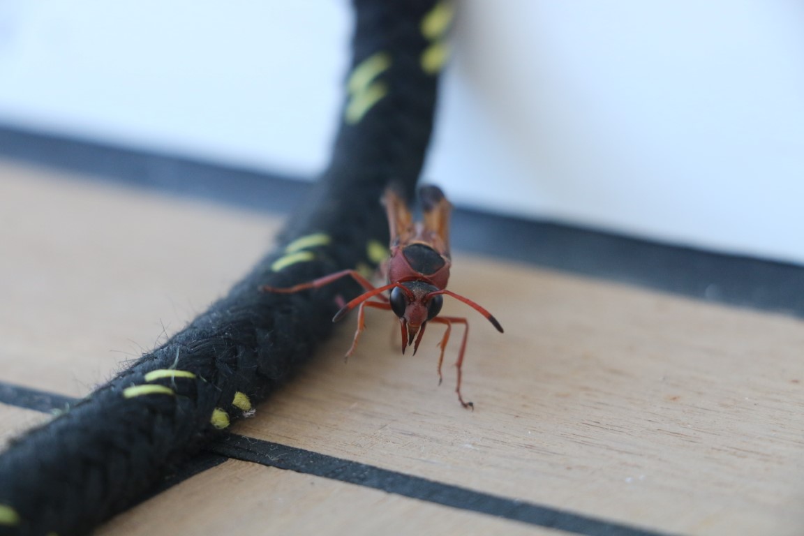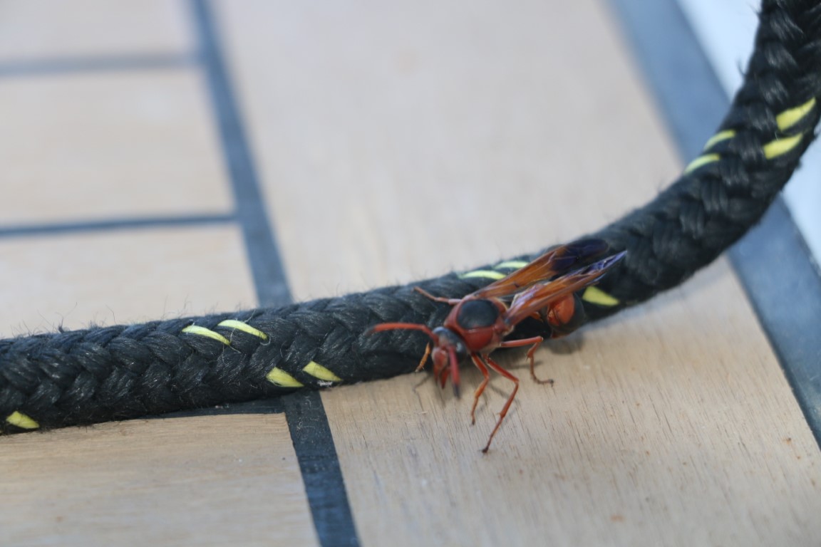 Abends dann hoher Besuch: Eine „Belonogaster“, eine Nadel-Wespe landet auf der Terrasse. Ist wohl recht müde, denn sie lässt eine längere Fotosession und anschließend auch eine Verlegung zur Rettungsinsel geduldig über sich ergehen. Das sind dann auch die Fotos des Tages!